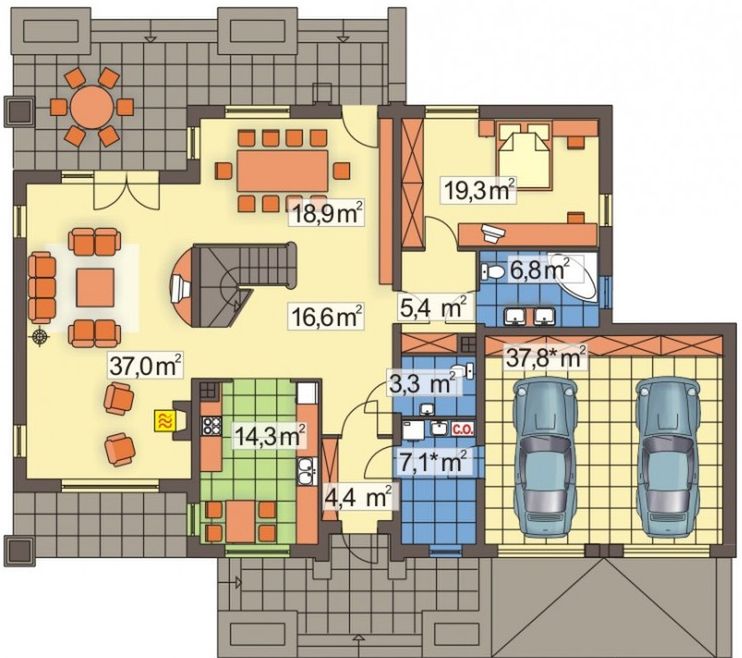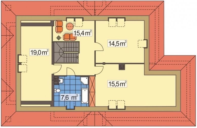 Graficzne opracowanie rzutów poglądowych widocznych na karcie projektu zostało wykonane przez Extradom.pl. Prezentowane przez Extradom.pl wizualizacje wykonane zostały przez autora projektu i należy poczytywać je jedynie za przykład i propozycję wykończenia, wizję architektoniczną autora projektu. Ostateczne wykończenie budynku może nastąpić na wiele sposobów. Szczegółowe rozwiązania zastosowane w oferowanej dokumentacji - w tym również ilość, lokalizacje i wygląd okien, drzwi, kominów - mogą w niewielkim stopniu różnić się od prezentowanej wizualizacji budynku.