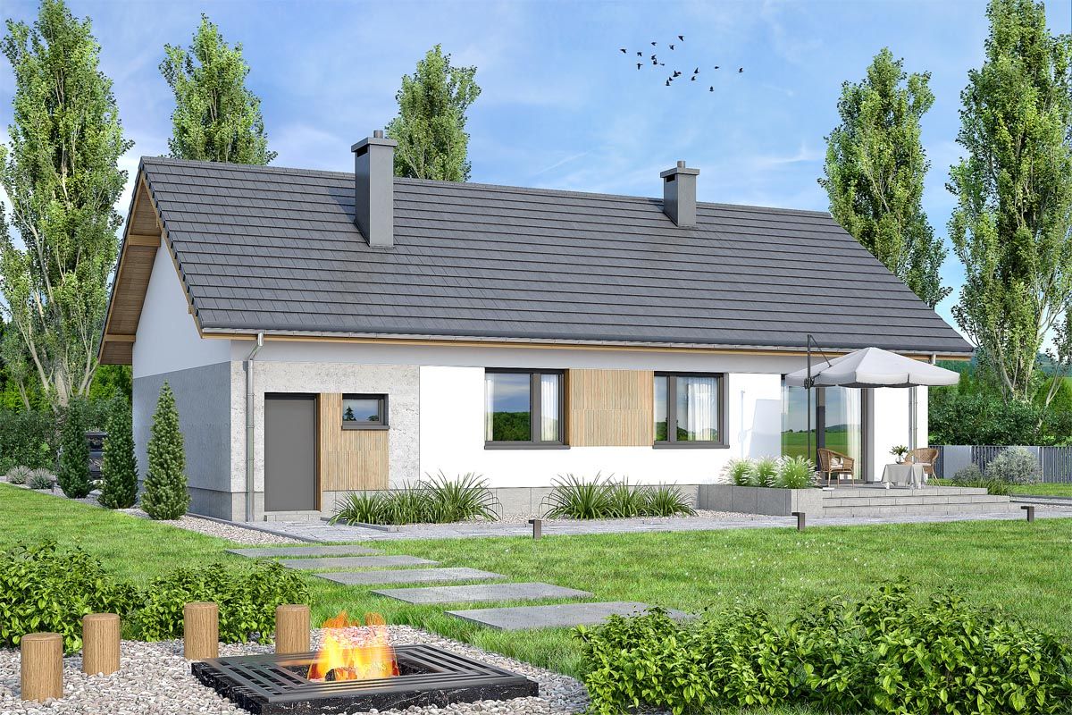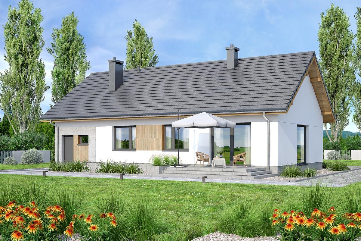 Graficzne opracowanie rzutów poglądowych widocznych na karcie projektu zostało wykonane przez Extradom.pl. Prezentowane przez Extradom.pl wizualizacje wykonane zostały przez autora projektu i należy poczytywać je jedynie za przykład i propozycję wykończenia, wizję architektoniczną autora projektu. Ostateczne wykończenie budynku może nastąpić na wiele sposobów. Szczegółowe rozwiązania zastosowane w oferowanej dokumentacji - w tym również ilość, lokalizacje i wygląd okien, drzwi, kominów - mogą w niewielkim stopniu różnić się od prezentowanej wizualizacji budynku.