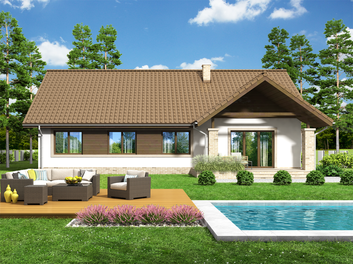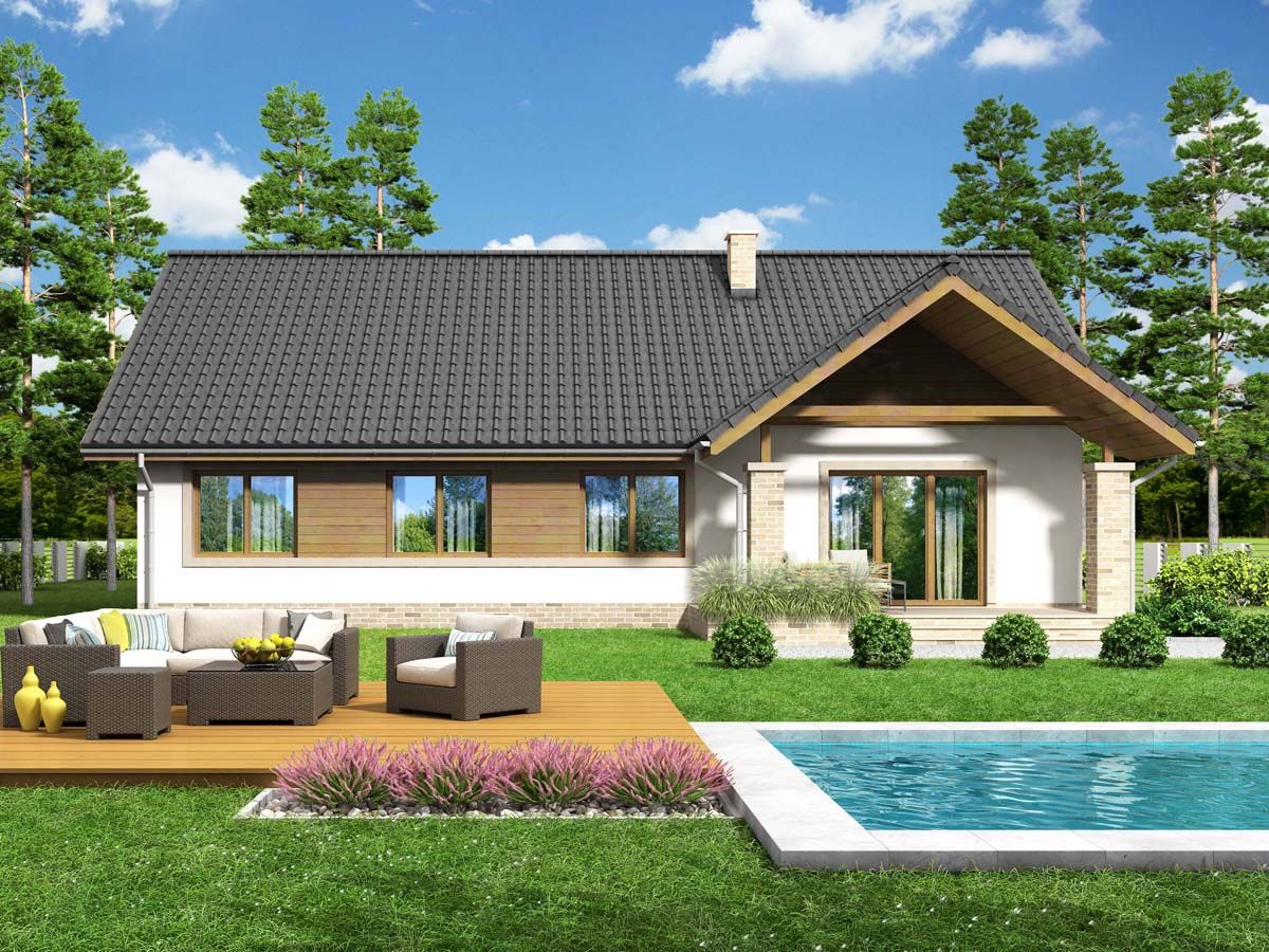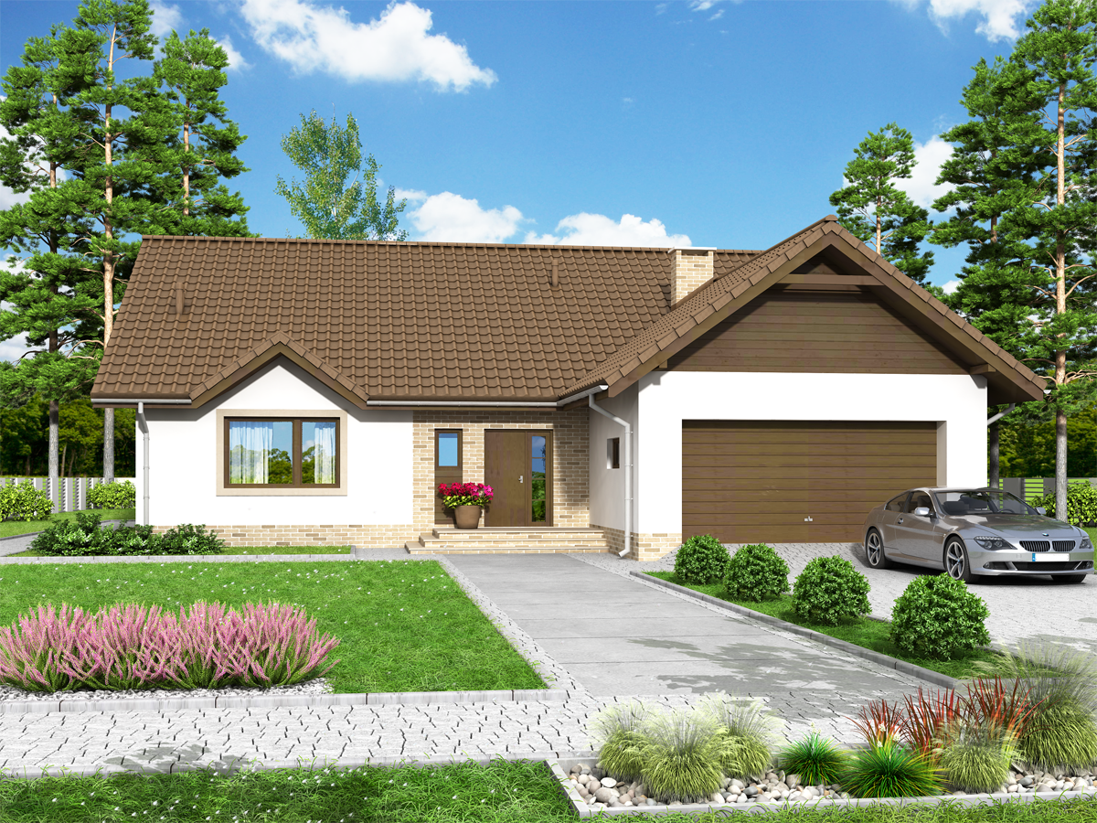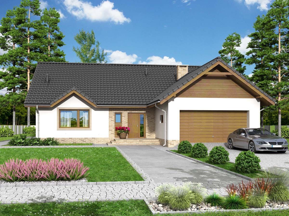 Projekt Mokka 9 to propozycja parterowego domu w tradycyjnym stylu, idealna dla trzy- lub czteroosobowej rodziny. Oferuje funkcjonalnie rozplanowaną przestrzeń na jednym poziomie z dwustanowiskowym garażem, zapewniając komfort codziennego życia i klarowny podział na strefy.