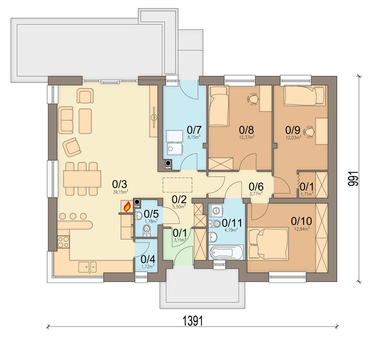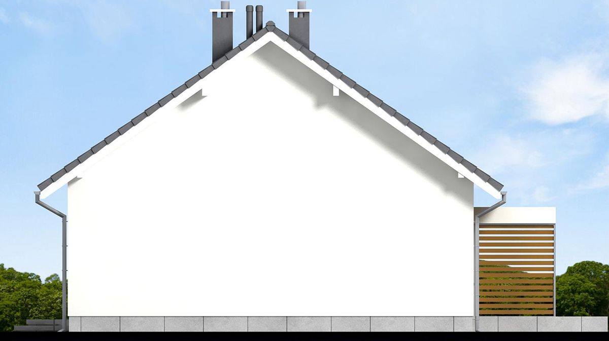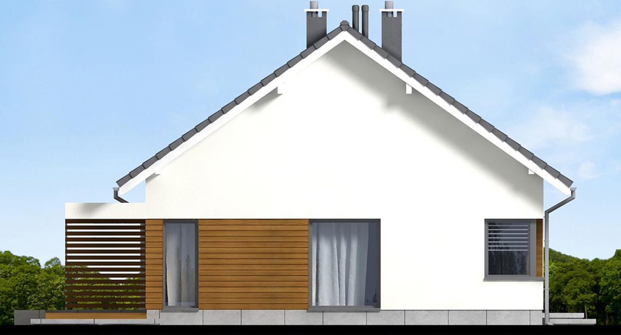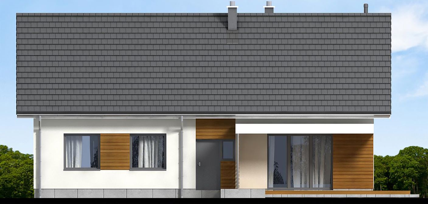 Graficzne opracowanie rzutów poglądowych widocznych na karcie projektu zostało wykonane przez Extradom.pl. Prezentowane przez Extradom.pl wizualizacje wykonane zostały przez autora projektu i należy poczytywać je jedynie za przykład i propozycję wykończenia, wizję architektoniczną autora projektu. Ostateczne wykończenie budynku może nastąpić na wiele sposobów. Szczegółowe rozwiązania zastosowane w oferowanej dokumentacji - w tym również ilość, lokalizacje i wygląd okien, drzwi, kominów - mogą w niewielkim stopniu różnić się od prezentowanej wizualizacji budynku.
