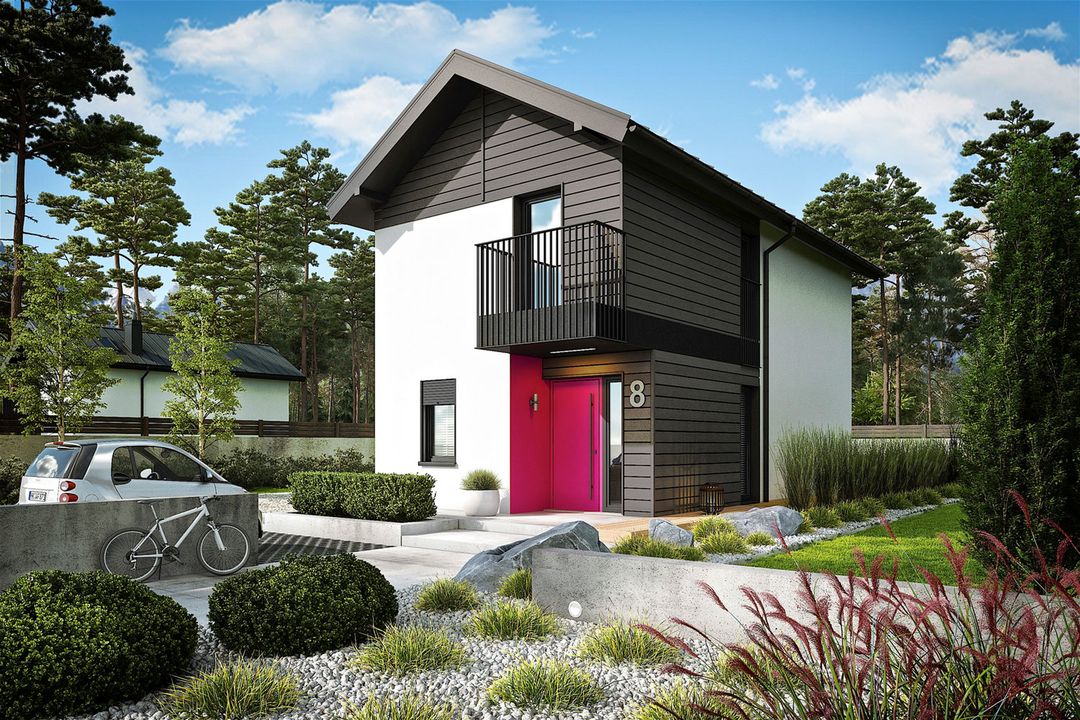 Ściany zewnętrzne: murowane, dwuwarstwowe, beton komórkowy firmy H+H 24 cm, ocieplenie styropian Termo Organika 20 cm. Ściany wewnętrzne: nośne i działowe murowane, beton komórkowy firmy H+H 24 cm i 11,5 cm. Strop: nad parterem - strop gęstożebrowy Teriva, nad piętrem - elementy drewnianej więźby dachowej stanowią konstrukcję, ocieplenie wełna mineralna Isover 30 cm; możliwość wykonania sufitów podwieszonych i zamontowania kanałów wentylacji mechanicznej. Dach: konstrukcja drewniana, blacha stalowa na rąbek stojący, więźba dachowa dostępna również w systemie prefabrykacji drewnianej. Inne: schody wewnętrzne drewniane. Ogrzewanie: kocioł gazowy kondensacyjny firmy Viessmann, rozprowadzenie ciepła: grzejniki firmy Purmo. Wentylacja: grawitacyjna. OZE: kolektory słoneczne firmy Viessmann. Dodatkowo: stacja uzdatniania wody firmy Viessmann. Elewacje: tynk cienkowarstwowy mineralny w kolorze białym TO-PA001, magenta TO-MA003 i grafitowy TO-GY015 z palety firmy Termo Organika, okładzina - system elewacji wentylowanej: deski włóknocementowe Cedral w kolorze grafitowym C54. Stolarka: drewniana, PVC lub aluminiowa, drzwi tarasowe podnoszono-przesuwne typu HS aluminiowo-drewniane Innoview firmy Fakro, rolety zewnętrzne w systemie QuadBox firmy BeClever, drzwi wejściowe firmy Hörmann. Okna połaciowe: rozwiązania technologiczne i wyłaz dachowy firmy Fakro. Otoczenie: kostka betonowa i płyty tarasowe firmy Libet, system tarasowy ProDeck - deska kompozytowa Terra w kolorze kasztan.
