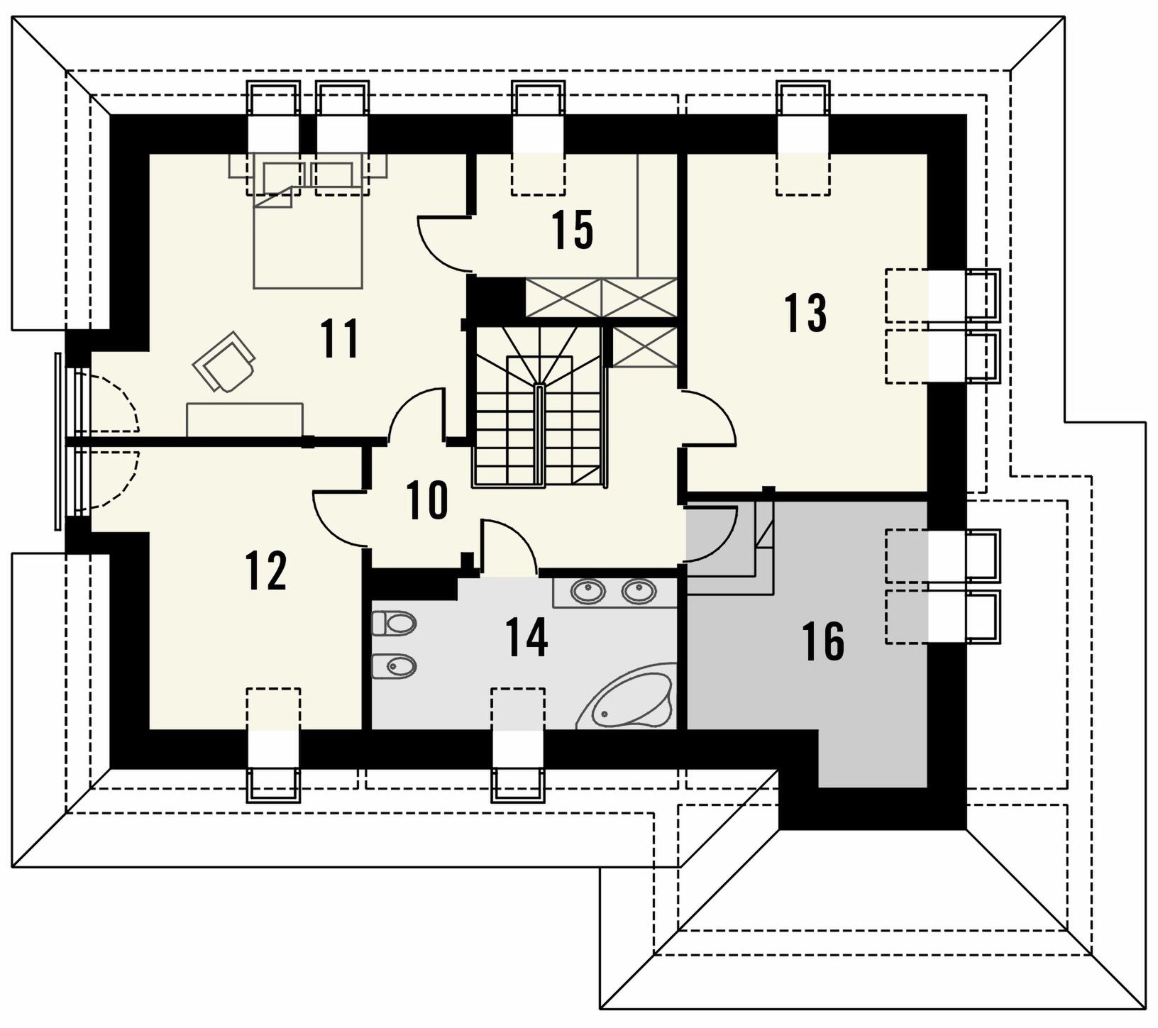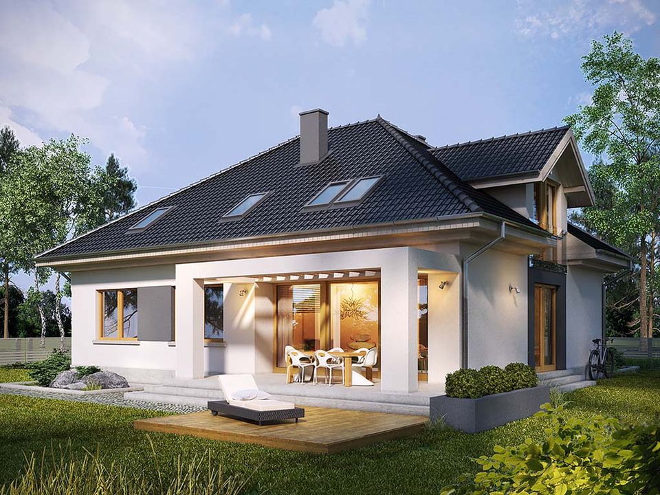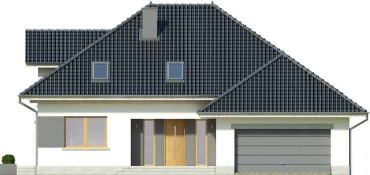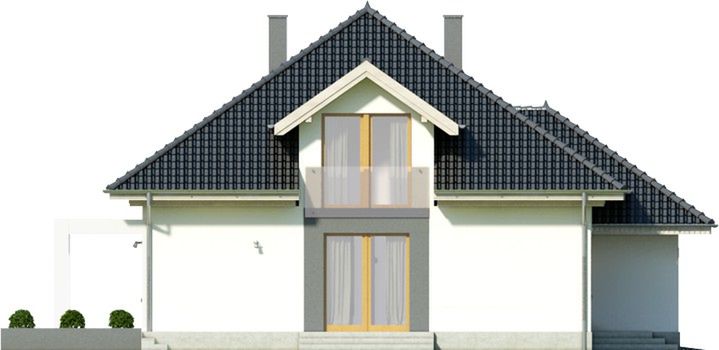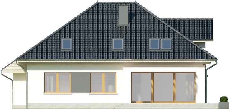 Graficzne opracowanie rzutów poglądowych widocznych na karcie projektu zostało wykonane przez Extradom.pl. Prezentowane przez Extradom.pl wizualizacje wykonane zostały przez autora projektu i należy poczytywać je jedynie za przykład i propozycję wykończenia, wizję architektoniczną autora projektu. Ostateczne wykończenie budynku może nastąpić na wiele sposobów. Szczegółowe rozwiązania zastosowane w oferowanej dokumentacji - w tym również ilość, lokalizacje i wygląd okien, drzwi, kominów - mogą w niewielkim stopniu różnić się od prezentowanej wizualizacji budynku.