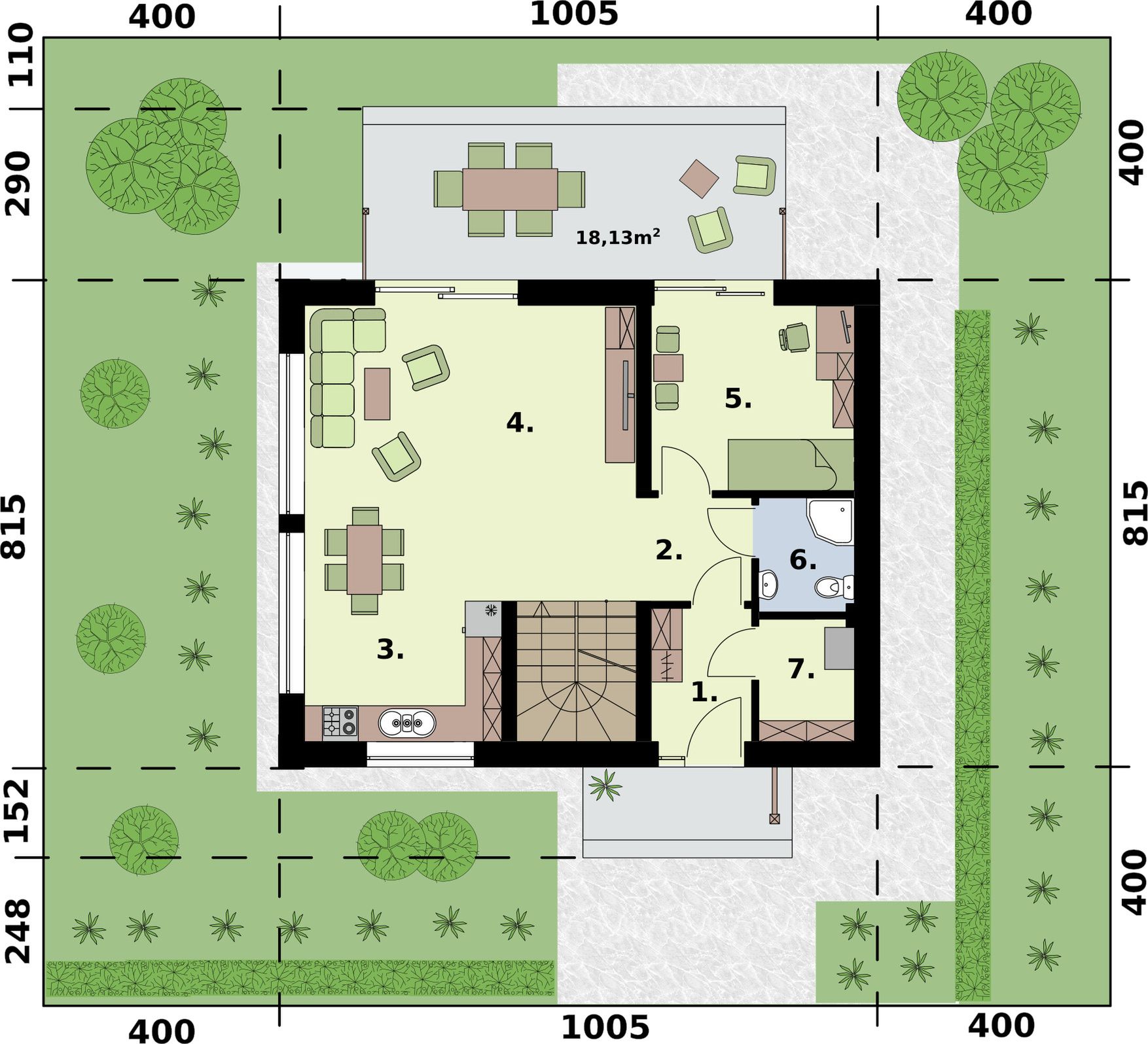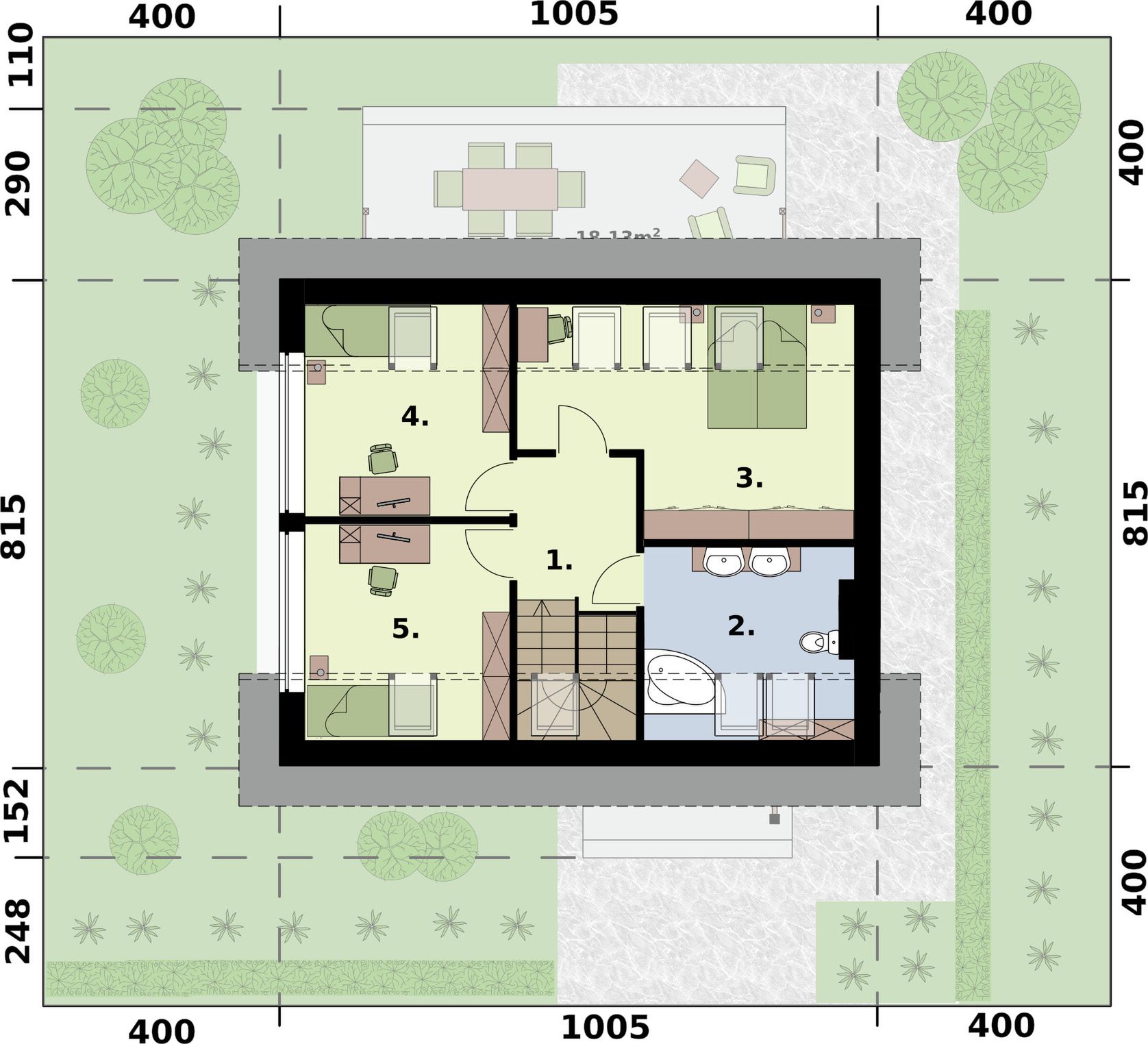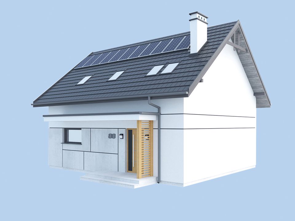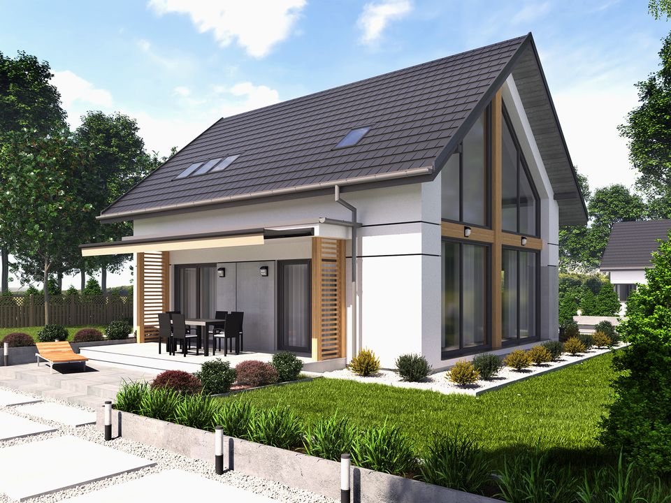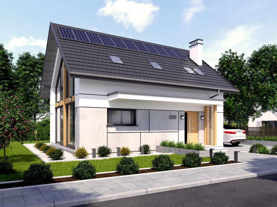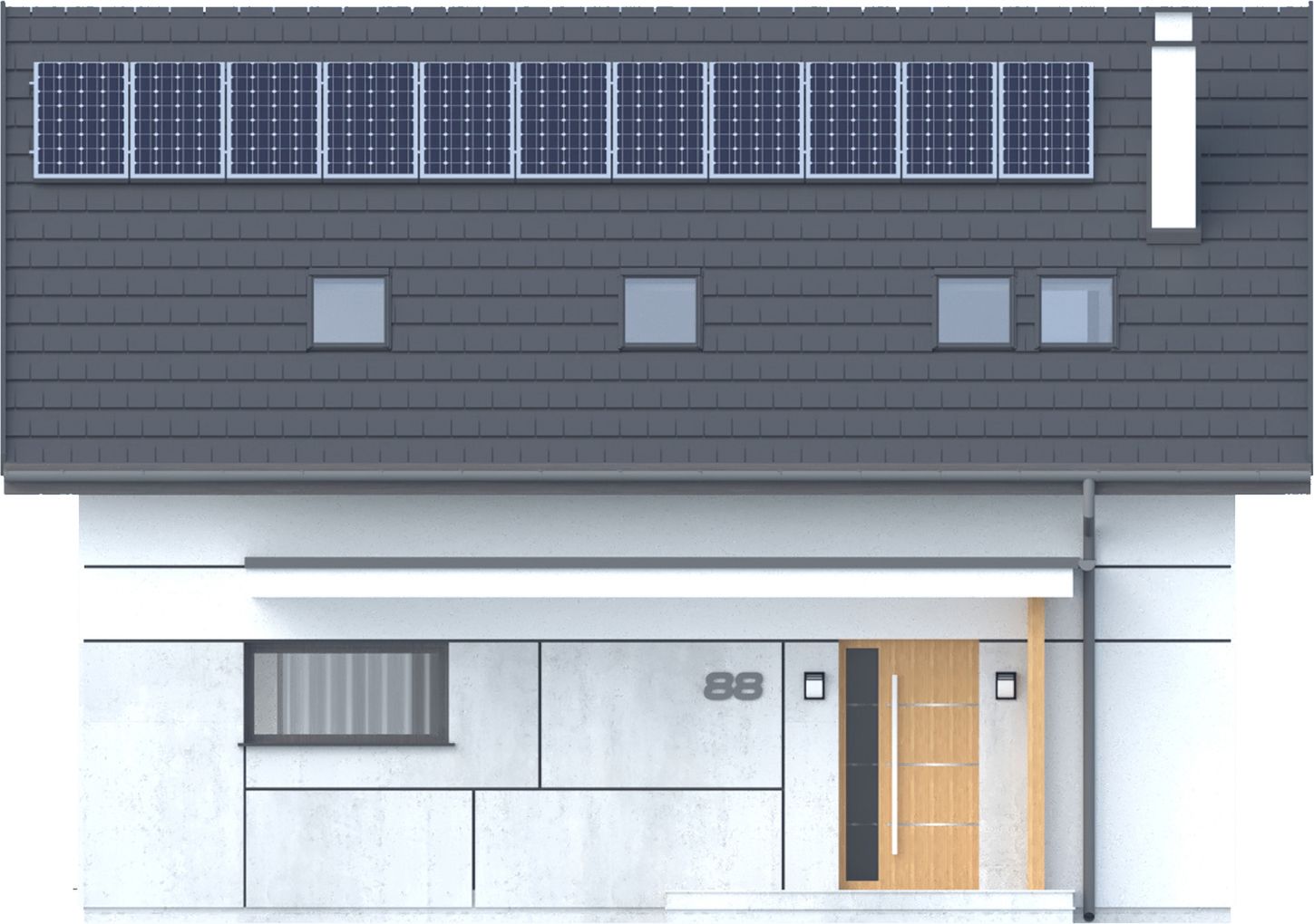 Graficzne opracowanie rzutów poglądowych widocznych na karcie projektu zostało wykonane przez Extradom.pl. Prezentowane przez Extradom.pl wizualizacje wykonane zostały przez autora projektu i należy poczytywać je jedynie za przykład i propozycję wykończenia, wizję architektoniczną autora projektu. Ostateczne wykończenie budynku może nastąpić na wiele sposobów. Szczegółowe rozwiązania zastosowane w oferowanej dokumentacji - w tym również ilość, lokalizacje i wygląd okien, drzwi, kominów - mogą w niewielkim stopniu różnić się od prezentowanej wizualizacji budynku.