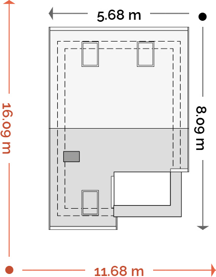 Strop: gęstożebrowy Teriva. Ściany zewnętrzne: gazobeton. Pokrycie dachowe: dachówka. Okna połaciowe: Velux. Fundamentowanie: Ławy fundamentowe.