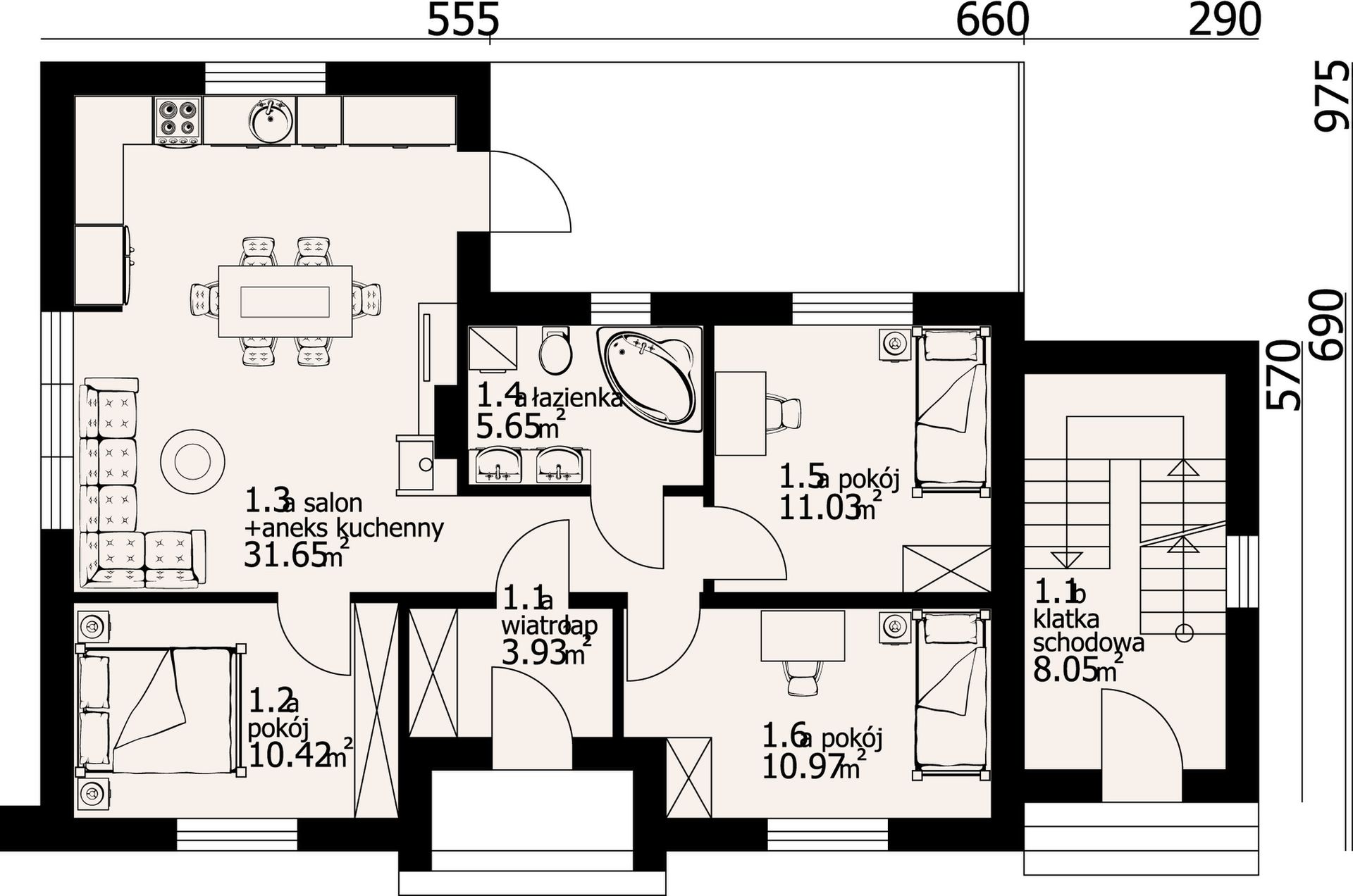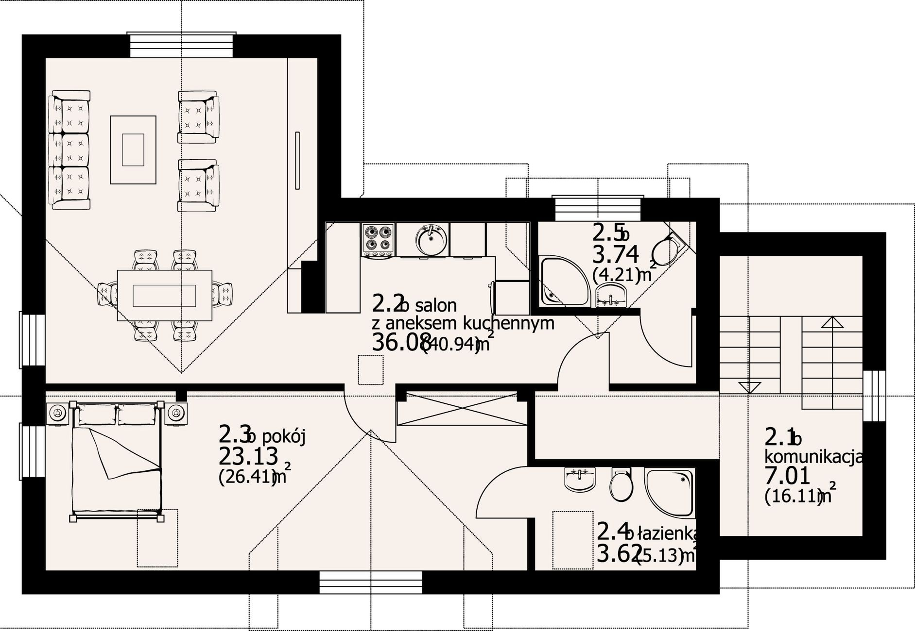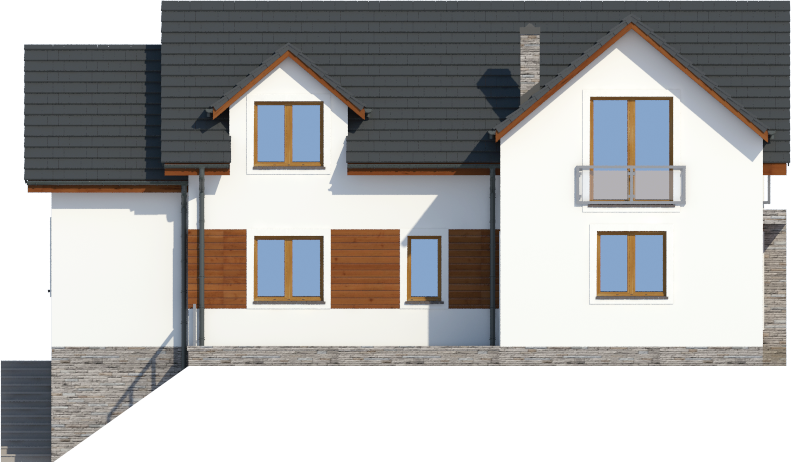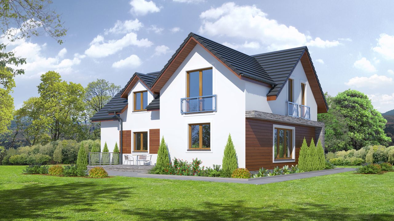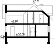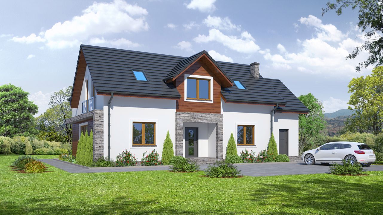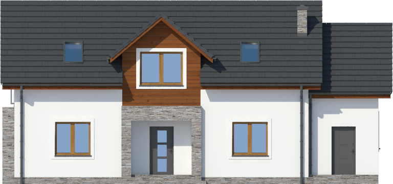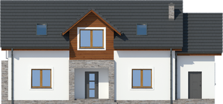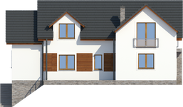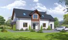 Graficzne opracowanie rzutów poglądowych widocznych na karcie projektu zostało wykonane przez Extradom.pl. Prezentowane przez Extradom.pl wizualizacje wykonane zostały przez autora projektu i należy poczytywać je jedynie za przykład i propozycję wykończenia, wizję architektoniczną autora projektu. Ostateczne wykończenie budynku może nastąpić na wiele sposobów. Szczegółowe rozwiązania zastosowane w oferowanej dokumentacji - w tym również ilość, lokalizacje i wygląd okien, drzwi, kominów - mogą w niewielkim stopniu różnić się od prezentowanej wizualizacji budynku.