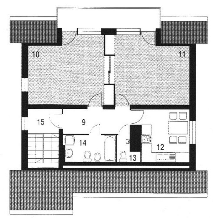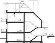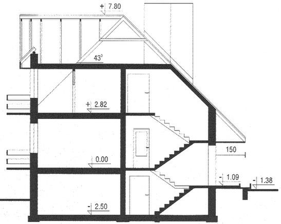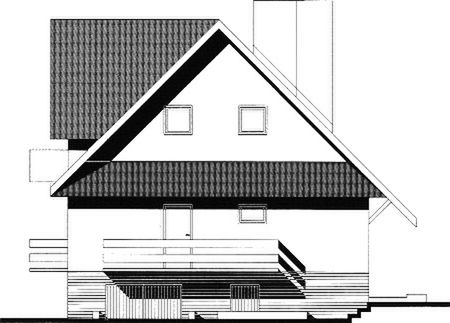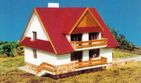 Ściany zewnętrzne: gr. 38 cm z pustaków ceramicznych + styropian. Strop: stropy Fert 45 alternatywnie płyta żelbetowa monolityczna, nad poddaszem drew-niany. Schody: żelbetowe. Dach: dach dwuspadowy o kacie nachylenia 43 stopnie, kryty blachą profilowaną lub dachówką ceramiczną. Poziom kalenicy: 9,18 od terenu. Dodatkowe informacje: W poziomie piwnic pomieszczenia techniczne i gospodarcze z oddzielnym wejściem, garaż..
