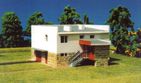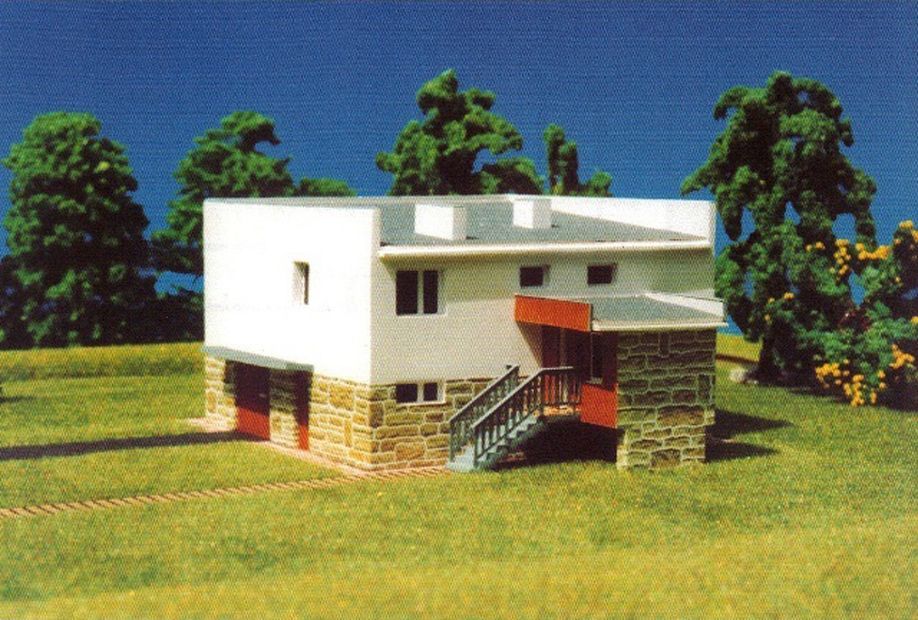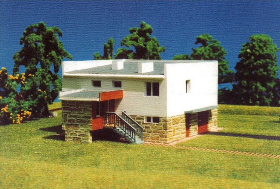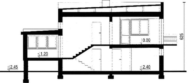 Ściany zewnętrzne: gr. 38 cm z pustaków ceramicznych + styropian. Strop: stropy DZ-3 alternatywnie Fert 45 lub płyta żelbetowa monolityczna, stropodach wentylowany z płyt dachowych żelbetowych. Schody: żelbetowe. Dach: dach płaski jednospadowy, kryty papą. Nachylenie 3 stopnie. Poziom kalenicy: 6,25 od terenu. Dodatkowe informacje: Możliwa rezygnacja z oddzielnego wejścia na parter przy wydłużeniu budynku do 11.8 m..