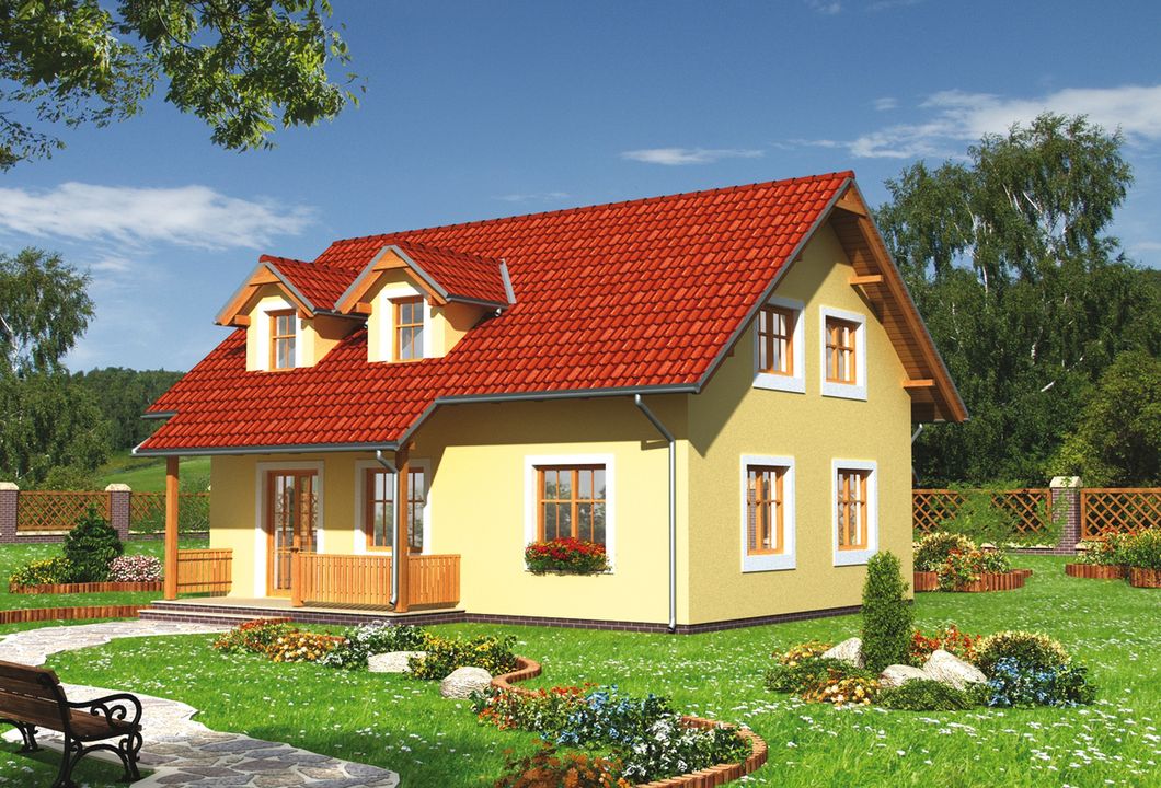 Graficzne opracowanie rzutów poglądowych widocznych na karcie projektu zostało wykonane przez Extradom.pl. Prezentowane przez Extradom.pl wizualizacje wykonane zostały przez autora projektu i należy poczytywać je jedynie za przykład i propozycję wykończenia, wizję architektoniczną autora projektu. Ostateczne wykończenie budynku może nastąpić na wiele sposobów. Szczegółowe rozwiązania zastosowane w oferowanej dokumentacji - w tym również ilość, lokalizacje i wygląd okien, drzwi, kominów - mogą w niewielkim stopniu różnić się od prezentowanej wizualizacji budynku.