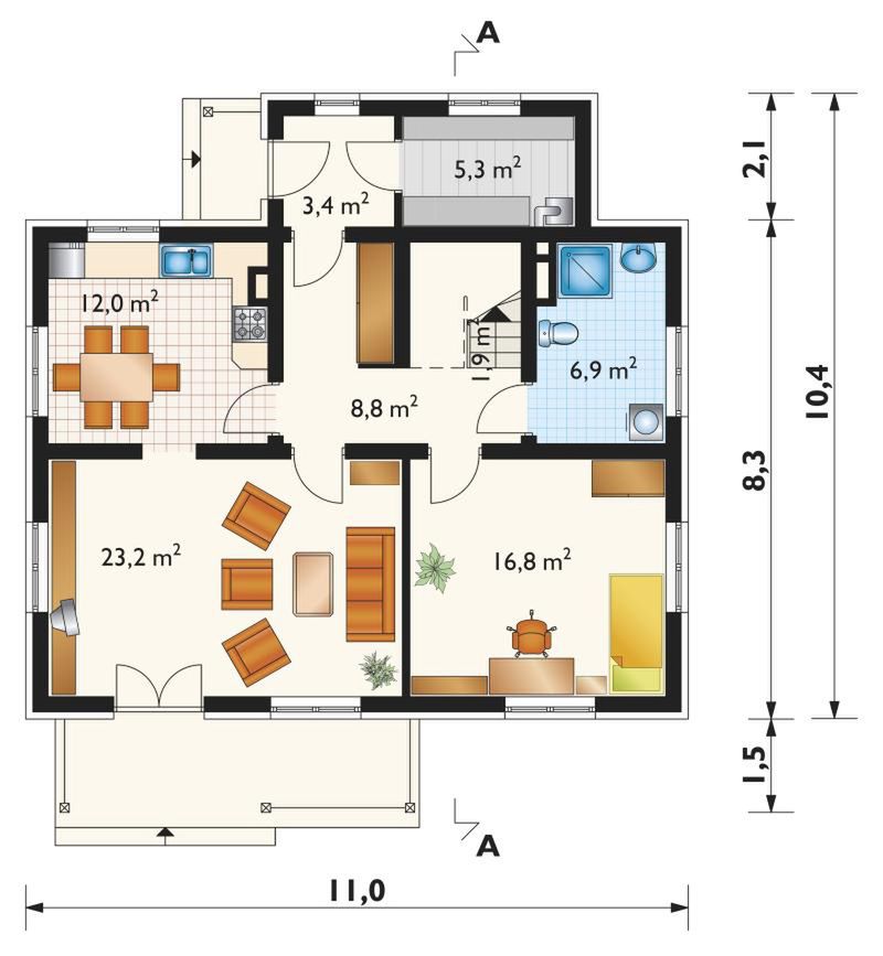 Technologia i konstrukcja: murowana – ceramika. Ściany zewnętrzne: cegła kratówka + styropian. Ściany wewnętrzne: cegła kratówka. Strop: żelbetowy. Konstrukcja dachu: drewniana, jętkowa. Rodzaj schodów: żelbetowe. Typ ogrzewania: kocioł na gaz. Aneks na paliwo stałe: na zamówienie. Pokrycie dachu: dachówka cementowa lub blacha dachówkowa. Elewacja: tynk cienkowarstwowy.