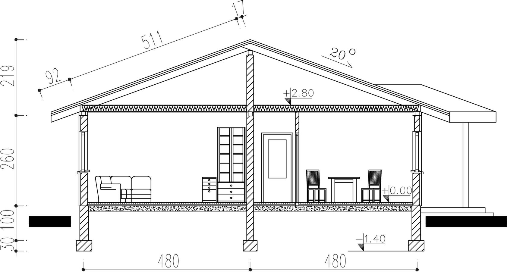 Fundamenty z betonu żwirowego. Ściany zewnętrzne wykonane w technologii bloczków styropianowo-betonowych, ściany wewnętrzne nośne z pustaków ceramicznych, ścianki działowe z cegły dziurawki lub płyt GK, strop żelbetowy monolityczny, więźba dachowa drewniana, kryta dachówką cementową lub ceramiczną. Możliwe zastosowanie ogrzewania gazowego lub olejowego.