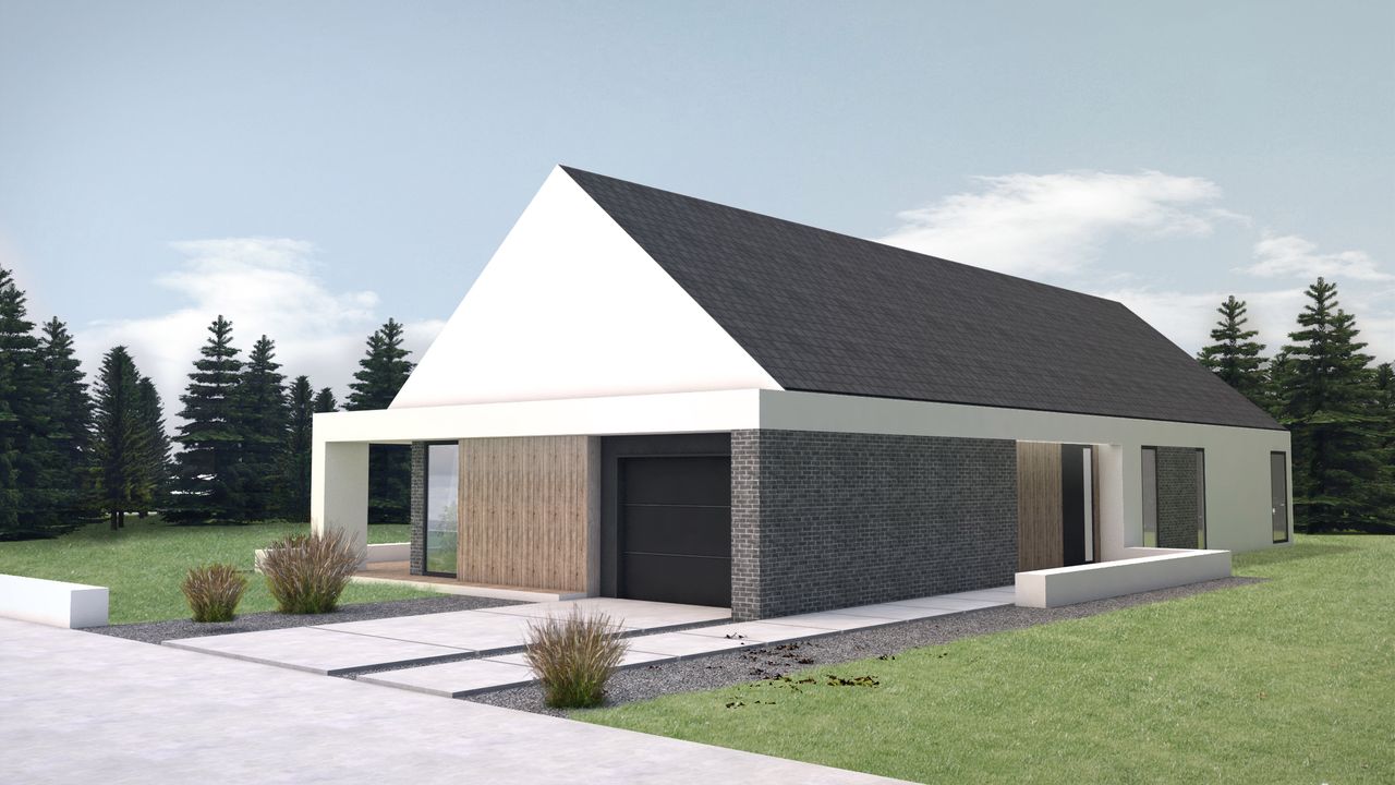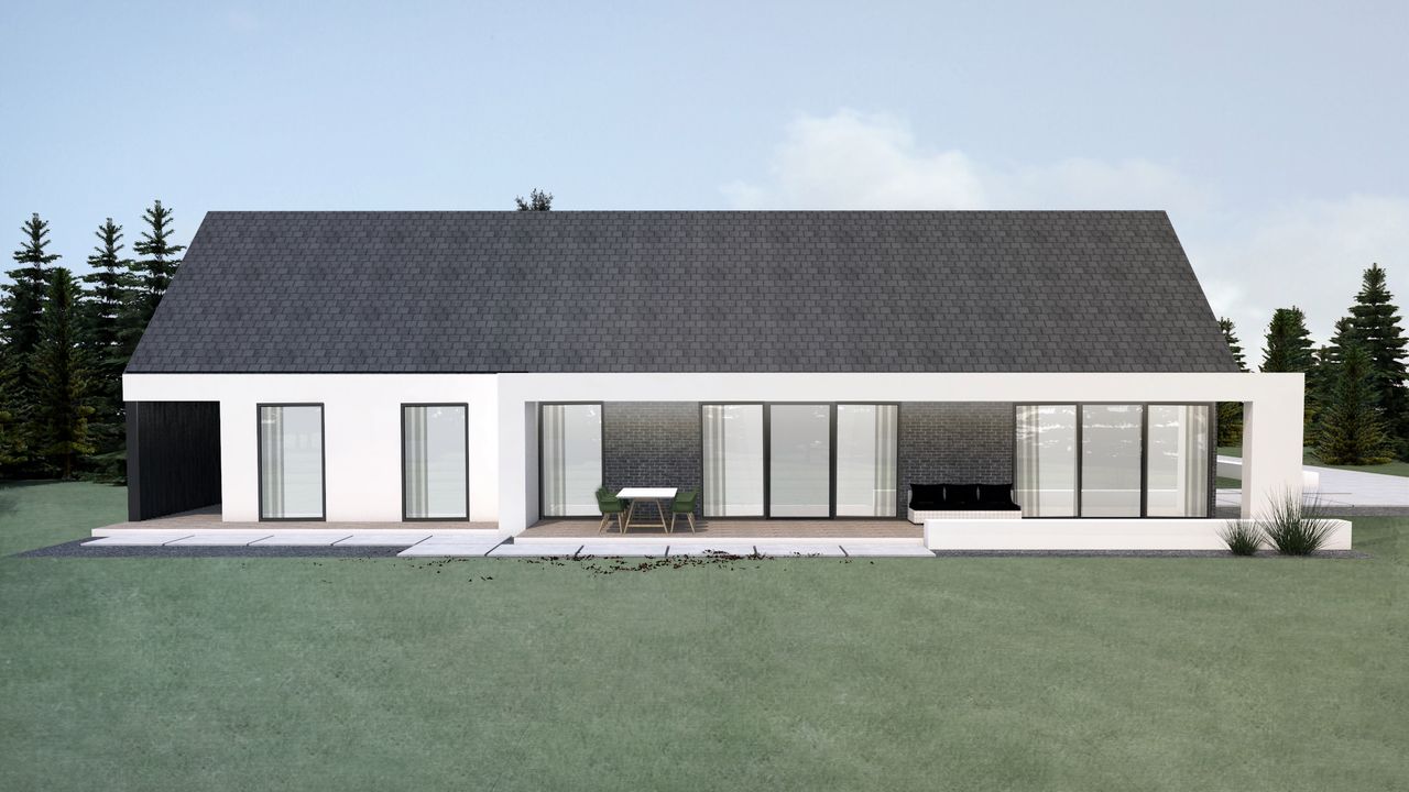Graficzne opracowanie rzutów poglądowych widocznych na karcie projektu zostało wykonane przez Extradom.pl. Prezentowane przez Extradom.pl wizualizacje wykonane zostały przez autora projektu i należy poczytywać je jedynie za przykład i propozycję wykończenia, wizję architektoniczną autora projektu. Ostateczne wykończenie budynku może nastąpić na wiele sposobów. Szczegółowe rozwiązania zastosowane w oferowanej dokumentacji - w tym również ilość, lokalizacje i wygląd okien, drzwi, kominów - mogą w niewielkim stopniu różnić się od prezentowanej wizualizacji budynku.