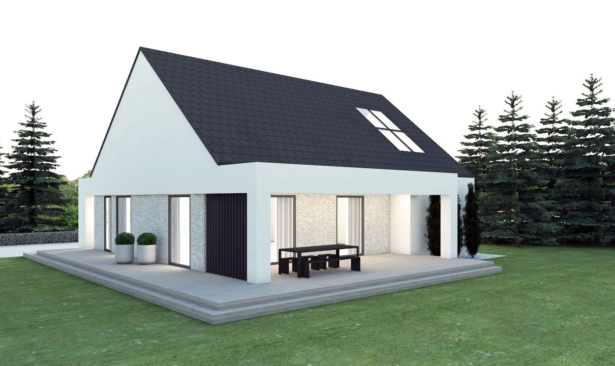 Graficzne opracowanie rzutów poglądowych widocznych na karcie projektu zostało wykonane przez Extradom.pl. Prezentowane przez Extradom.pl wizualizacje wykonane zostały przez autora projektu i należy poczytywać je jedynie za przykład i propozycję wykończenia, wizję architektoniczną autora projektu. Ostateczne wykończenie budynku może nastąpić na wiele sposobów. Szczegółowe rozwiązania zastosowane w oferowanej dokumentacji - w tym również ilość, lokalizacje i wygląd okien, drzwi, kominów - mogą w niewielkim stopniu różnić się od prezentowanej wizualizacji budynku.