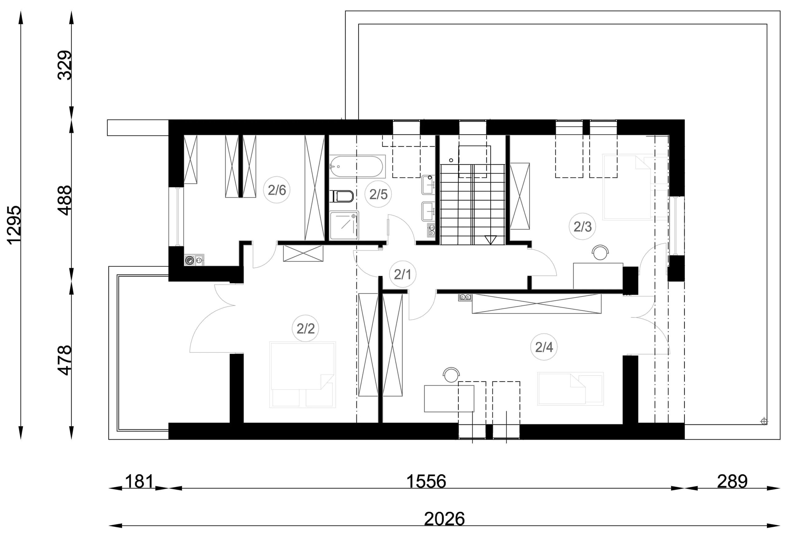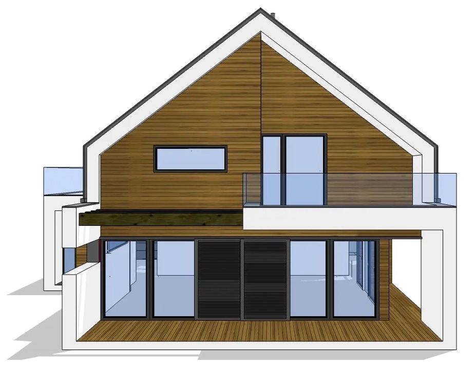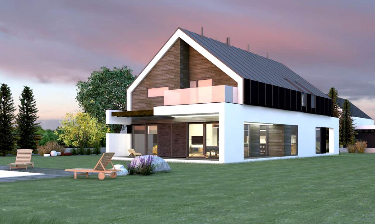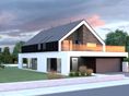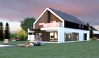 Graficzne opracowanie rzutów poglądowych widocznych na karcie projektu zostało wykonane przez Extradom.pl. Prezentowane przez Extradom.pl wizualizacje wykonane zostały przez autora projektu i należy poczytywać je jedynie za przykład i propozycję wykończenia, wizję architektoniczną autora projektu. Ostateczne wykończenie budynku może nastąpić na wiele sposobów. Szczegółowe rozwiązania zastosowane w oferowanej dokumentacji - w tym również ilość, lokalizacje i wygląd okien, drzwi, kominów - mogą w niewielkim stopniu różnić się od prezentowanej wizualizacji budynku.