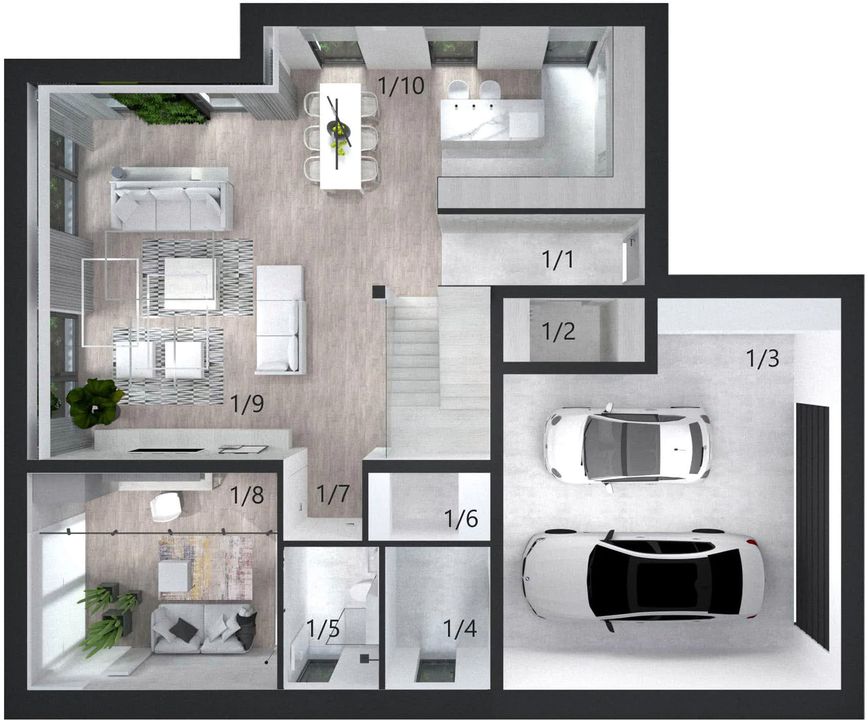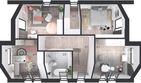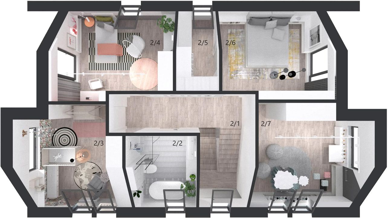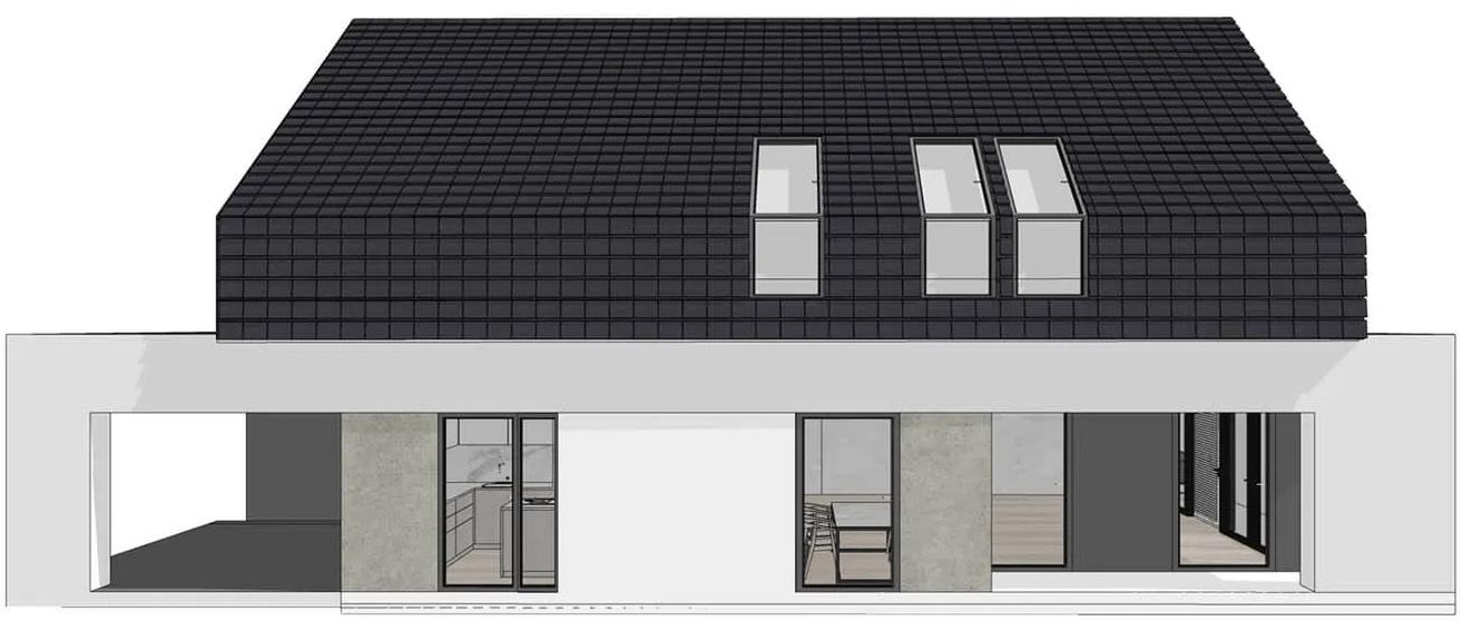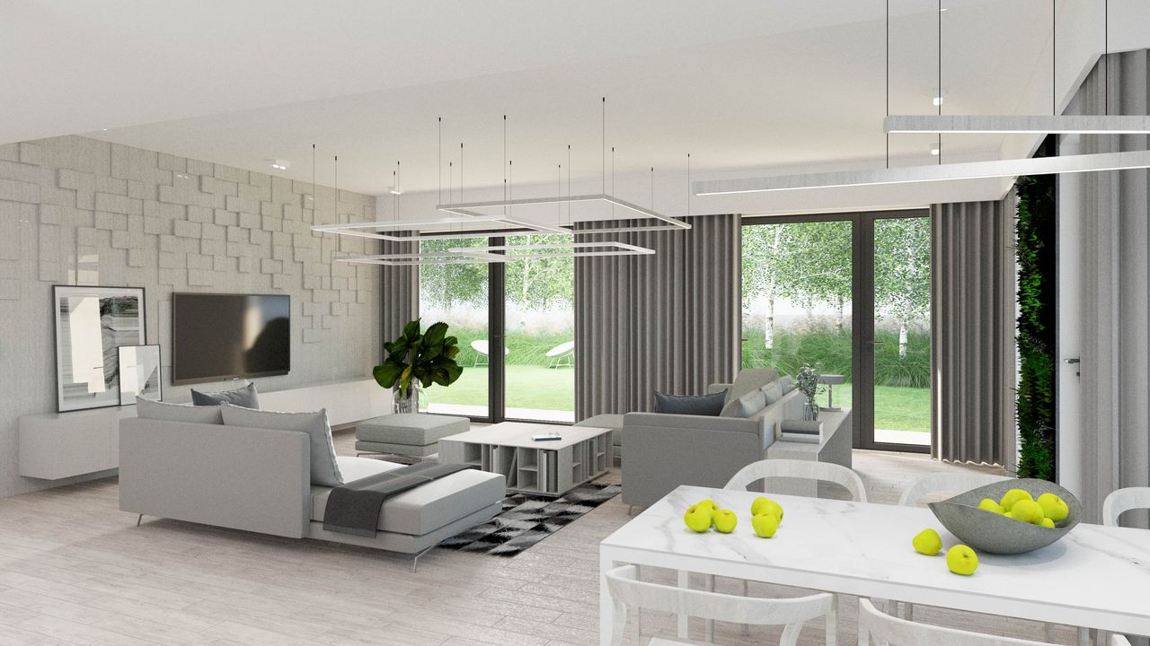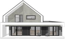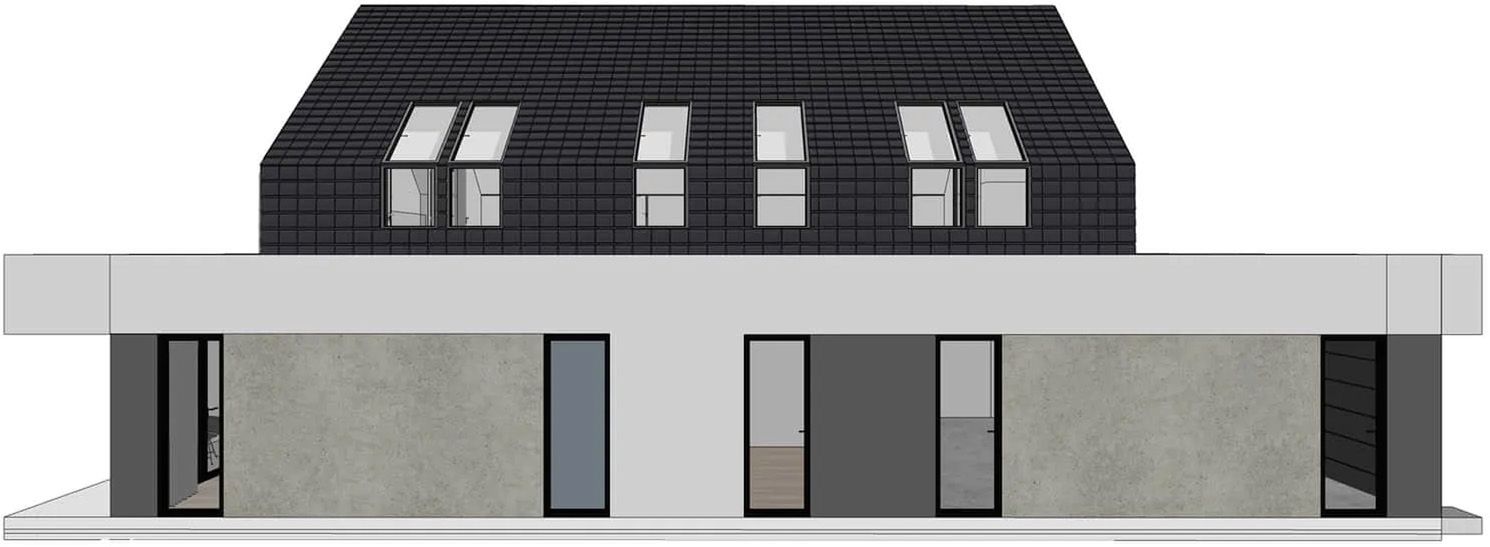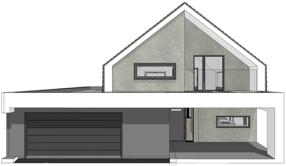 Graficzne opracowanie rzutów poglądowych widocznych na karcie projektu zostało wykonane przez Extradom.pl. Prezentowane przez Extradom.pl wizualizacje wykonane zostały przez autora projektu i należy poczytywać je jedynie za przykład i propozycję wykończenia, wizję architektoniczną autora projektu. Ostateczne wykończenie budynku może nastąpić na wiele sposobów. Szczegółowe rozwiązania zastosowane w oferowanej dokumentacji - w tym również ilość, lokalizacje i wygląd okien, drzwi, kominów - mogą w niewielkim stopniu różnić się od prezentowanej wizualizacji budynku.