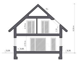 Budynek jednorodzinny wolnostojący - z możliwością zbliźniaczenia na etapie adaptacji Projektu (łącząc dwa Projekty - projekt w wersji podstawowej i projekt w wersji lustrzanej).Fundamenty: żelbetowe + bloczki betonowe + styropian. Ściany zewnętrzne: bloczki z betonu komórkowego o gr. 24 cm + styropian o gr. 18 cm. Ściany wewnętrzne: bloczki z betonu komórkowego o gr. 24 cm, bloczki silikatowe o gr. 12 i 8 cmstropy: żelbetowe. Dach: konstrukcja drewniana+ wełna mineralna. Wykończenie zewn: tynk silikonowy.