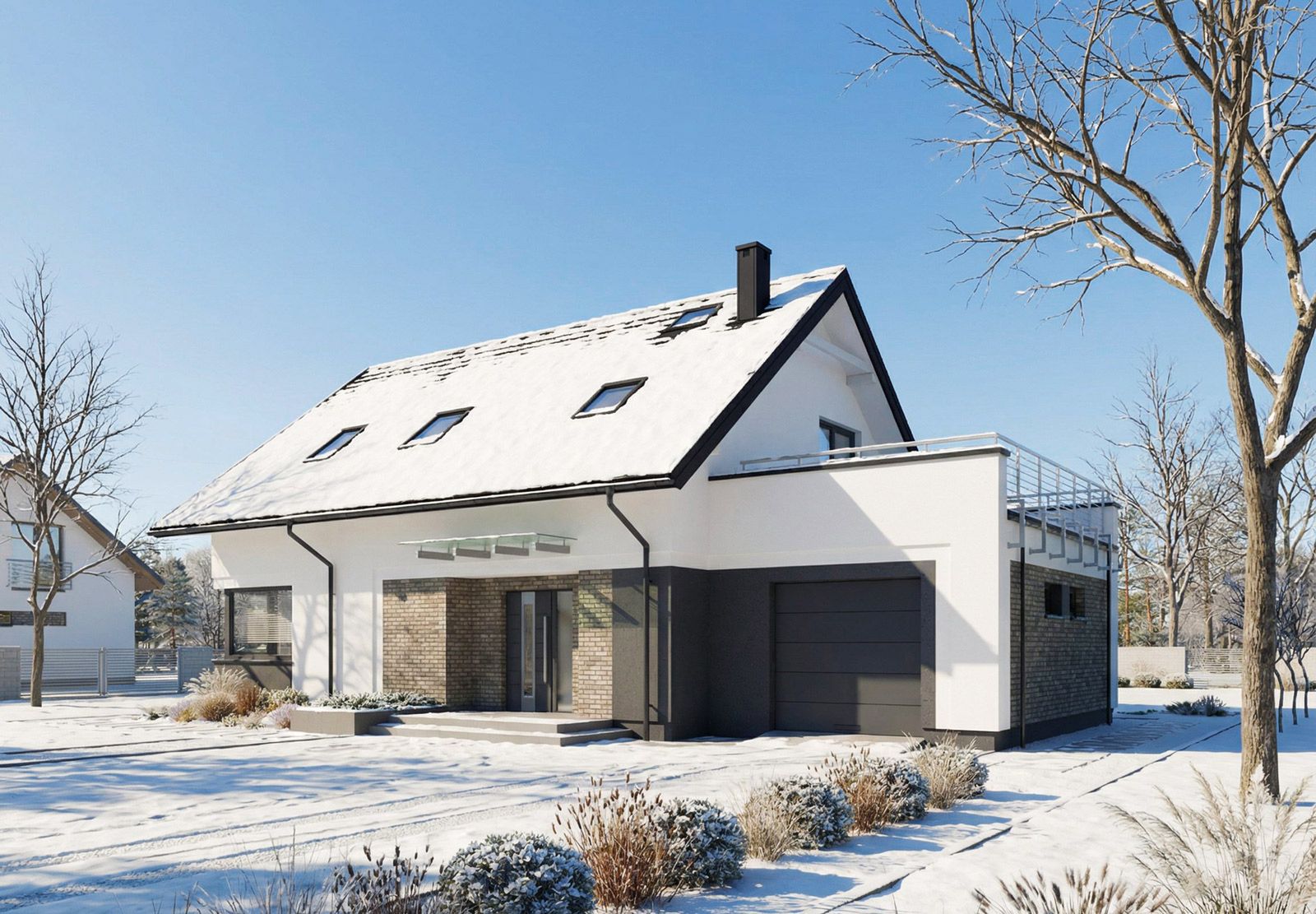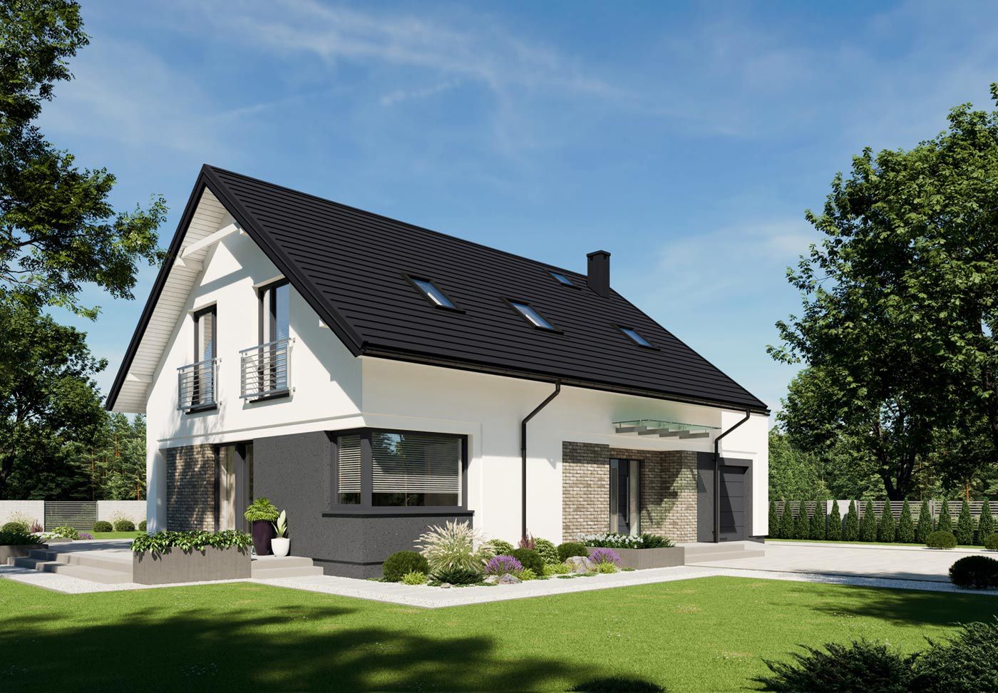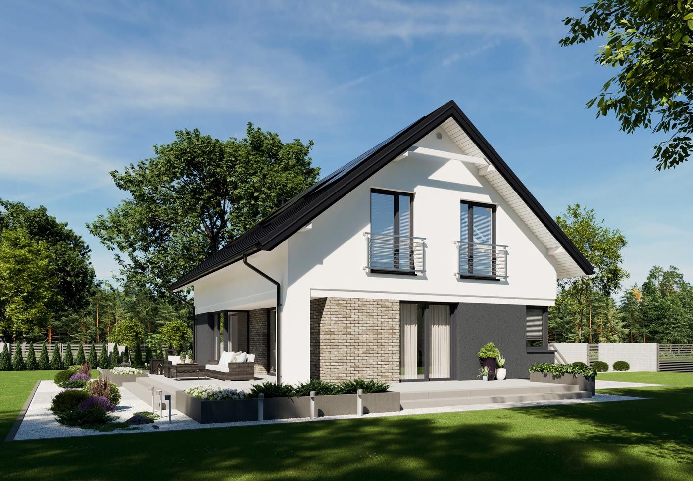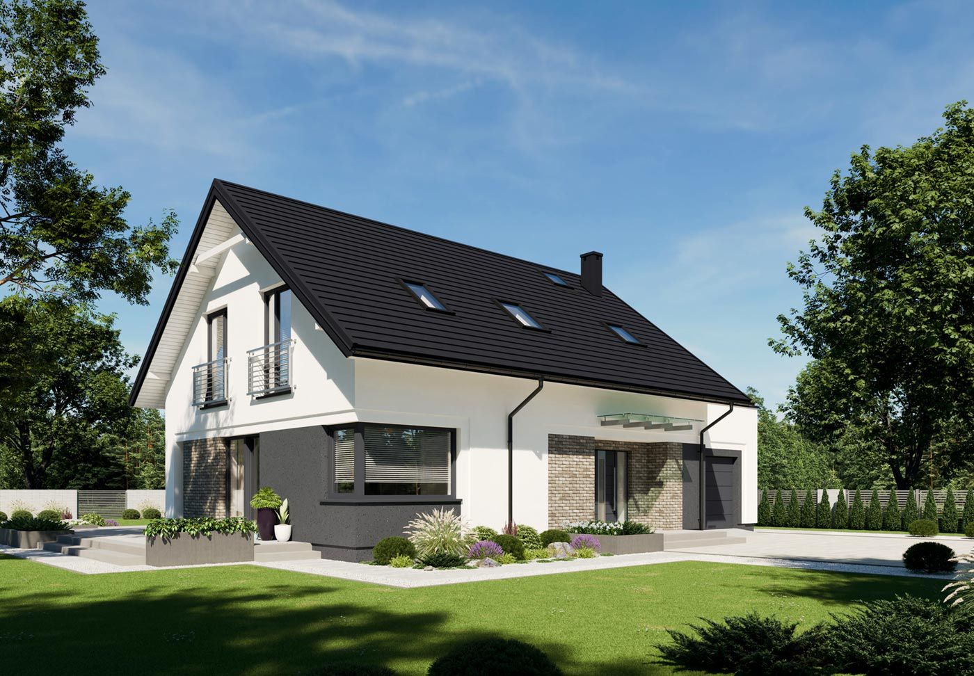 Graficzne opracowanie rzutów poglądowych widocznych na karcie projektu zostało wykonane przez Extradom.pl. Prezentowane przez Extradom.pl wizualizacje wykonane zostały przez autora projektu i należy poczytywać je jedynie za przykład i propozycję wykończenia, wizję architektoniczną autora projektu. Ostateczne wykończenie budynku może nastąpić na wiele sposobów. Szczegółowe rozwiązania zastosowane w oferowanej dokumentacji - w tym również ilość, lokalizacje i wygląd okien, drzwi, kominów - mogą w niewielkim stopniu różnić się od prezentowanej wizualizacji budynku.