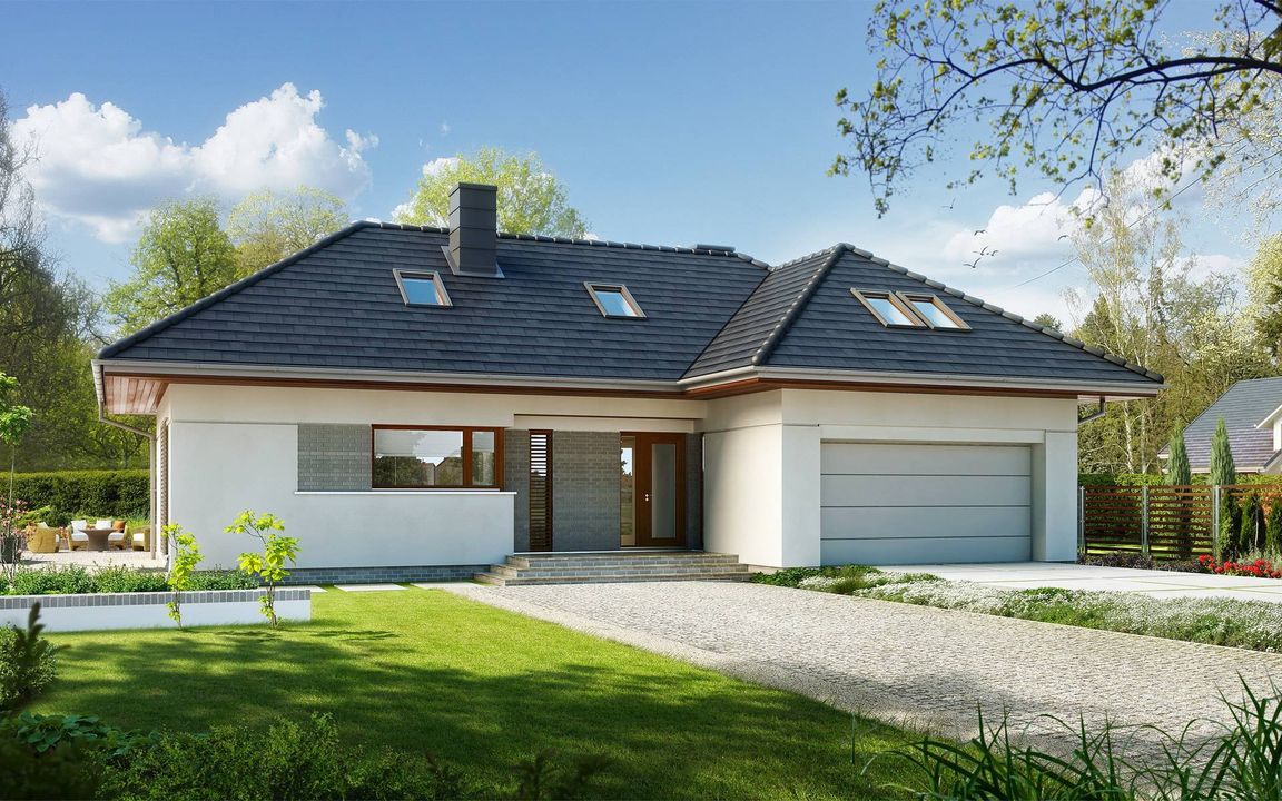 Graficzne opracowanie rzutów poglądowych widocznych na karcie projektu zostało wykonane przez Extradom.pl. Prezentowane przez Extradom.pl wizualizacje wykonane zostały przez autora projektu i należy poczytywać je jedynie za przykład i propozycję wykończenia, wizję architektoniczną autora projektu. Ostateczne wykończenie budynku może nastąpić na wiele sposobów. Szczegółowe rozwiązania zastosowane w oferowanej dokumentacji - w tym również ilość, lokalizacje i wygląd okien, drzwi, kominów - mogą w niewielkim stopniu różnić się od prezentowanej wizualizacji budynku.