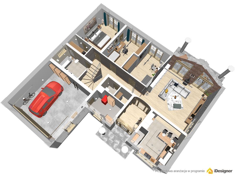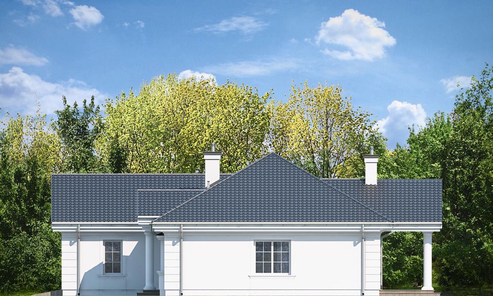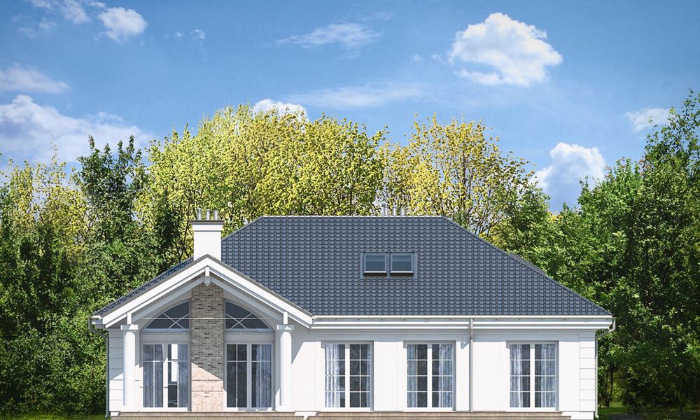 Graficzne opracowanie rzutów poglądowych widocznych na karcie projektu zostało wykonane przez Extradom.pl. Prezentowane przez Extradom.pl wizualizacje wykonane zostały przez autora projektu i należy poczytywać je jedynie za przykład i propozycję wykończenia, wizję architektoniczną autora projektu. Ostateczne wykończenie budynku może nastąpić na wiele sposobów. Szczegółowe rozwiązania zastosowane w oferowanej dokumentacji - w tym również ilość, lokalizacje i wygląd okien, drzwi, kominów - mogą w niewielkim stopniu różnić się od prezentowanej wizualizacji budynku.