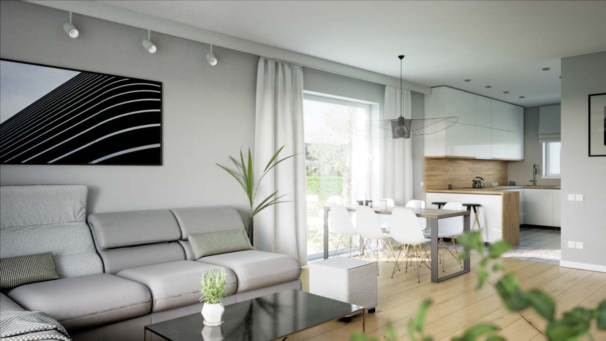 Graficzne opracowanie rzutów poglądowych widocznych na karcie projektu zostało wykonane przez Extradom.pl. Prezentowane przez Extradom.pl wizualizacje wykonane zostały przez autora projektu i należy poczytywać je jedynie za przykład i propozycję wykończenia, wizję architektoniczną autora projektu. Ostateczne wykończenie budynku może nastąpić na wiele sposobów. Szczegółowe rozwiązania zastosowane w oferowanej dokumentacji - w tym również ilość, lokalizacje i wygląd okien, drzwi, kominów - mogą w niewielkim stopniu różnić się od prezentowanej wizualizacji budynku.