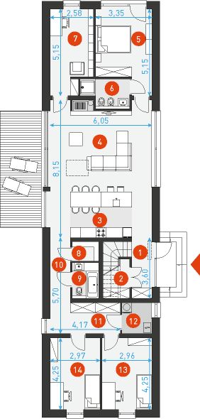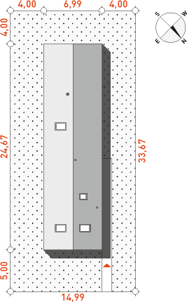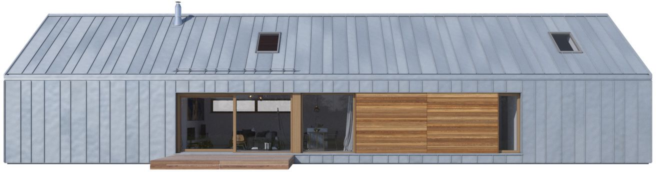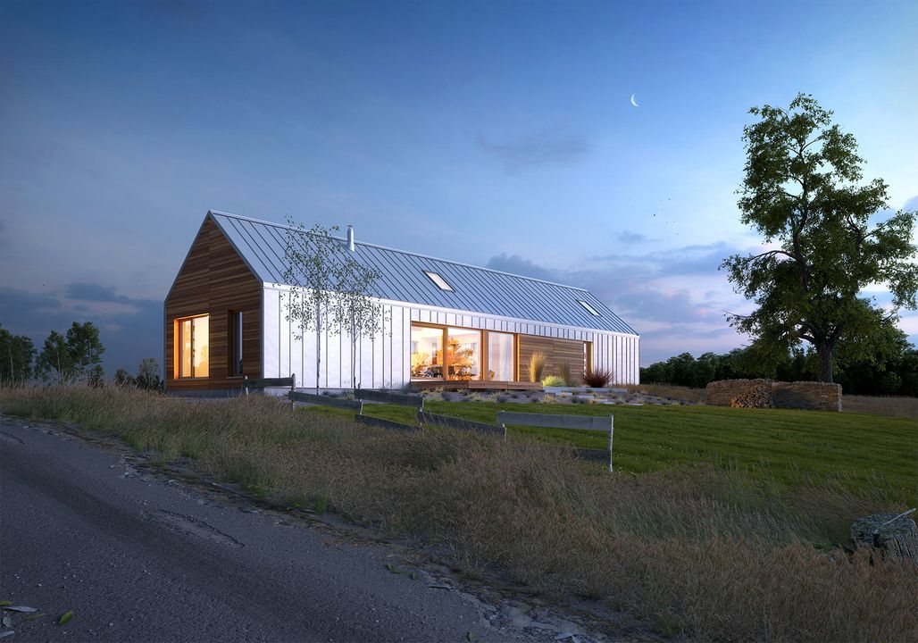 Konstrukcja: zgodna z normami EUROKOD. Fundamenty: tradycyjne ławy i stopy żelbetowe. Ściany: bloczek silikatowy + wełna mineralna na etapie adaptacji można zamienić na inny materiał o tej samej wytrzymałości na ściskanie 10-15 MPa, np. pustak ceramiczny. Elewacja: blacha ocynkowana Plannja Emka, drewniany profil elewacyjny materiał dodatkowy podkreślający podziały elewacji, taki jak płytka klinkierowa można zamienić na inny, np. drewno. Stropy: żelbetowe wylewane na etapie adaptacji istnieje możliwość zmiany na stropy gęstożebrowe. Schody: żelbetowe konstrukcja schodów oraz materiały wykończeniowe przewidziane do indywidualnej aranżacji. Możesz skorzystać z usług naszego partnera. Formularz dostępny w zakładce „kosztorys” Dach: blacha ocynkowana Plannja Emka konstrukcja więźby przewidziana pod pokrycie ciężkie dla I strefy wiatrowej i II strefy śniegowej.