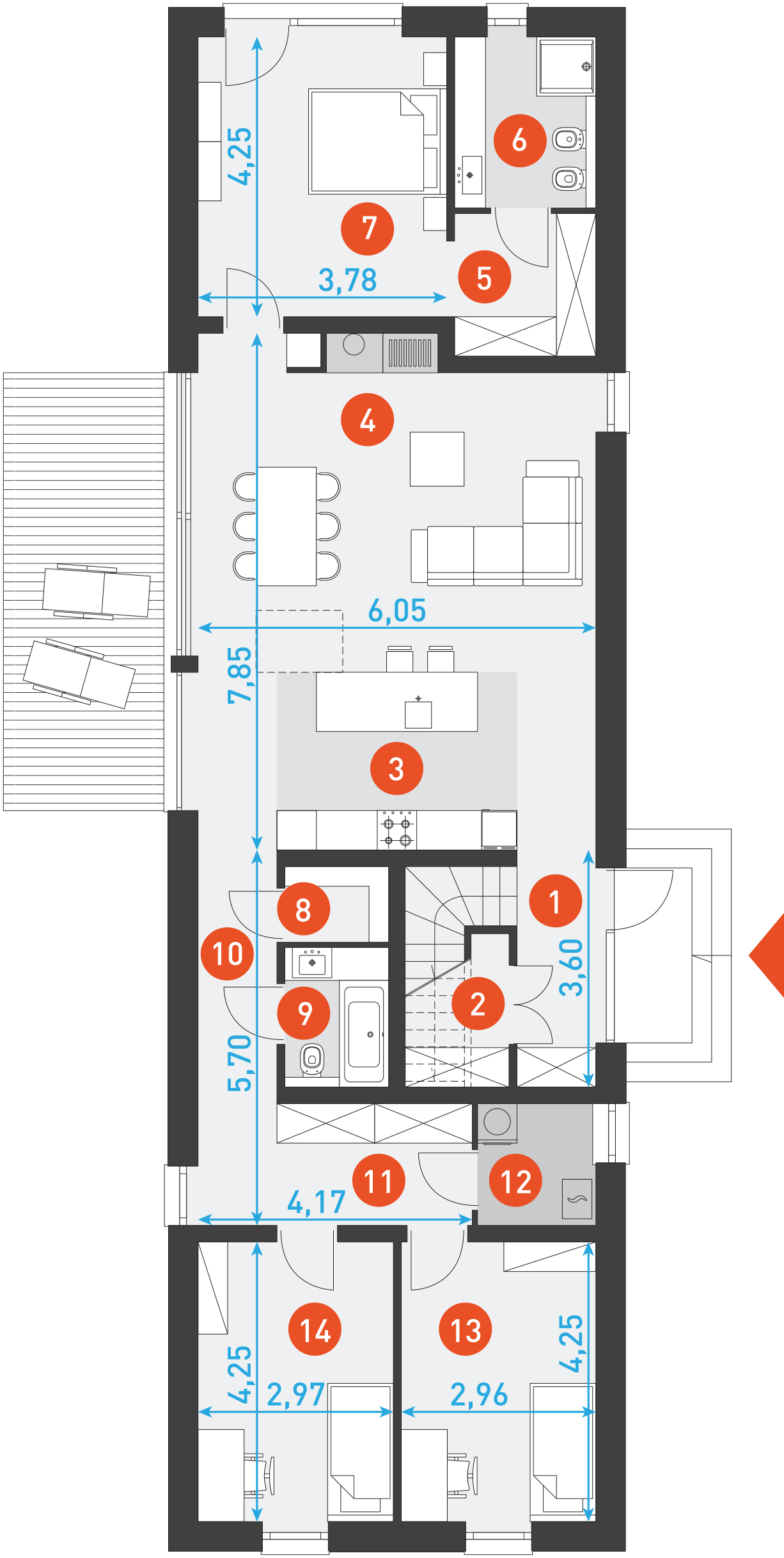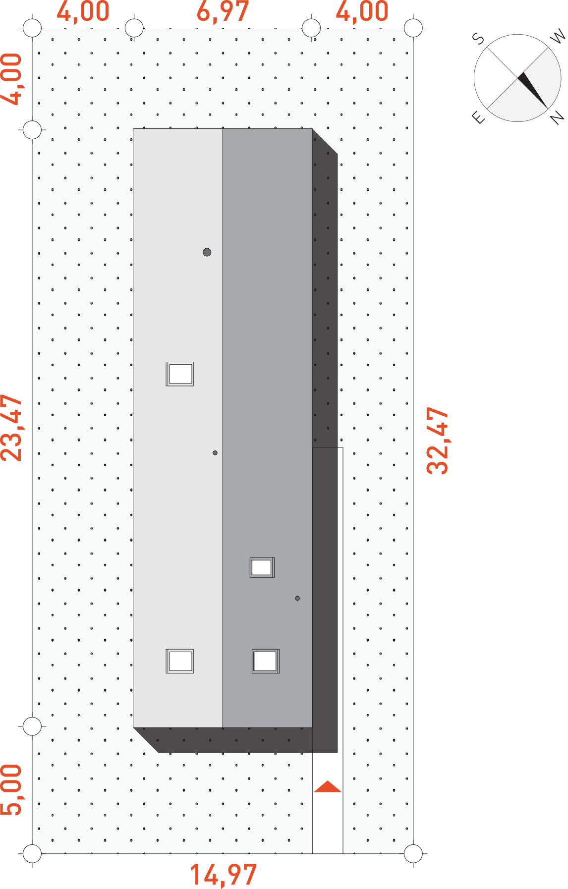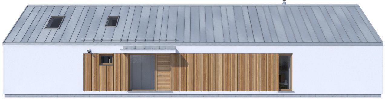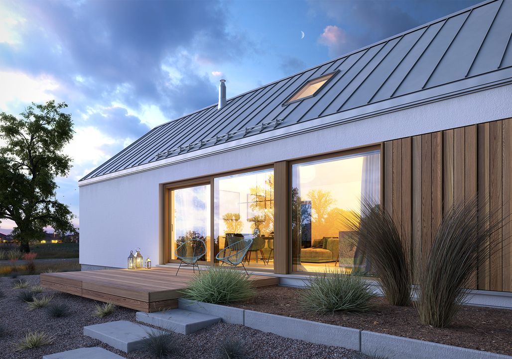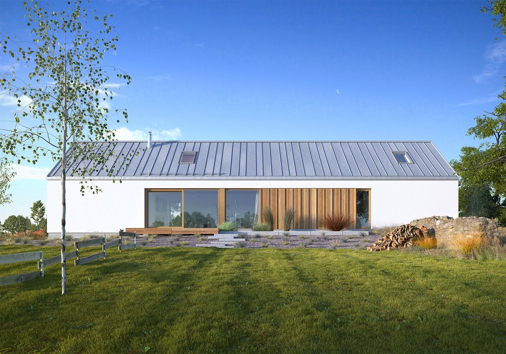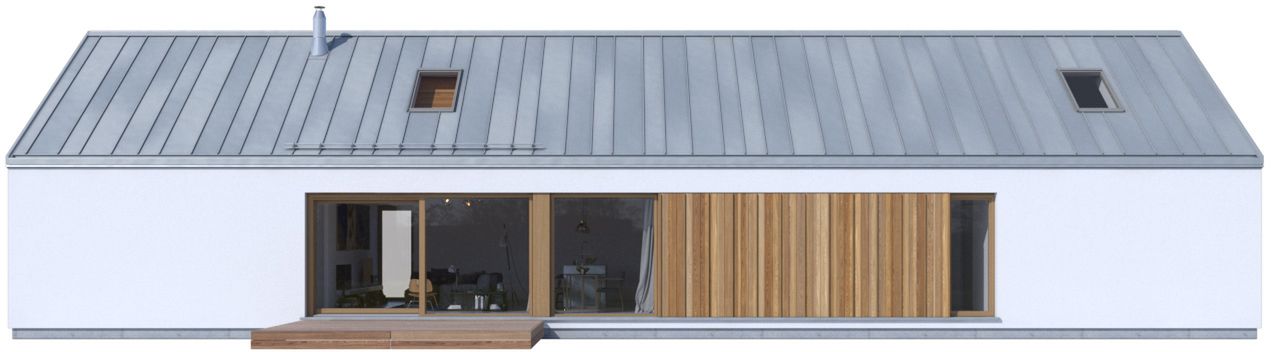 Konstrukcja: zgodna z normami EUROKOD. Fundamenty: tradycyjne ławy i stopy żelbetowe. Ściany: bloczek silikatowy + styropian na etapie adaptacji można zamienić na inny materiał o tej samej wytrzymałości na ściskanie 10-15 MPa, np. pustak ceramiczny. Elewacja: tynk, drewniany profil elewacyjny materiał dodatkowy podkreślający podziały elewacji, taki jak płytka klinkierowa można zamienić na inny, np. drewno. Stropy: żelbetowe wylewane na etapie adaptacji istnieje możliwość zmiany na stropy gęstożebrowe. Schody: żelbetowe konstrukcja schodów oraz materiały wykończeniowe przewidziane do indywidualnej aranżacji. Możesz skorzystać z usług naszego partnera. Formularz dostępny w zakładce „kosztorys” Dach: blacha ocynkowana Plannja Emka konstrukcja więźby przewidziana pod pokrycie ciężkie dla I strefy wiatrowej i II strefy śniegowej.