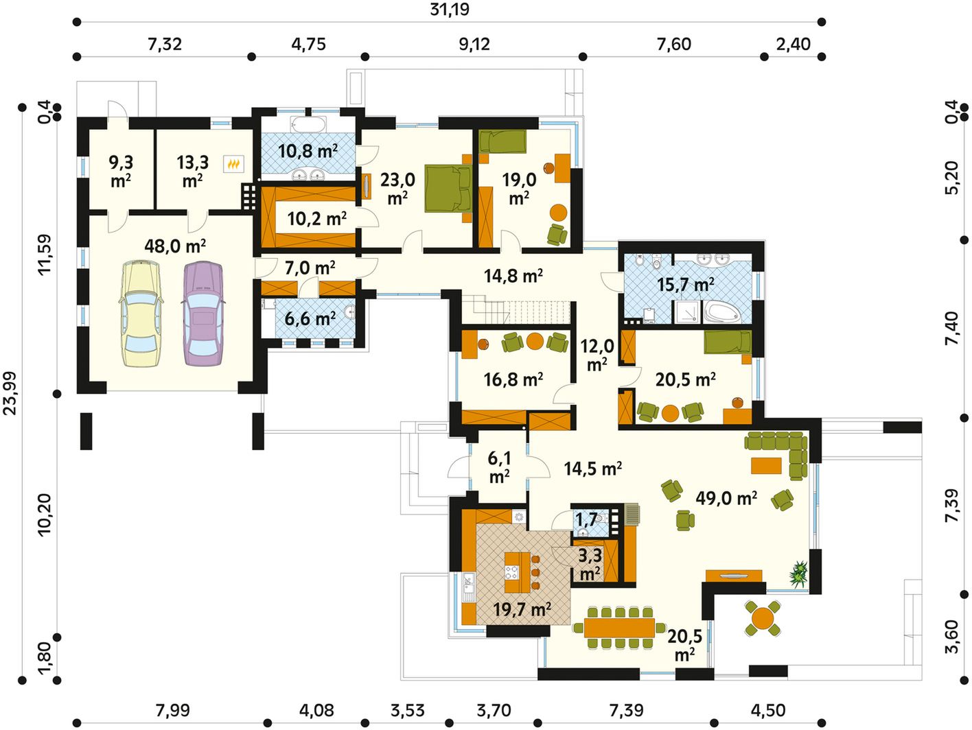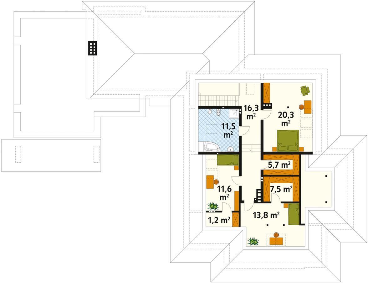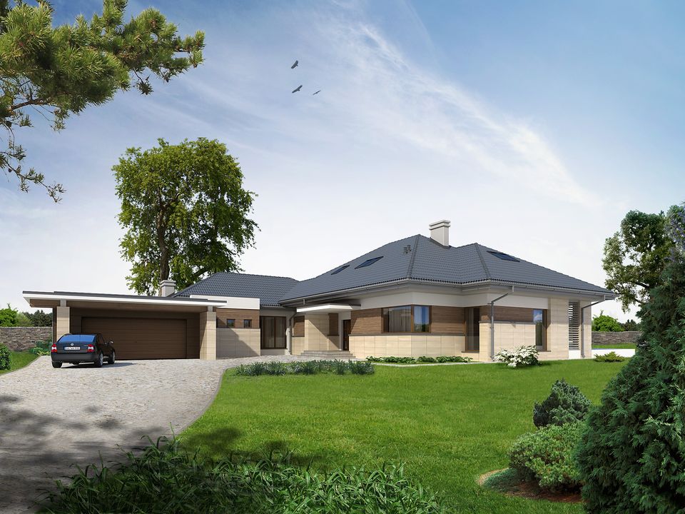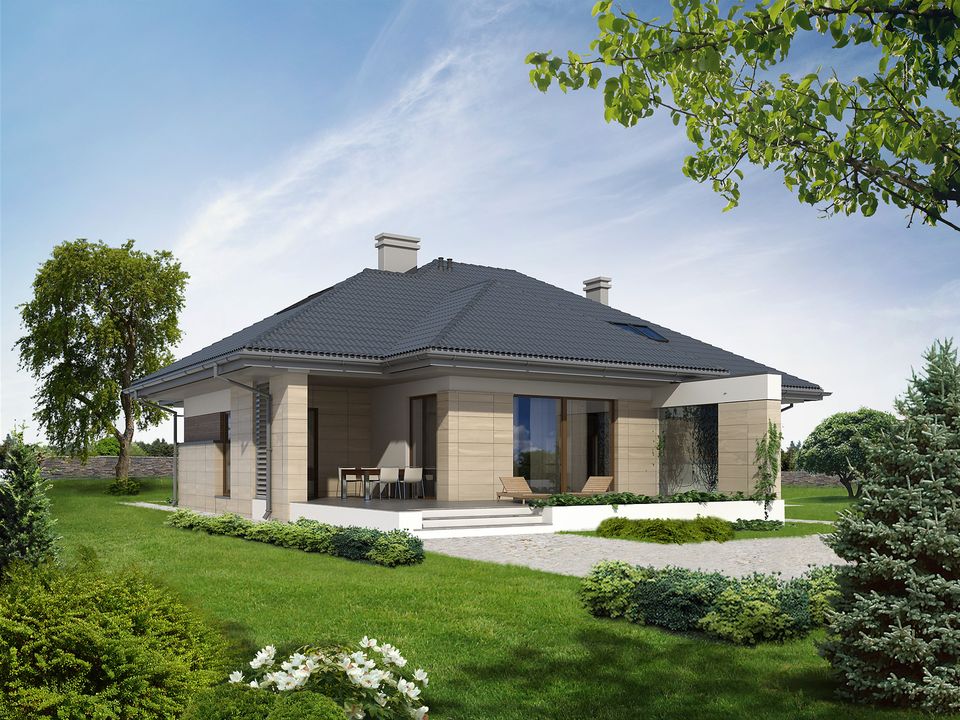 Graficzne opracowanie rzutów poglądowych widocznych na karcie projektu zostało wykonane przez Extradom.pl. Prezentowane przez Extradom.pl wizualizacje wykonane zostały przez autora projektu i należy poczytywać je jedynie za przykład i propozycję wykończenia, wizję architektoniczną autora projektu. Ostateczne wykończenie budynku może nastąpić na wiele sposobów. Szczegółowe rozwiązania zastosowane w oferowanej dokumentacji - w tym również ilość, lokalizacje i wygląd okien, drzwi, kominów - mogą w niewielkim stopniu różnić się od prezentowanej wizualizacji budynku.
