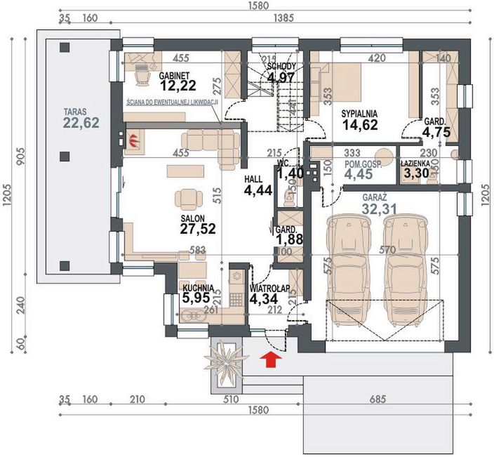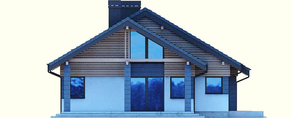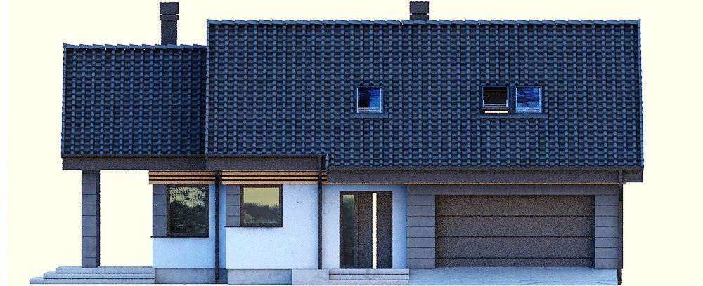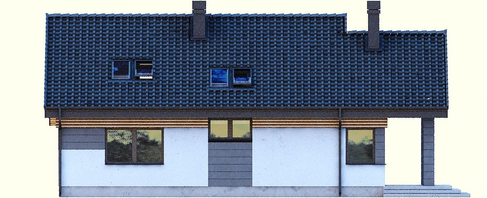 Graficzne opracowanie rzutów poglądowych widocznych na karcie projektu zostało wykonane przez Extradom.pl. Prezentowane przez Extradom.pl wizualizacje wykonane zostały przez autora projektu i należy poczytywać je jedynie za przykład i propozycję wykończenia, wizję architektoniczną autora projektu. Ostateczne wykończenie budynku może nastąpić na wiele sposobów. Szczegółowe rozwiązania zastosowane w oferowanej dokumentacji - w tym również ilość, lokalizacje i wygląd okien, drzwi, kominów - mogą w niewielkim stopniu różnić się od prezentowanej wizualizacji budynku.