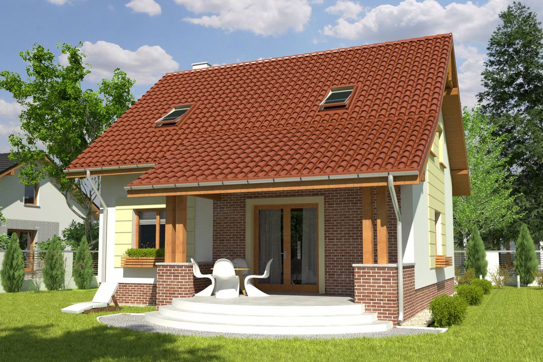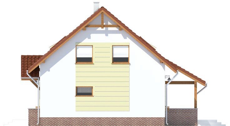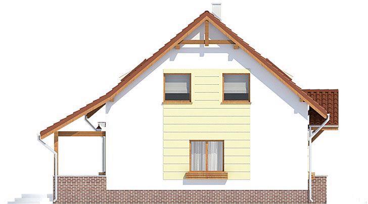 Projekt Nela II bez garażu [B] charakteryzuje się prostą, zwartą bryłą przykrytą dwuspadowym dachem, co jest sprawdzonym i ekonomicznym rozwiązaniem. Tradycyjny styl budynku podkreśla klasyczna forma oraz dach z okapem. Z salonu przewidziano bezpośrednie wyjście na taras, który w ciepłe dni staje się naturalnym przedłużeniem strefy wypoczynkowej. Doświetlenie pomieszczeń na poddaszu zapewniają trzy okna połaciowe, które wprowadzają do wnętrz mnóstwo naturalnego światła.