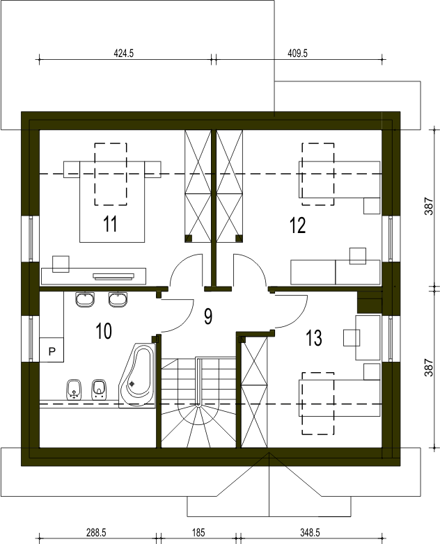 Poddasze stanowi prywatną oazę domowników, zapewniając idealne warunki do odpoczynku. Znajduje się tu komfortowy i ustawny pokój, który doskonale sprawdzi się w roli sypialni. Obok niego zaprojektowano dużą, w pełni funkcjonalną łazienkę, która z łatwością pomieści niezbędne wyposażenie.