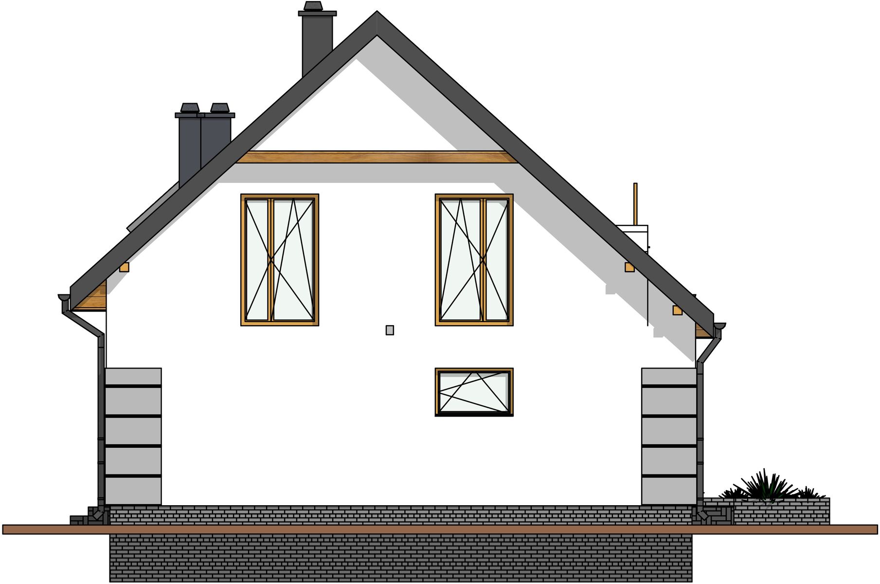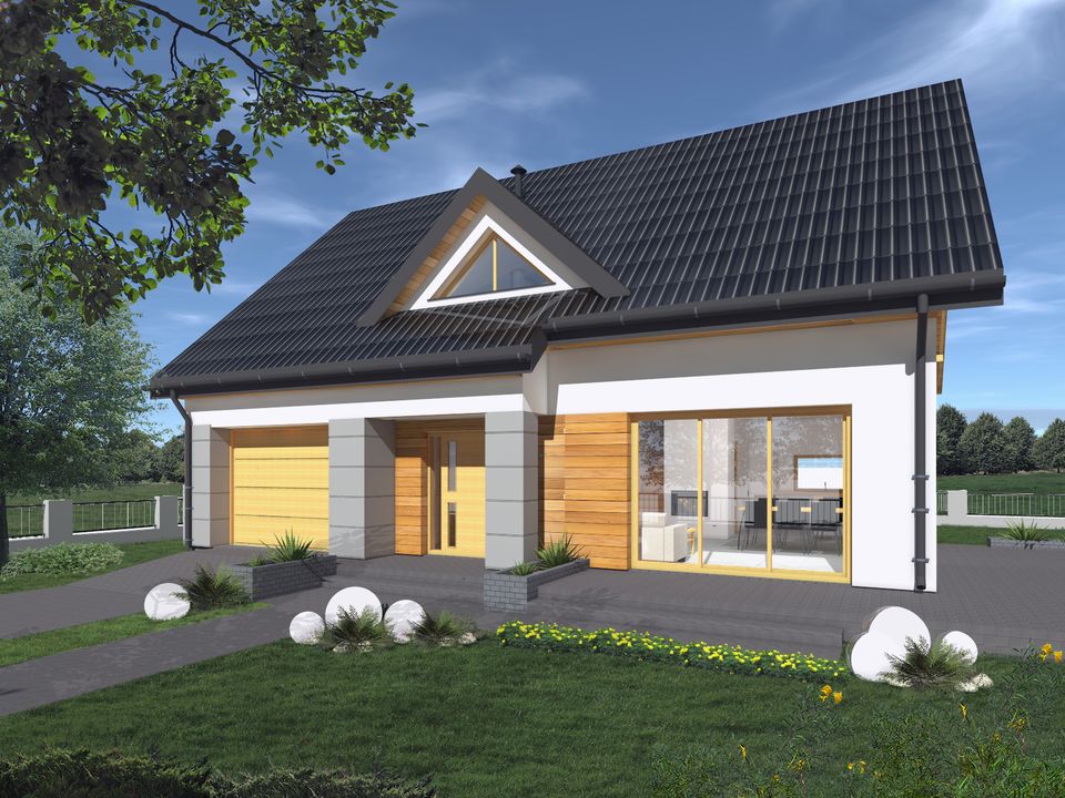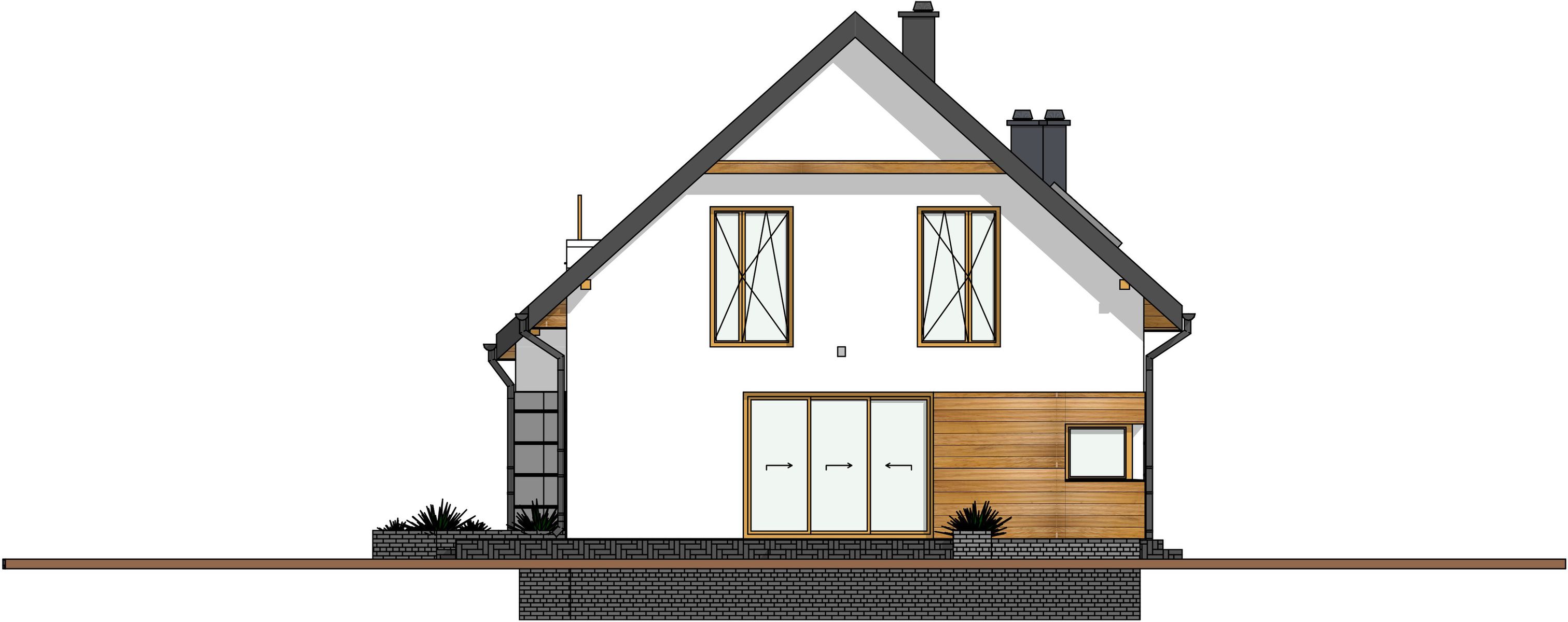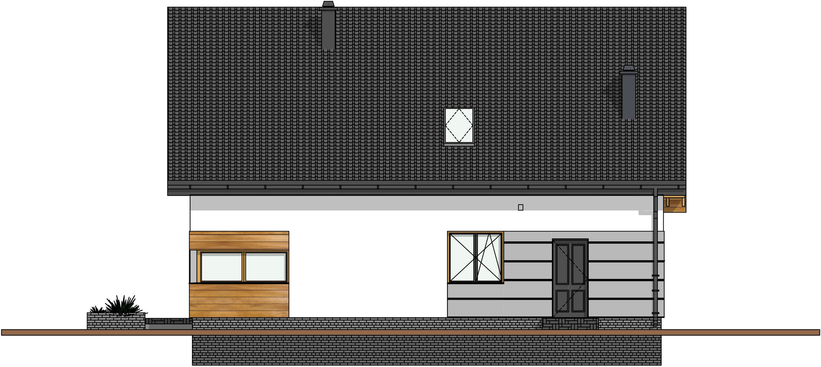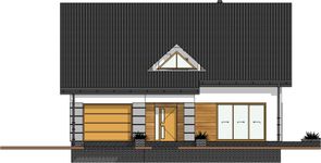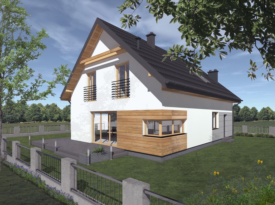 Graficzne opracowanie rzutów poglądowych widocznych na karcie projektu zostało wykonane przez Extradom.pl. Prezentowane przez Extradom.pl wizualizacje wykonane zostały przez autora projektu i należy poczytywać je jedynie za przykład i propozycję wykończenia, wizję architektoniczną autora projektu. Ostateczne wykończenie budynku może nastąpić na wiele sposobów. Szczegółowe rozwiązania zastosowane w oferowanej dokumentacji - w tym również ilość, lokalizacje i wygląd okien, drzwi, kominów - mogą w niewielkim stopniu różnić się od prezentowanej wizualizacji budynku.