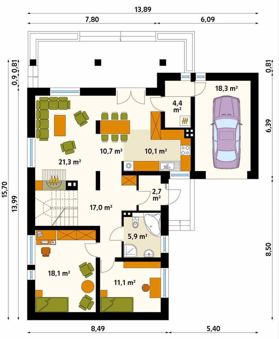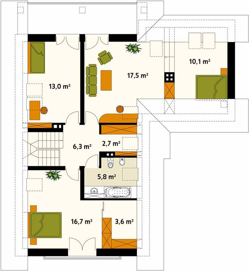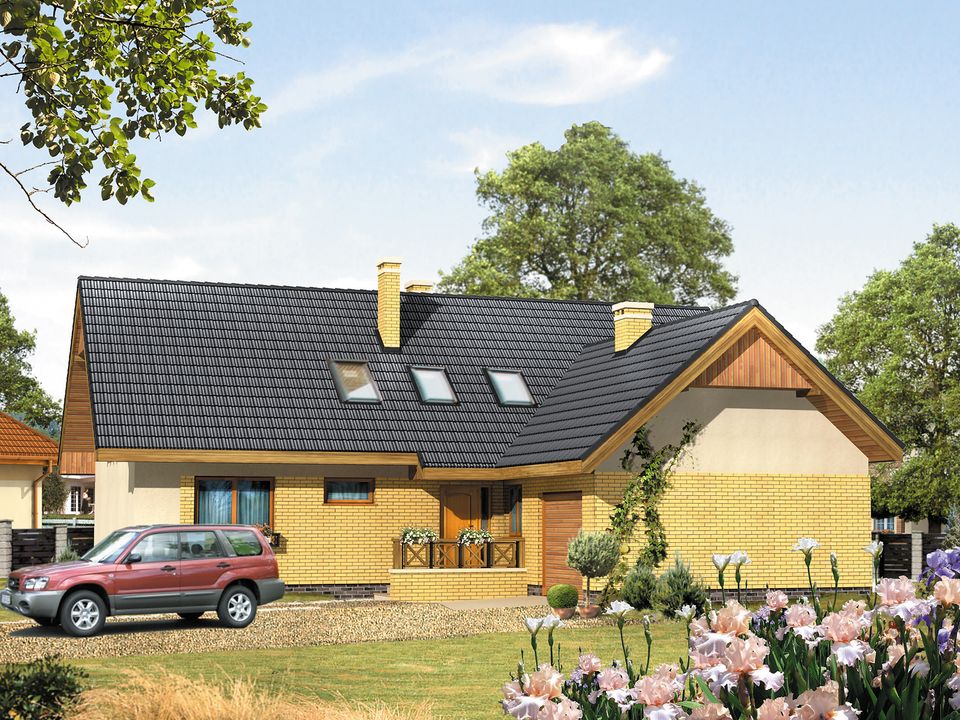 Graficzne opracowanie rzutów poglądowych widocznych na karcie projektu zostało wykonane przez Extradom.pl. Prezentowane przez Extradom.pl wizualizacje wykonane zostały przez autora projektu i należy poczytywać je jedynie za przykład i propozycję wykończenia, wizję architektoniczną autora projektu. Ostateczne wykończenie budynku może nastąpić na wiele sposobów. Szczegółowe rozwiązania zastosowane w oferowanej dokumentacji - w tym również ilość, lokalizacje i wygląd okien, drzwi, kominów - mogą w niewielkim stopniu różnić się od prezentowanej wizualizacji budynku.