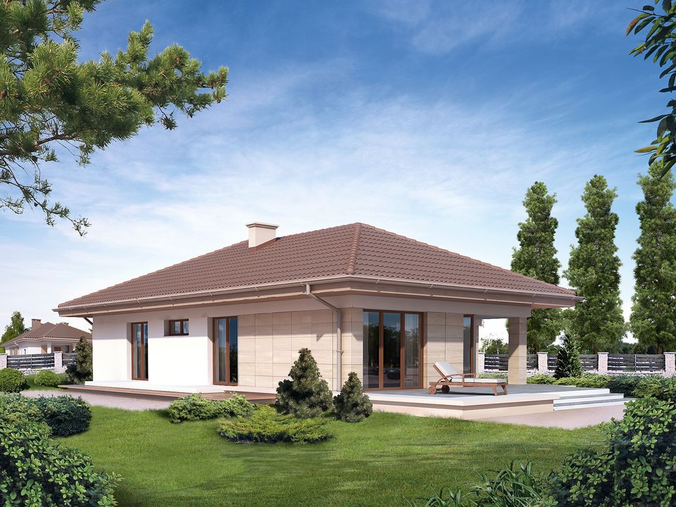 Ściany: 2-warstwowe - pustak ceramiczny + styropian. Stropy: żelbetowe, wylewane. Dach: dachówka ceramiczna CREATON, kąt nachylenia 25° Zapytaj o kąt 30°. Ogrzewanie: gazowe, pakiet "Kotłownia na paliwo stałe".