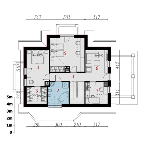 Stropy: żelbetowe. Ściany: beton komórkowy. Dach: więźba drewniana. Pokrycie dachu: dachówka ceramiczna. Stolarka: drewniana.