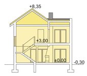 Strop: gęstożebrowy Teriva I. Ściany zewnętrzne: gazobeton 24cm + styropian 14cm. Pokrycie dachowe: dachówka ceramiczna.