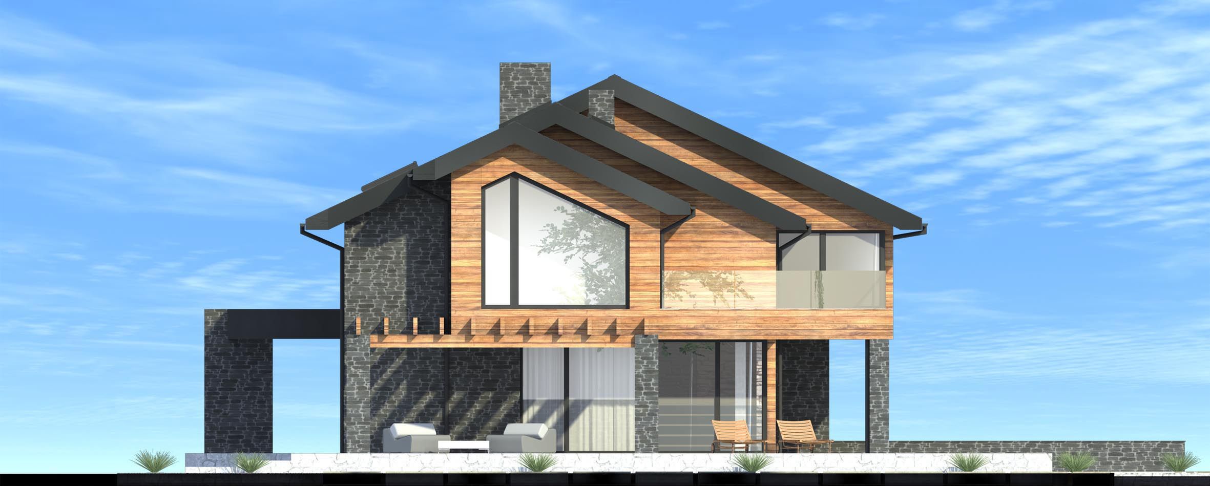 Fundamenty: tradycyjne ławy fundamentowe żelbetowe. Ściany zewn.: dwuwarstwowe – pustak ceramiczny 25 cm + styropian 20 cm / wełna mineralna 20 cm. Ściany wewn.: murowane. Strop: żelbetowy wylewany na mokro. Dach: tradycyjna więźba dachowa pokryta dachówką ceramiczna. Elewacje: tynki silikonowe, drewno, kamień naturalny. Ogrzewanie: gazowe – piec kondensacyjny. Ogrzewanie podłogowe – parter: salon, jadalnia, kuchnia, komunikacja, wiatrołap, garderoba; poddasze: łazienki, garderoby, pralnia, komunikacja. Ogrzewanie tradycyjne grzejniki – parter: gabinet, kotłownia, garaż; poddasze: sypialnie, biblioteka / pokój TV, pom. rekreacyjne / play room. Wentylacja: mechaniczna z rekuperacją.