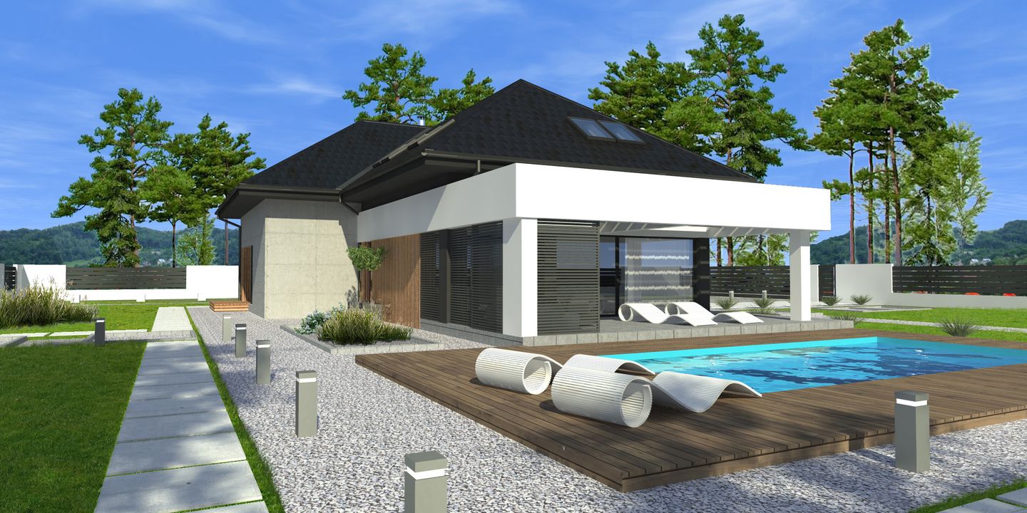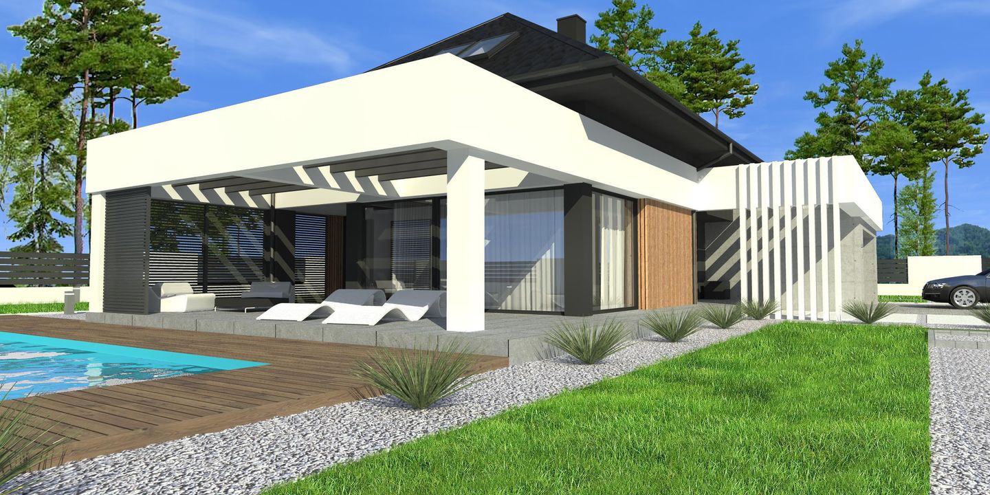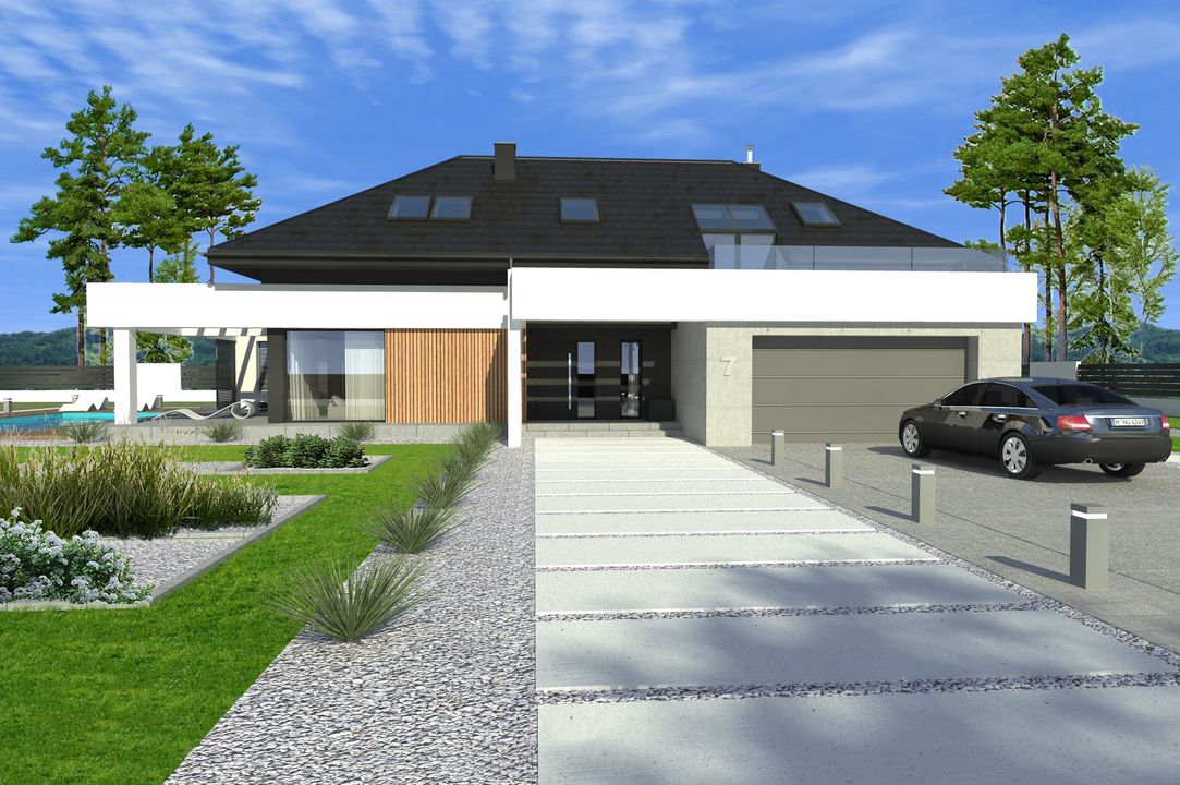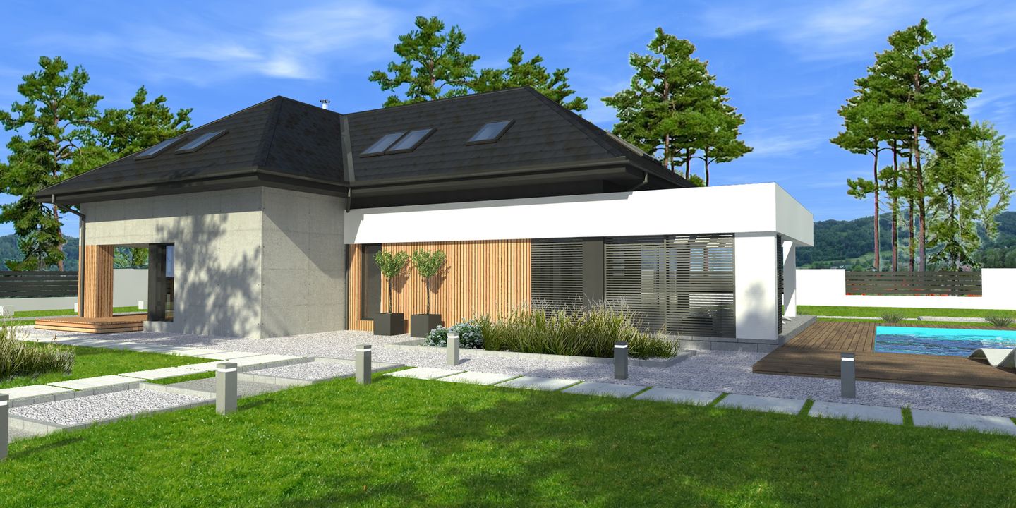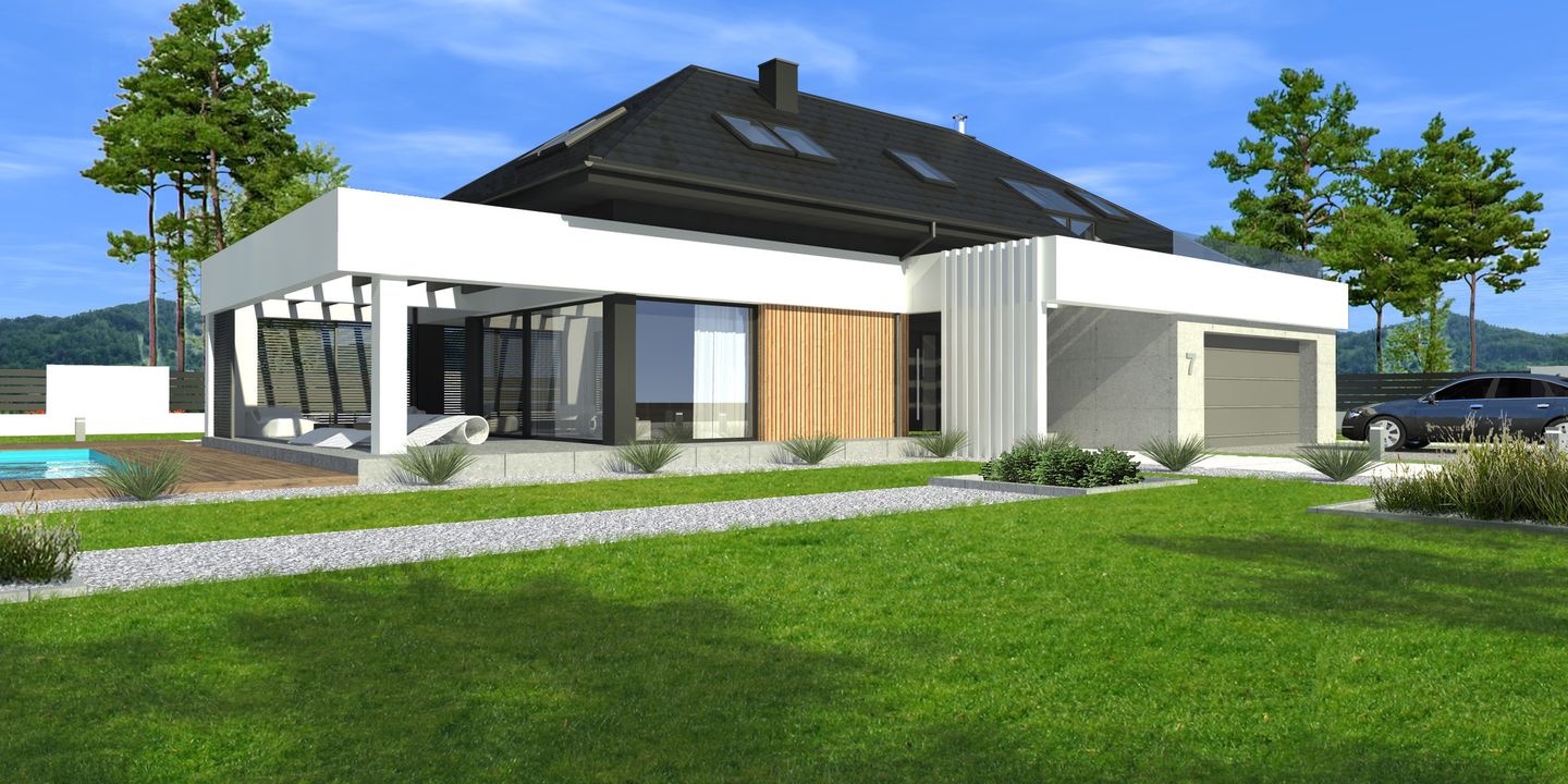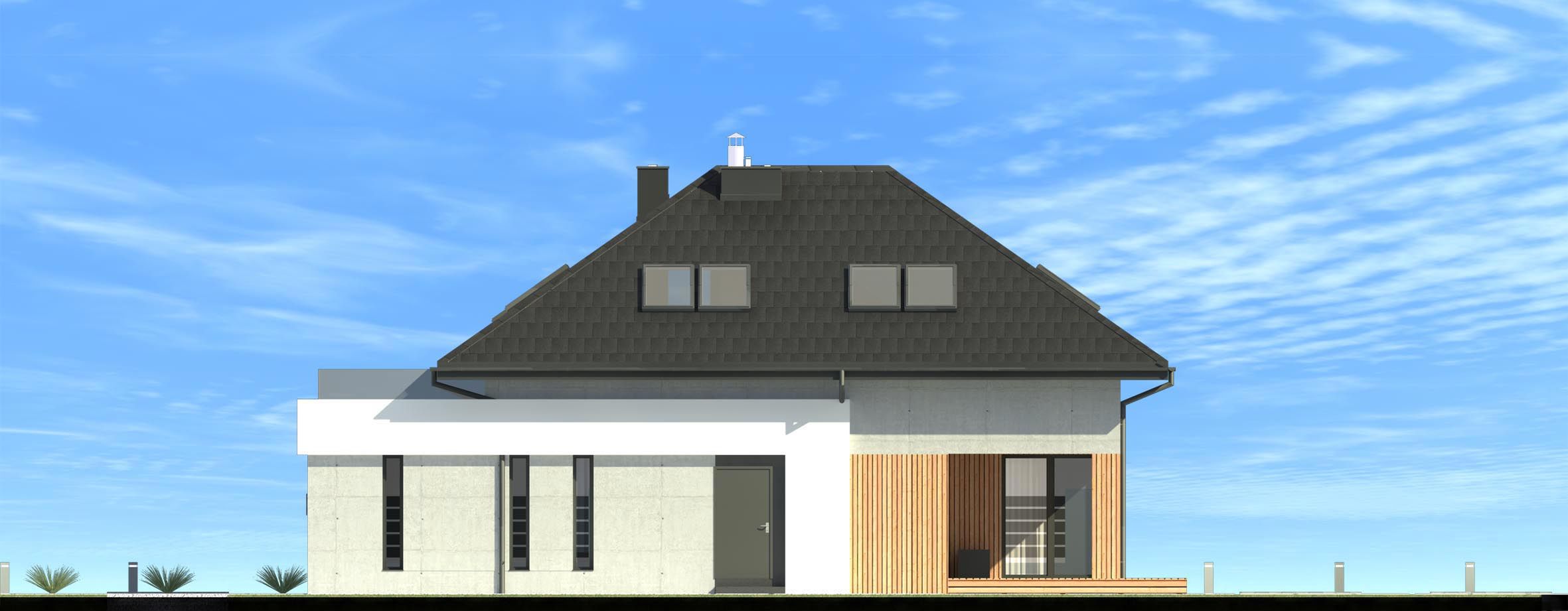 Graficzne opracowanie rzutów poglądowych widocznych na karcie projektu zostało wykonane przez Extradom.pl. Prezentowane przez Extradom.pl wizualizacje wykonane zostały przez autora projektu i należy poczytywać je jedynie za przykład i propozycję wykończenia, wizję architektoniczną autora projektu. Ostateczne wykończenie budynku może nastąpić na wiele sposobów. Szczegółowe rozwiązania zastosowane w oferowanej dokumentacji - w tym również ilość, lokalizacje i wygląd okien, drzwi, kominów - mogą w niewielkim stopniu różnić się od prezentowanej wizualizacji budynku.