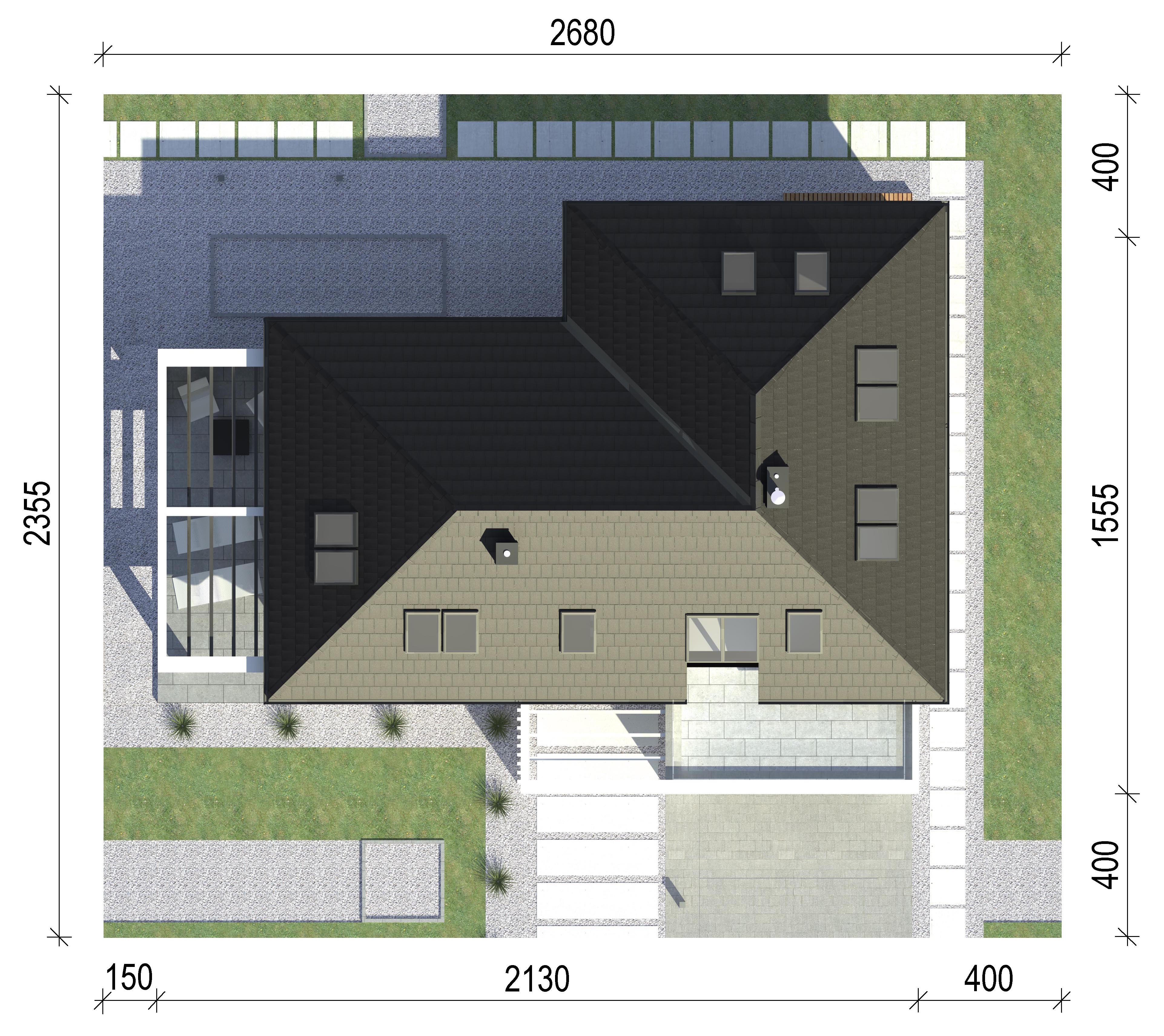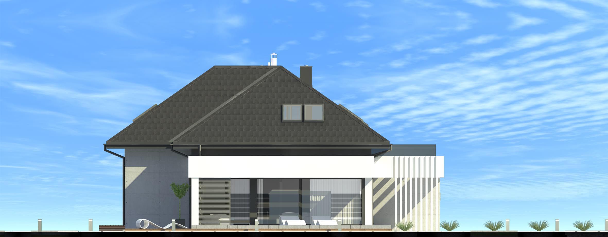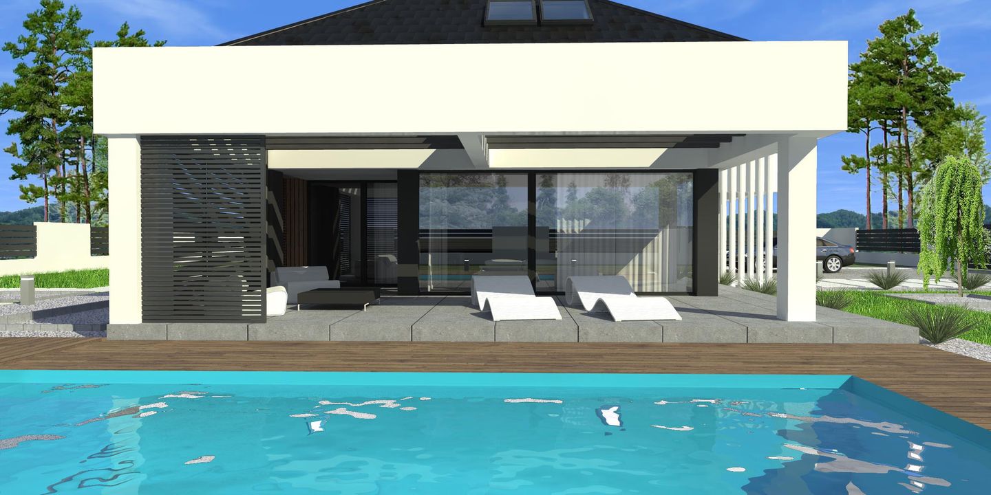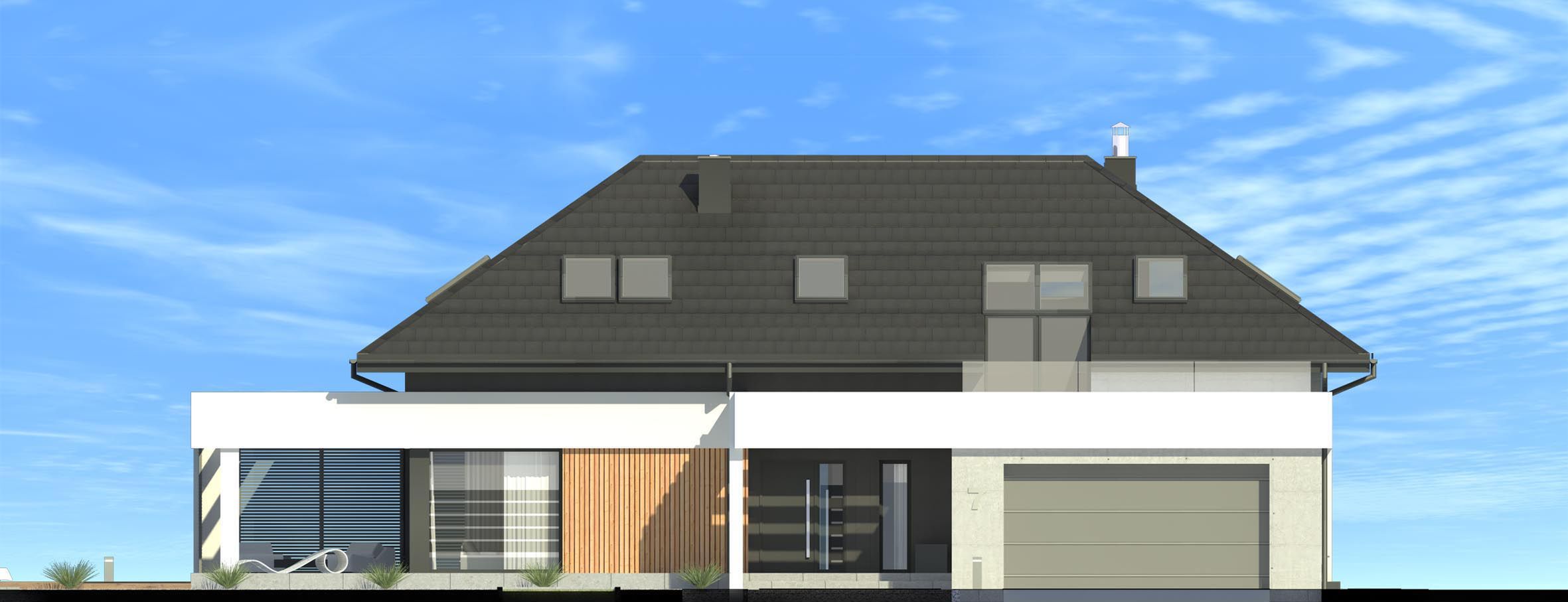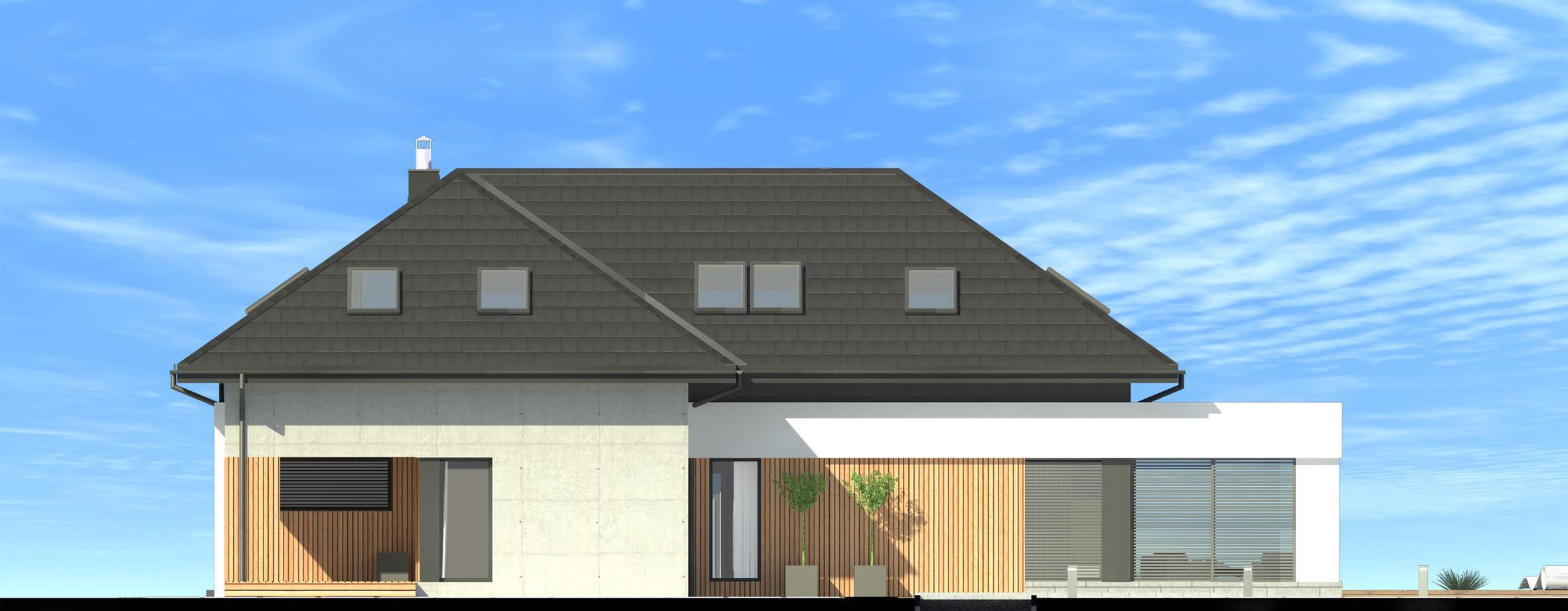 Graficzne opracowanie rzutów poglądowych widocznych na karcie projektu zostało wykonane przez Extradom.pl. Prezentowane przez Extradom.pl wizualizacje wykonane zostały przez autora projektu i należy poczytywać je jedynie za przykład i propozycję wykończenia, wizję architektoniczną autora projektu. Ostateczne wykończenie budynku może nastąpić na wiele sposobów. Szczegółowe rozwiązania zastosowane w oferowanej dokumentacji - w tym również ilość, lokalizacje i wygląd okien, drzwi, kominów - mogą w niewielkim stopniu różnić się od prezentowanej wizualizacji budynku.