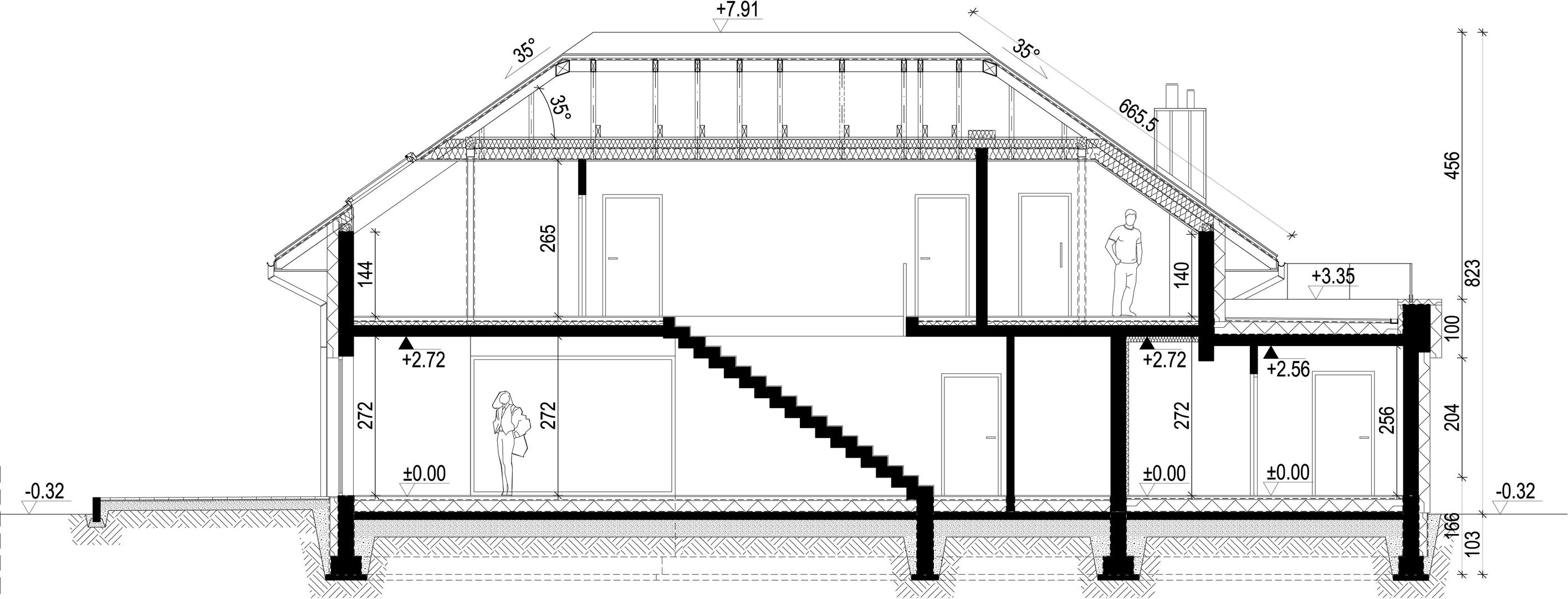 Fundamenty: tradycyjne ławy fundamentowe żelbetowe. Ściany zewn.: dwuwarstwowe – pustak ceramiczny lub bloczek silikatowy 25 cm + styropian 20 cm / wełna mineralna 18 cm. Ściany wewn.: murowane. Strop: żelbetowy wylewany na mokro. Dach: tradycyjna więźba dachowa pokryta dachówką ceramiczna. Elewacje: tynki silikonowe, drewno , łupek elewacyjny lub naturalny kamienny fornir. Ogrzewanie: gazowe – piec kondensacyjny. Ogrzewanie podłogowe w wiatrołapie, komunikacji, salonie, jadalni, kuchni, łazienkach, garderobach, i pralni. Tradycyjne grzejniki w gabinecie, sypialniach, garażu i kotłowni. Wentylacja: mechaniczna z rekuperacją.