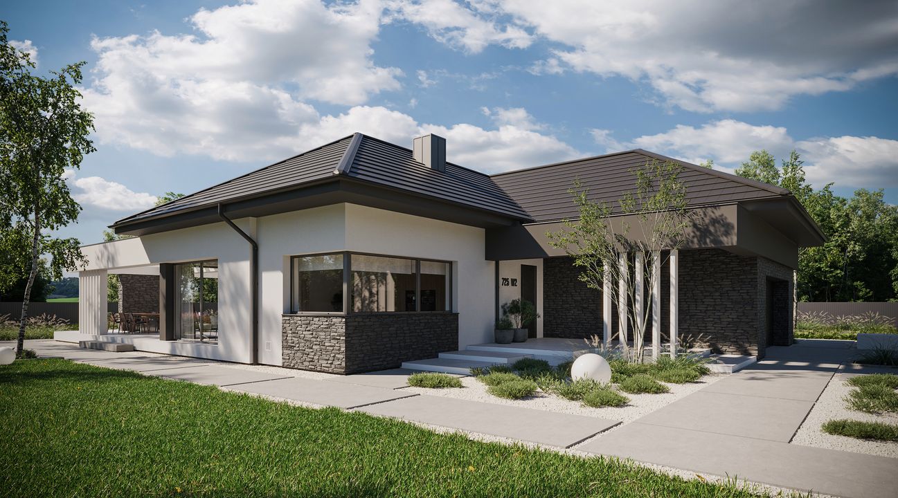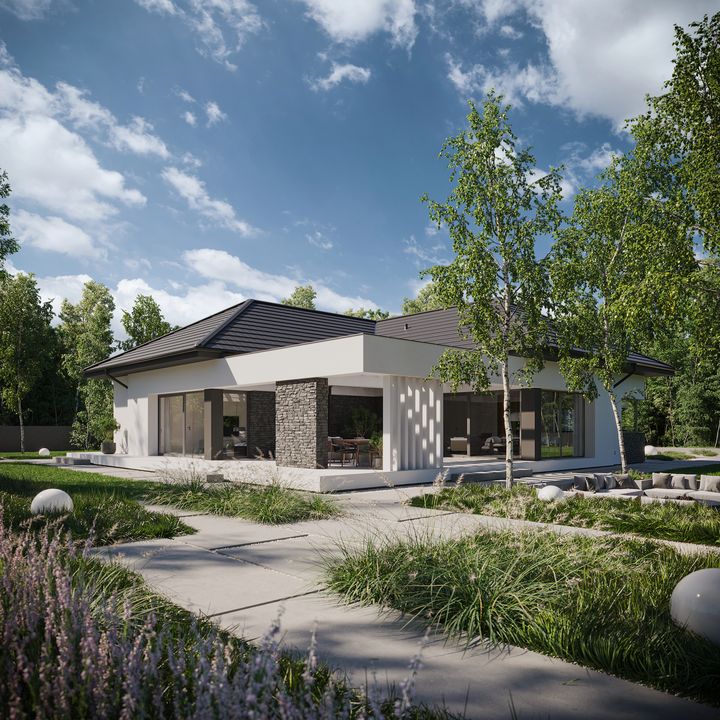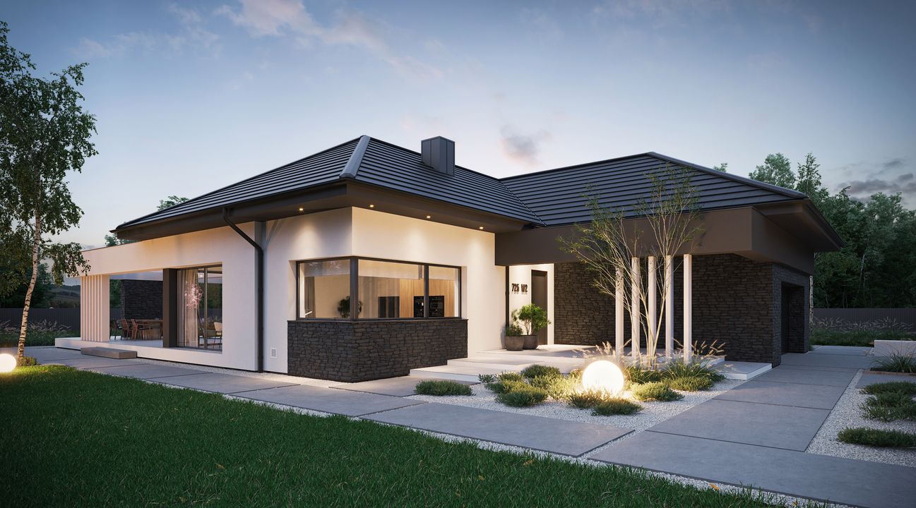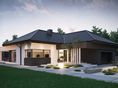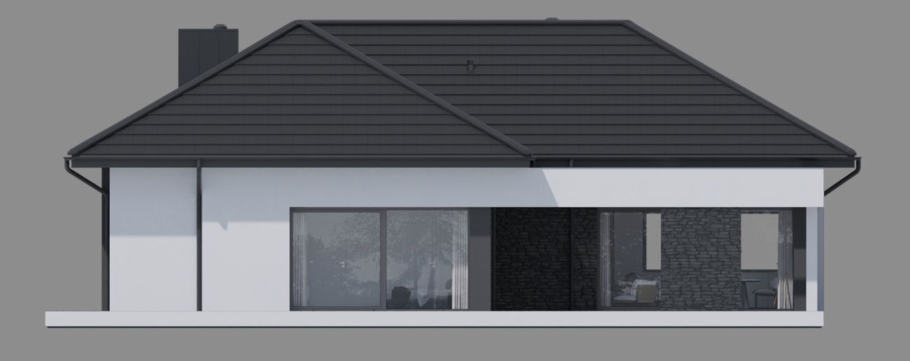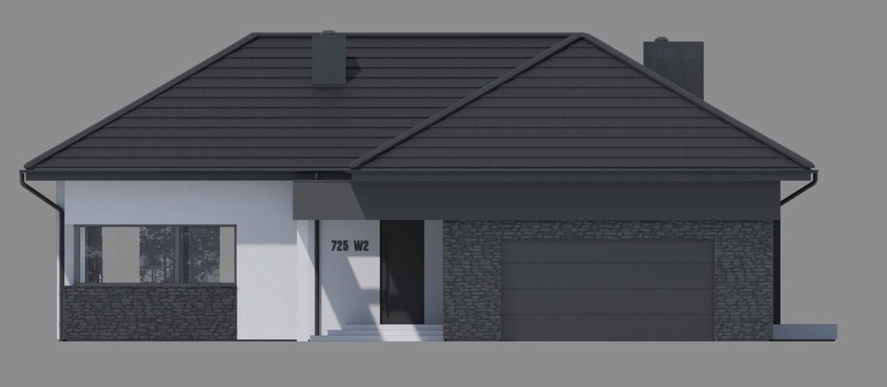 Graficzne opracowanie rzutów poglądowych widocznych na karcie projektu zostało wykonane przez Extradom.pl. Prezentowane przez Extradom.pl wizualizacje wykonane zostały przez autora projektu i należy poczytywać je jedynie za przykład i propozycję wykończenia, wizję architektoniczną autora projektu. Ostateczne wykończenie budynku może nastąpić na wiele sposobów. Szczegółowe rozwiązania zastosowane w oferowanej dokumentacji - w tym również ilość, lokalizacje i wygląd okien, drzwi, kominów - mogą w niewielkim stopniu różnić się od prezentowanej wizualizacji budynku.