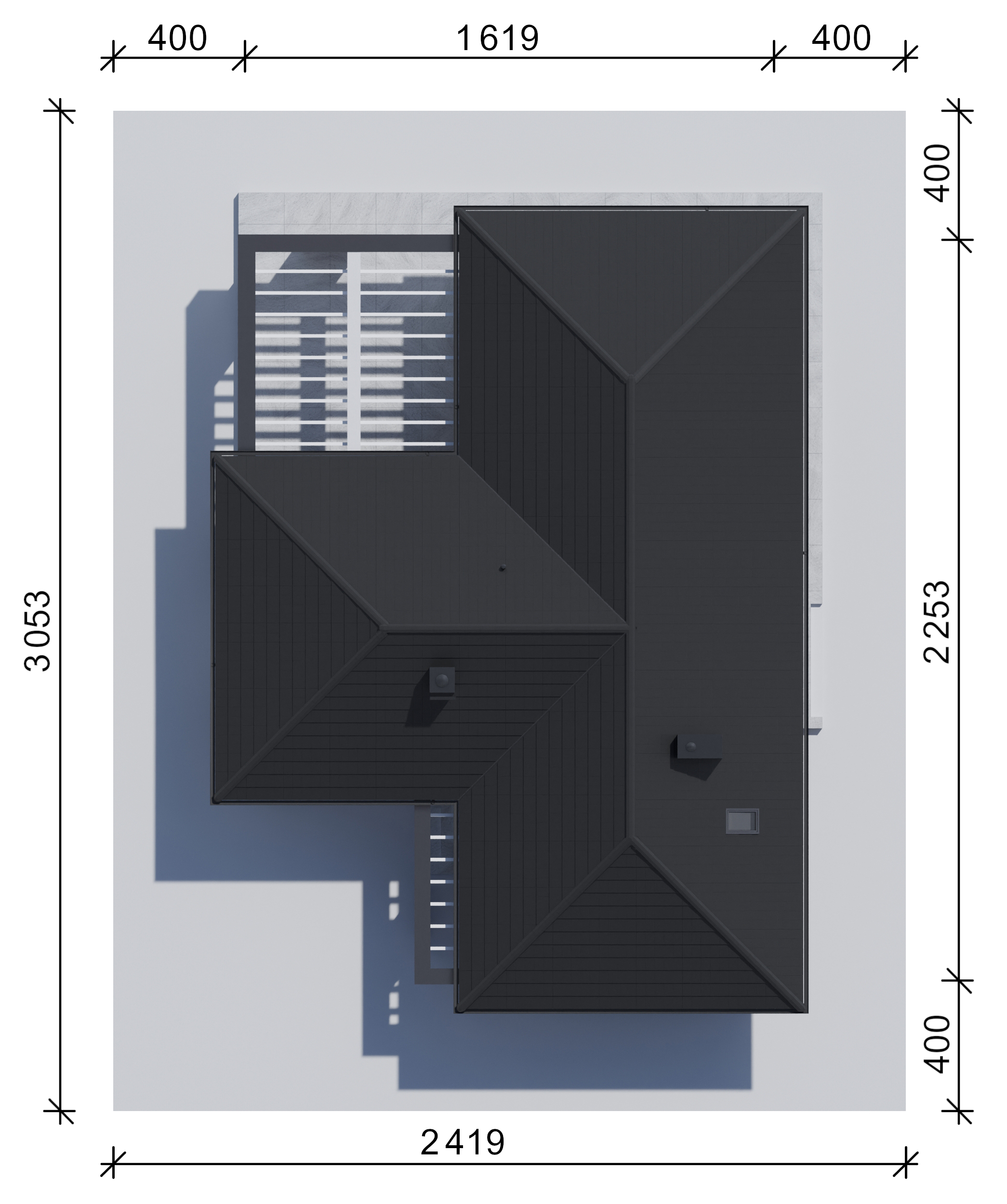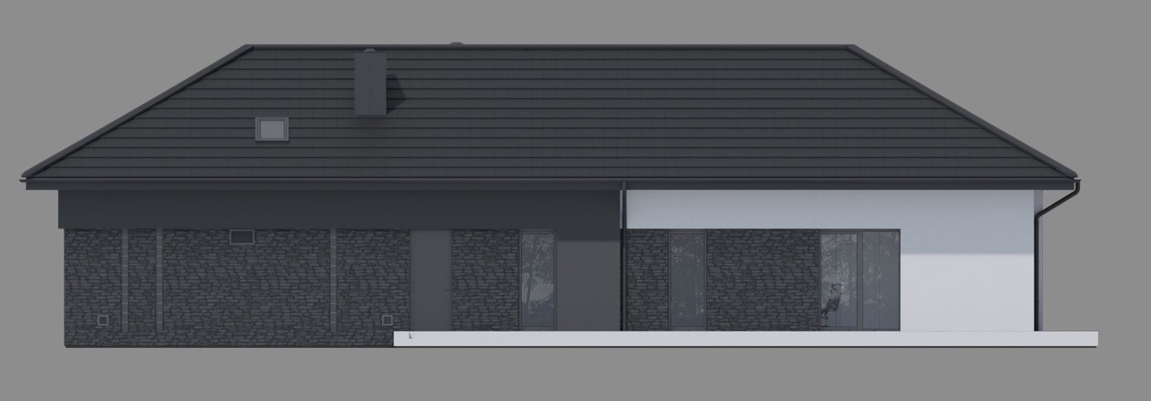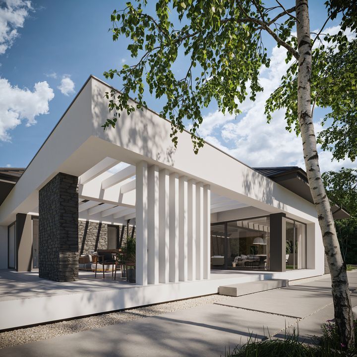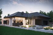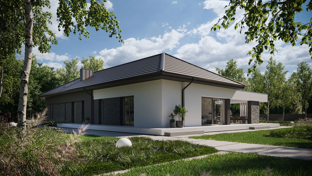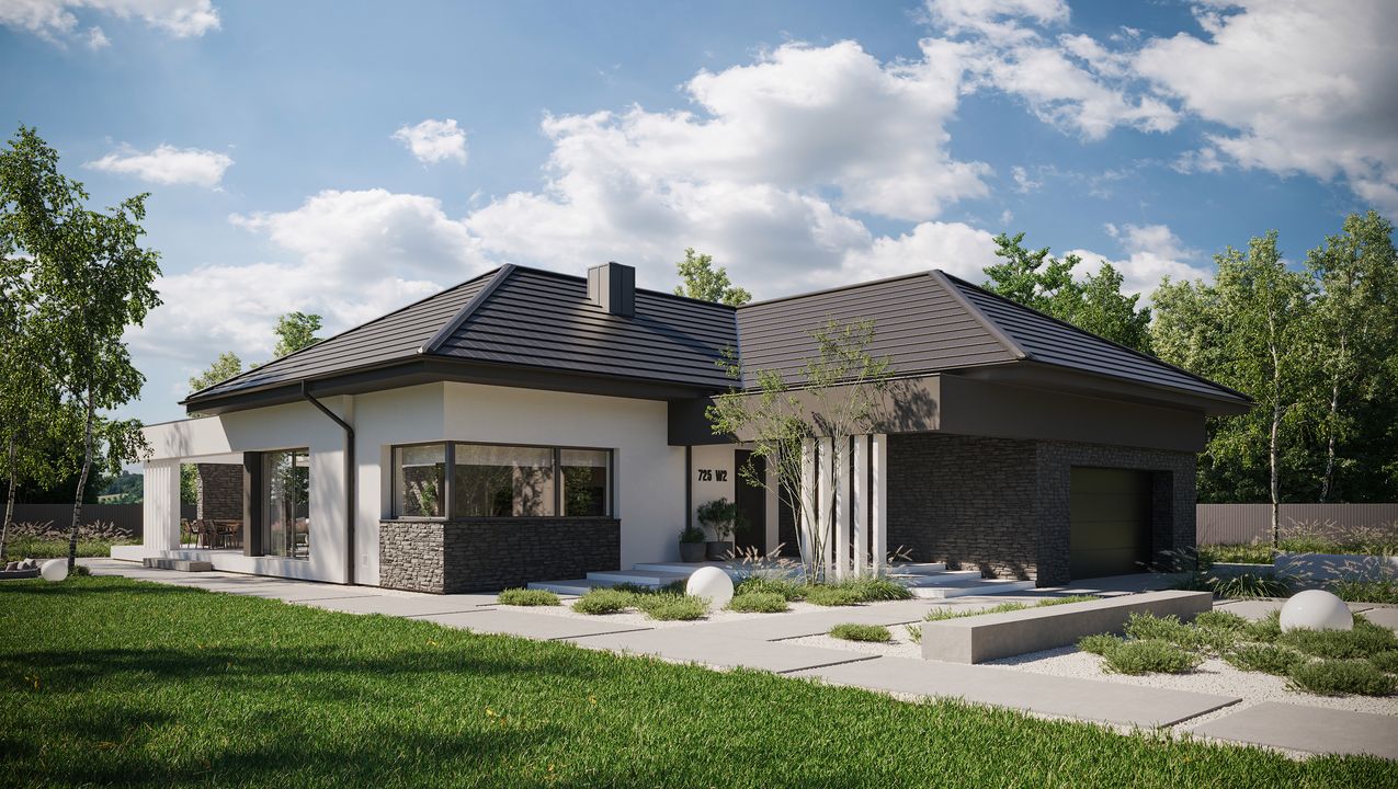 Graficzne opracowanie rzutów poglądowych widocznych na karcie projektu zostało wykonane przez Extradom.pl. Prezentowane przez Extradom.pl wizualizacje wykonane zostały przez autora projektu i należy poczytywać je jedynie za przykład i propozycję wykończenia, wizję architektoniczną autora projektu. Ostateczne wykończenie budynku może nastąpić na wiele sposobów. Szczegółowe rozwiązania zastosowane w oferowanej dokumentacji - w tym również ilość, lokalizacje i wygląd okien, drzwi, kominów - mogą w niewielkim stopniu różnić się od prezentowanej wizualizacji budynku.