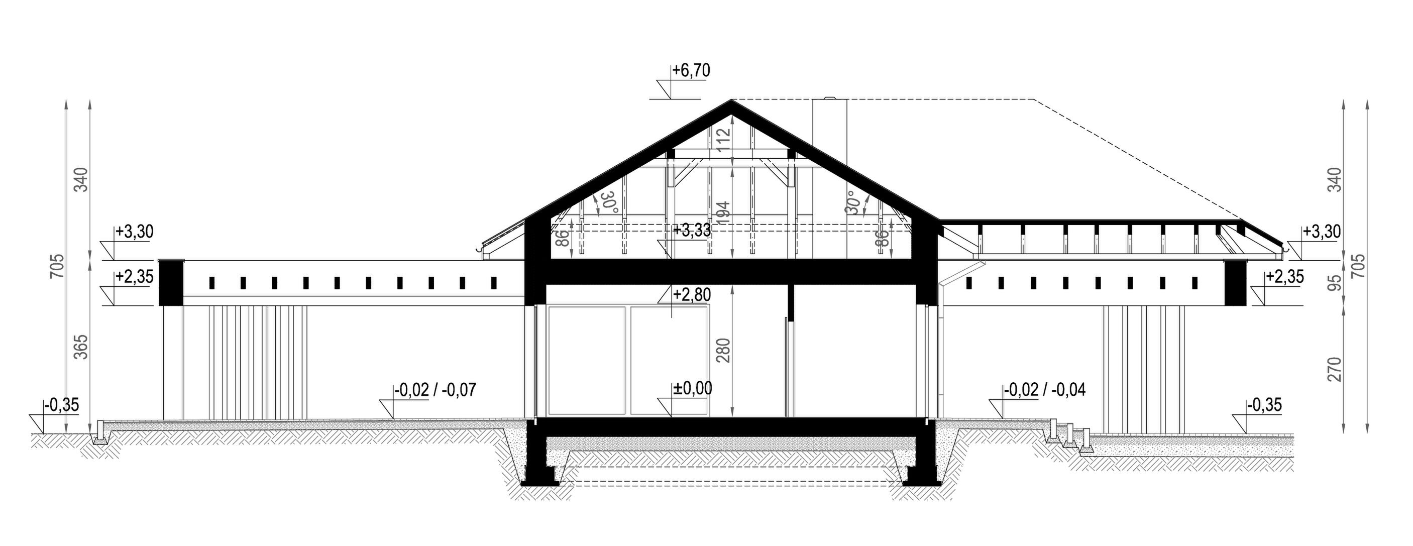 Fundamenty tradycyjne - na ławach fundamentowych Ściany dwuwarstwowe pustak ceramiczny 25 cm + styropian 20/18 cm GARAŻ- pustak ceramiczny 25 cm +styropian 15 cm Strop żelbetowy wylewany Dach tradycyjna więźba dachowa pokryta dachówką ceramiczną Elewacja Tynk silikonowy w kolorze białym i grafitowym połączony z kamieniem naturalnym w kolorze grafitowym