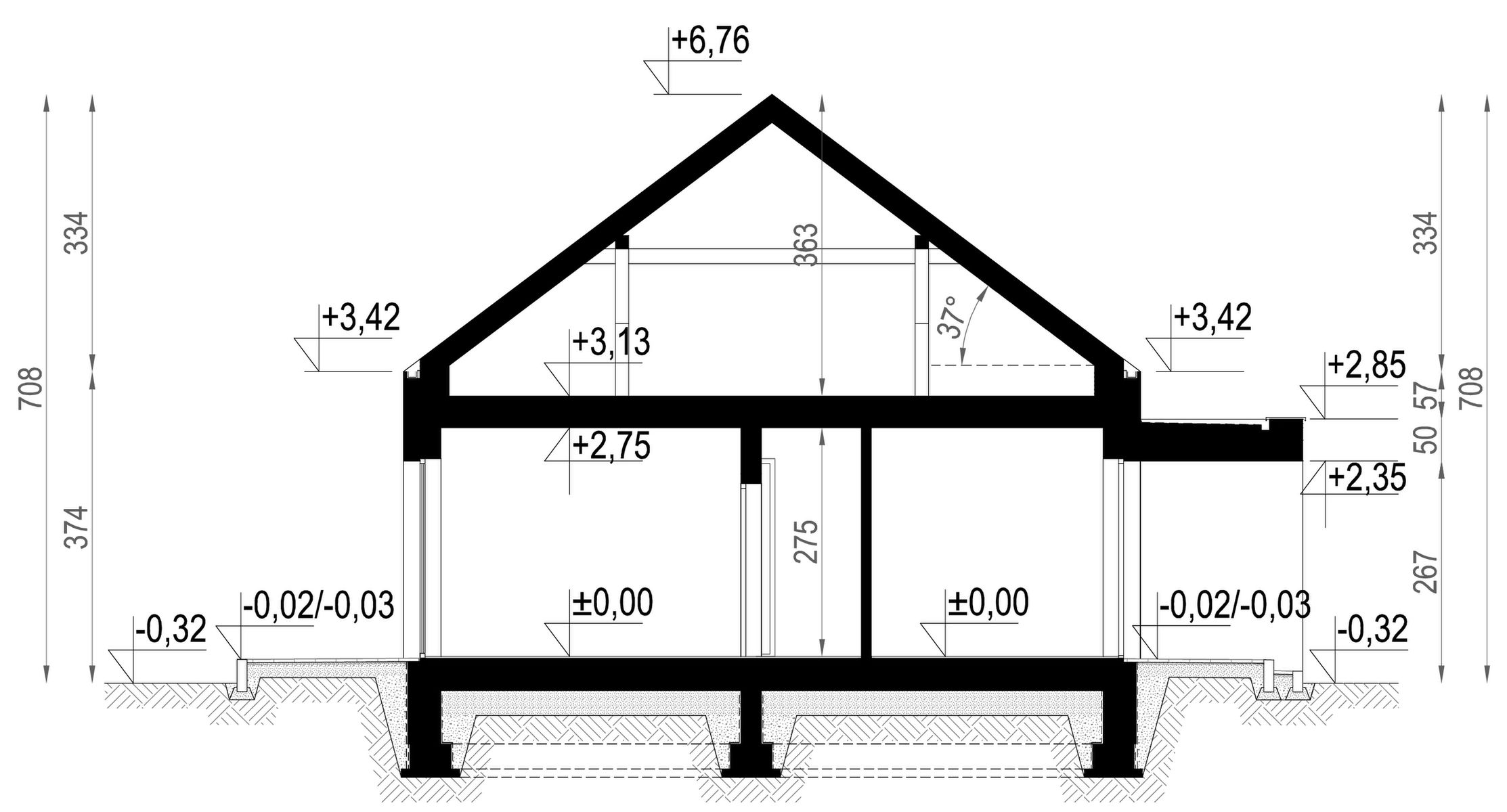 Fundamenty: Tradycyjnie - na ławach fundamentowych; Ściany: Dwuwarstwowe pustak ceramiczny 25 cm + styropian 20 cm / wełna mineralna 16 cm; Strop: Żelbetowy, wylewany; Dach: Dwuspadowy, kryty blachą na rąbek stojący. System odwodnienia dachu Galceo; Elewacja: Tynk silikonowy w kolorze białym, drewno elewacyjne lub lamele elewacyjne;