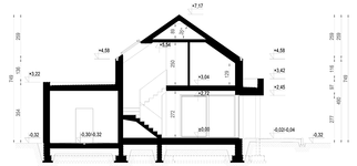 Fundamenty: tradycyjne - na ławach fundamentowych. Ściany: dwuwarstwowe pustak ceramiczny 25 cm + styropian 20 cm / wełna mienralna 16 cm. Strop: żelbetowy wylewany. Dach: tradycyjna więźba dachowa pokryta dachówką ceramiczną. Elewacja: tynk w kolorze białym i grafitowym, połączony z drewnem elewacyjnym. Ogrzewanie: gazowe- piec kondensacyjny, ogrzewanie podłogowe w salonie, kuchni, jadalni, łazienkach, garderobach, wiatrołapie i w części komunikacyjnej, w pozostałych pomieszczeniach tradycyjne grzejniki oraz grzejniki kanałowe. Wentylacja: mechaniczna z rekuperacją.