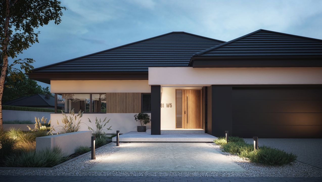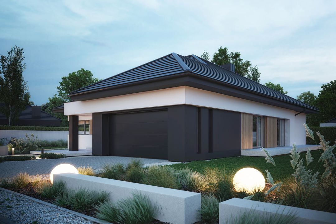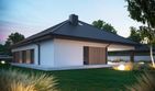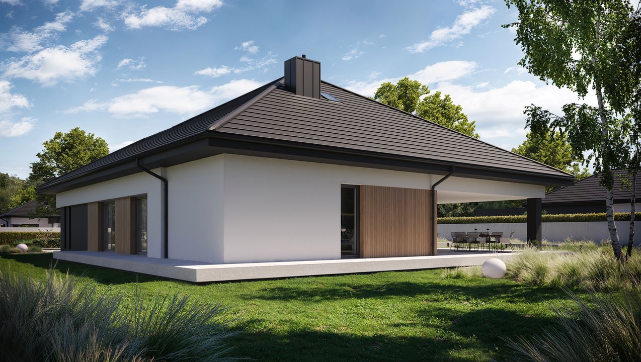 Graficzne opracowanie rzutów poglądowych widocznych na karcie projektu zostało wykonane przez Extradom.pl. Prezentowane przez Extradom.pl wizualizacje wykonane zostały przez autora projektu i należy poczytywać je jedynie za przykład i propozycję wykończenia, wizję architektoniczną autora projektu. Ostateczne wykończenie budynku może nastąpić na wiele sposobów. Szczegółowe rozwiązania zastosowane w oferowanej dokumentacji - w tym również ilość, lokalizacje i wygląd okien, drzwi, kominów - mogą w niewielkim stopniu różnić się od prezentowanej wizualizacji budynku.
