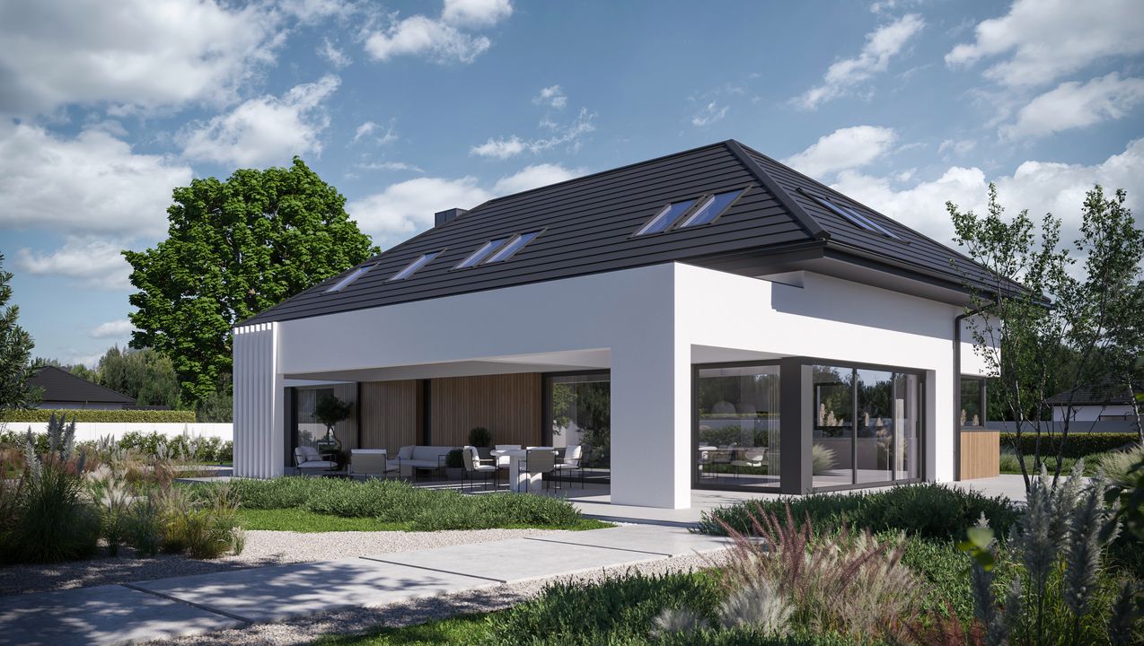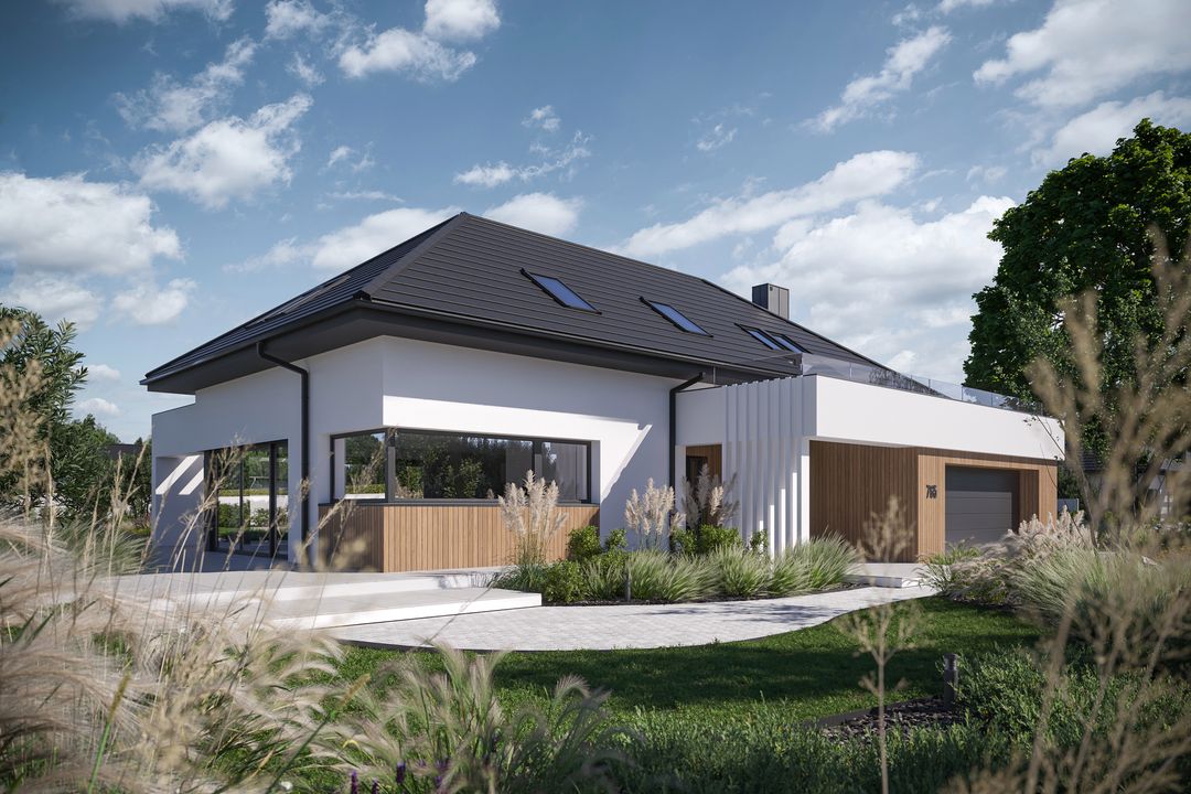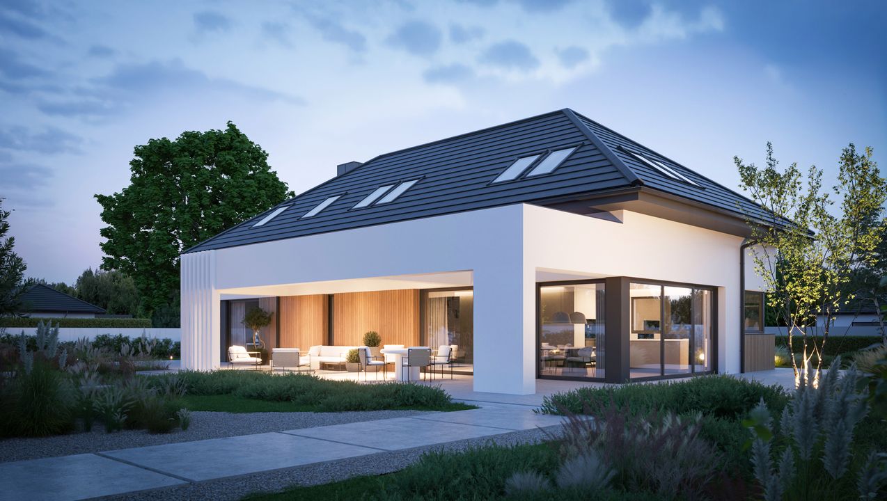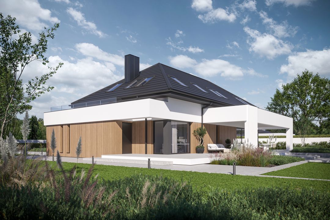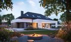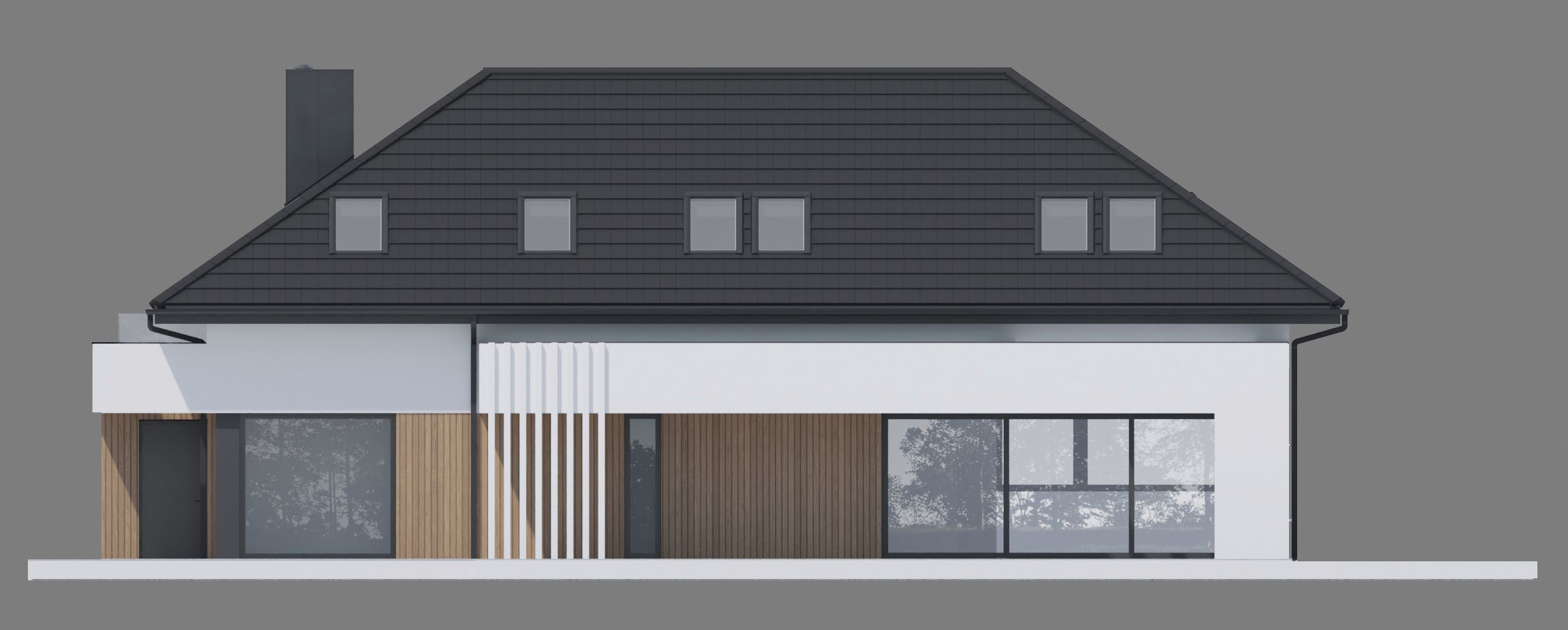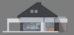 Graficzne opracowanie rzutów poglądowych widocznych na karcie projektu zostało wykonane przez Extradom.pl. Prezentowane przez Extradom.pl wizualizacje wykonane zostały przez autora projektu i należy poczytywać je jedynie za przykład i propozycję wykończenia, wizję architektoniczną autora projektu. Ostateczne wykończenie budynku może nastąpić na wiele sposobów. Szczegółowe rozwiązania zastosowane w oferowanej dokumentacji - w tym również ilość, lokalizacje i wygląd okien, drzwi, kominów - mogą w niewielkim stopniu różnić się od prezentowanej wizualizacji budynku.