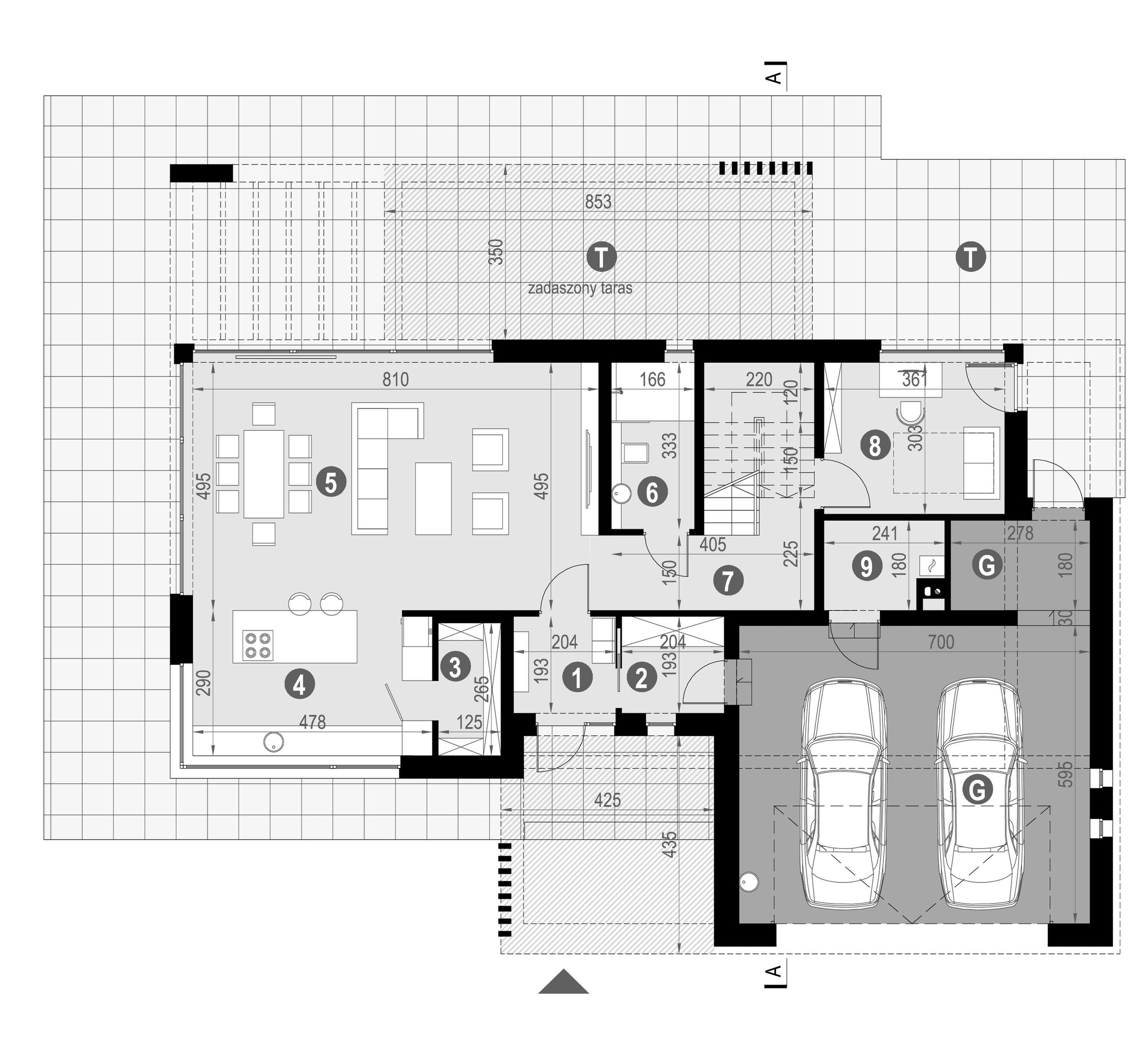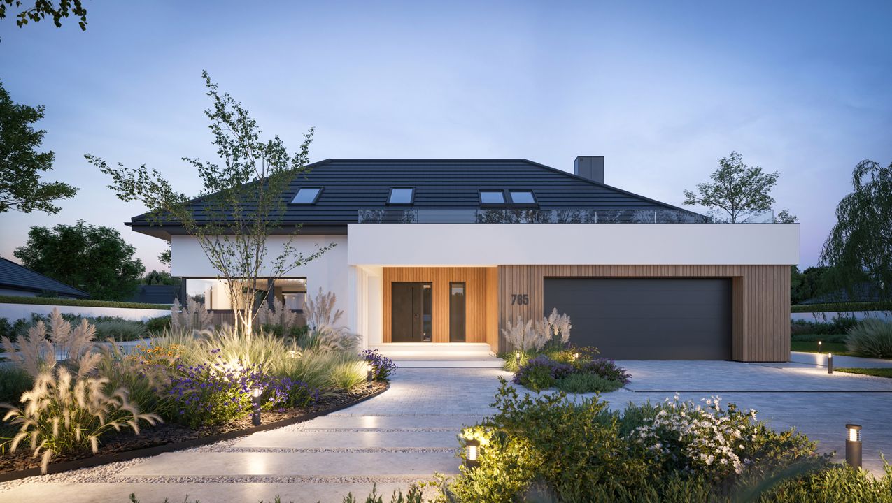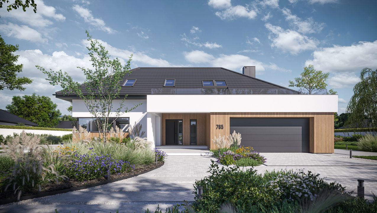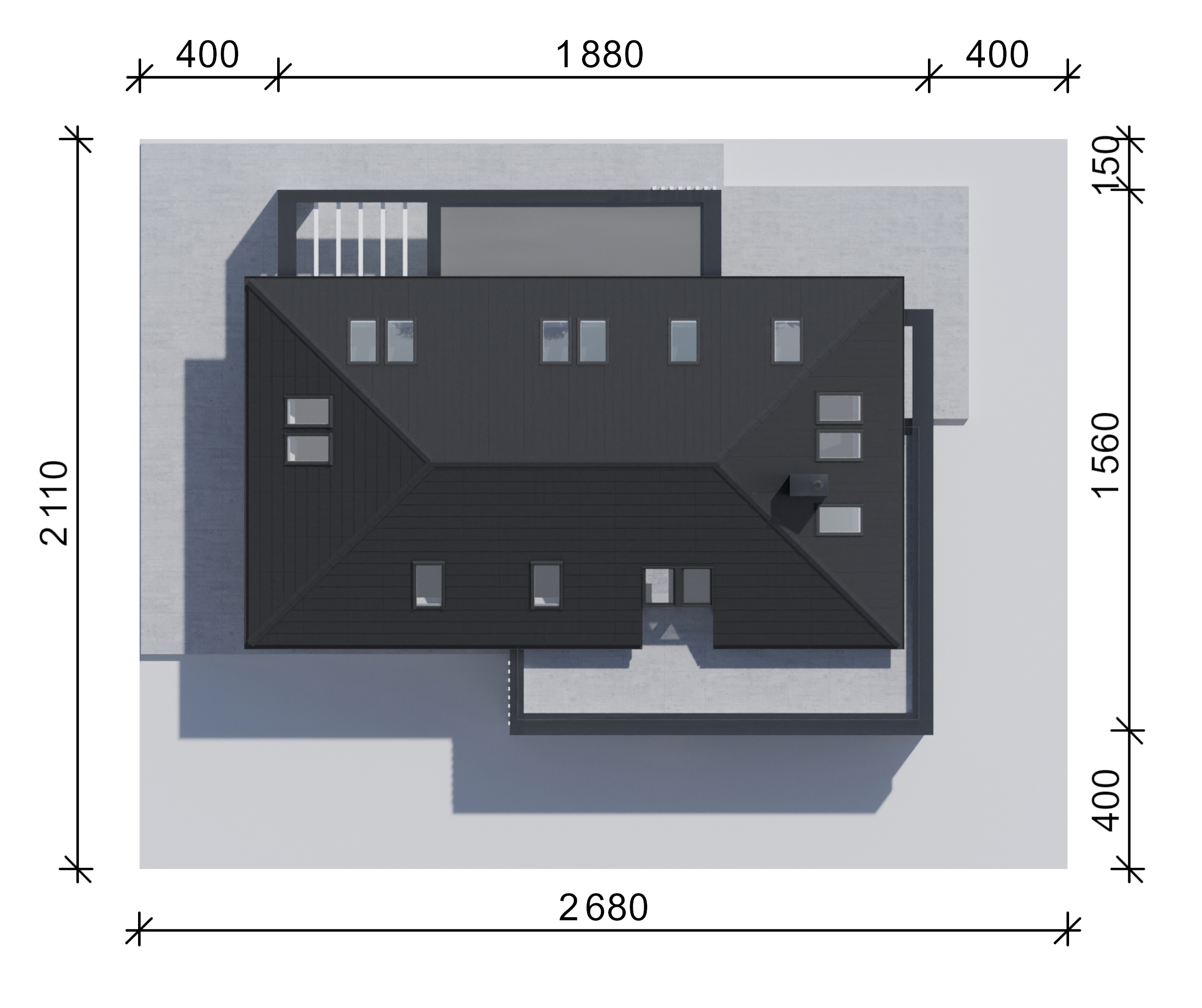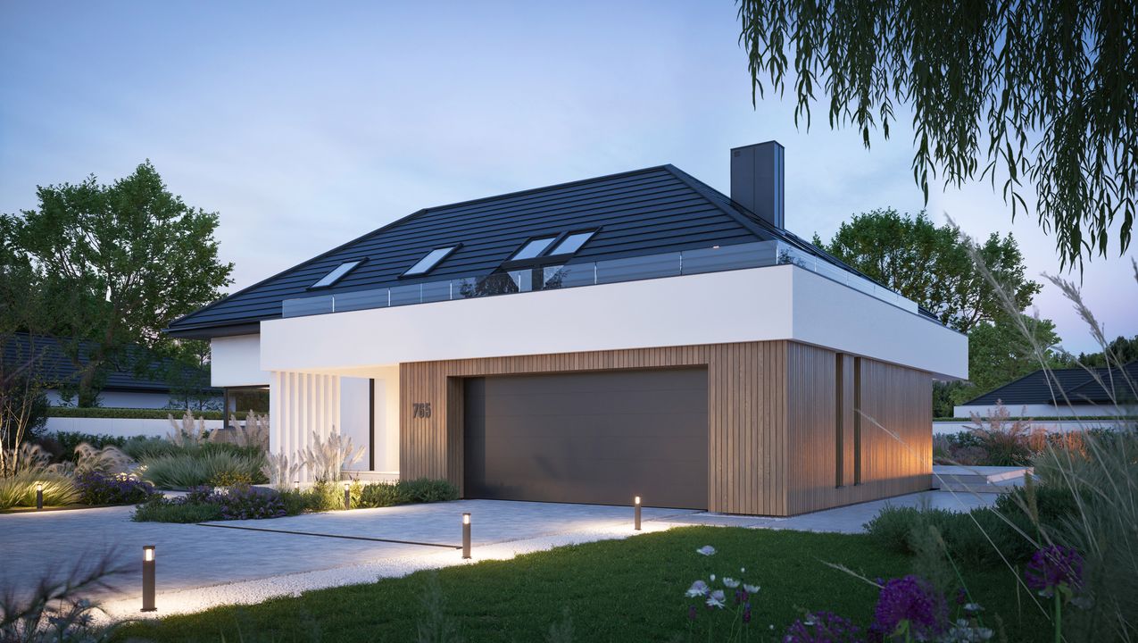 Graficzne opracowanie rzutów poglądowych widocznych na karcie projektu zostało wykonane przez Extradom.pl. Prezentowane przez Extradom.pl wizualizacje wykonane zostały przez autora projektu i należy poczytywać je jedynie za przykład i propozycję wykończenia, wizję architektoniczną autora projektu. Ostateczne wykończenie budynku może nastąpić na wiele sposobów. Szczegółowe rozwiązania zastosowane w oferowanej dokumentacji - w tym również ilość, lokalizacje i wygląd okien, drzwi, kominów - mogą w niewielkim stopniu różnić się od prezentowanej wizualizacji budynku.