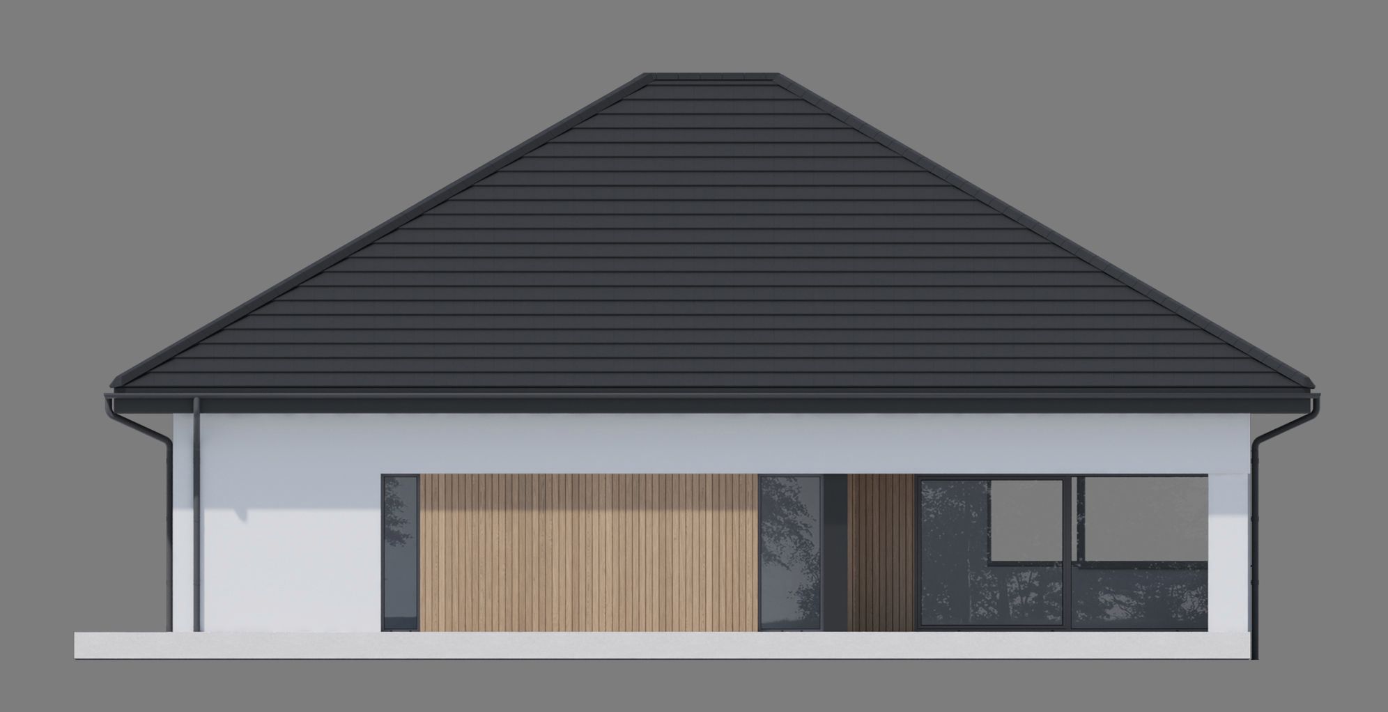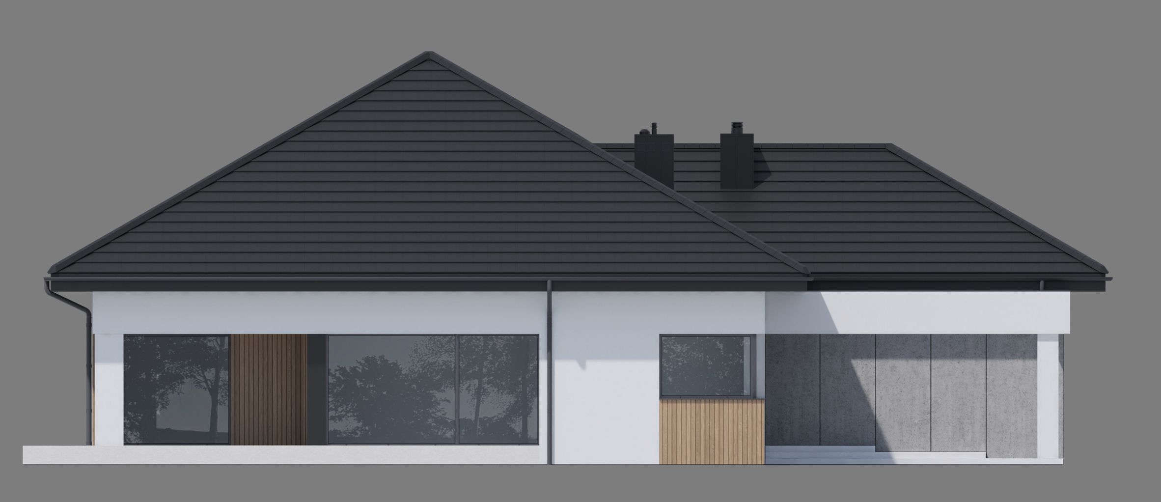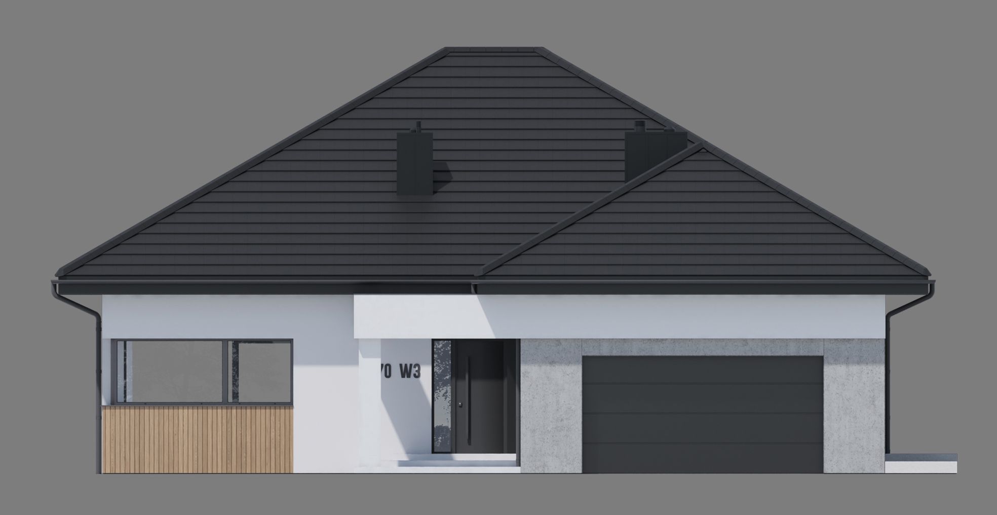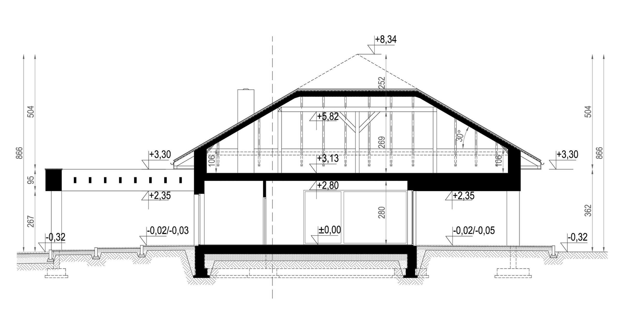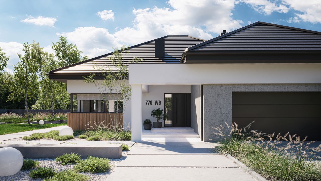 Fundamenty tradycyjne - na ławach fundamentowych; Ściany dwuwarstwowe pustak ceramiczny 25 cm + styropian 20 cm / wełna minera 16 cm Strop; żelbetowy wylewany; Dach tradycyjna więźba dachowa pokryta dachówką ceramiczną; Elewacja tynk w kolorze białym i grafitowym, połączony z drewnem elewacyjnym lub lamelami elewacyjnymi Super Premium Qulanti oraz szarym tynkiem o strukturze betonu;