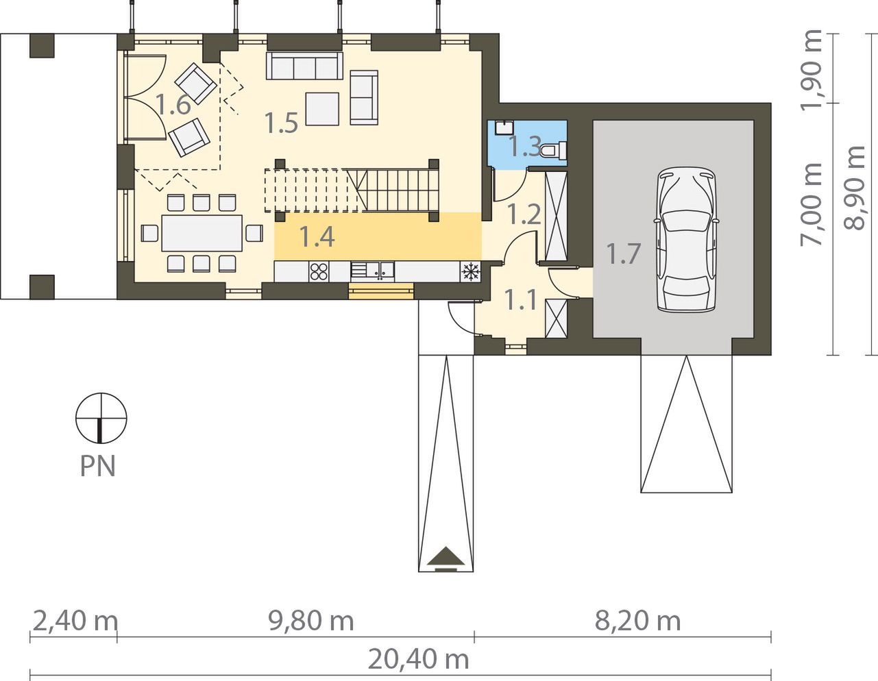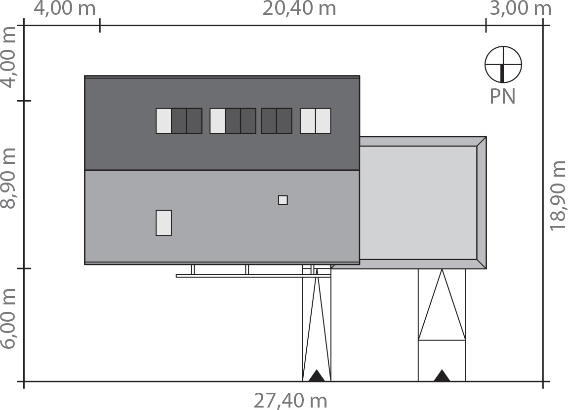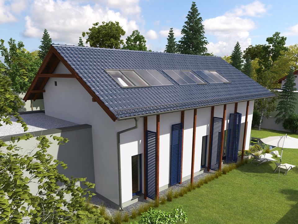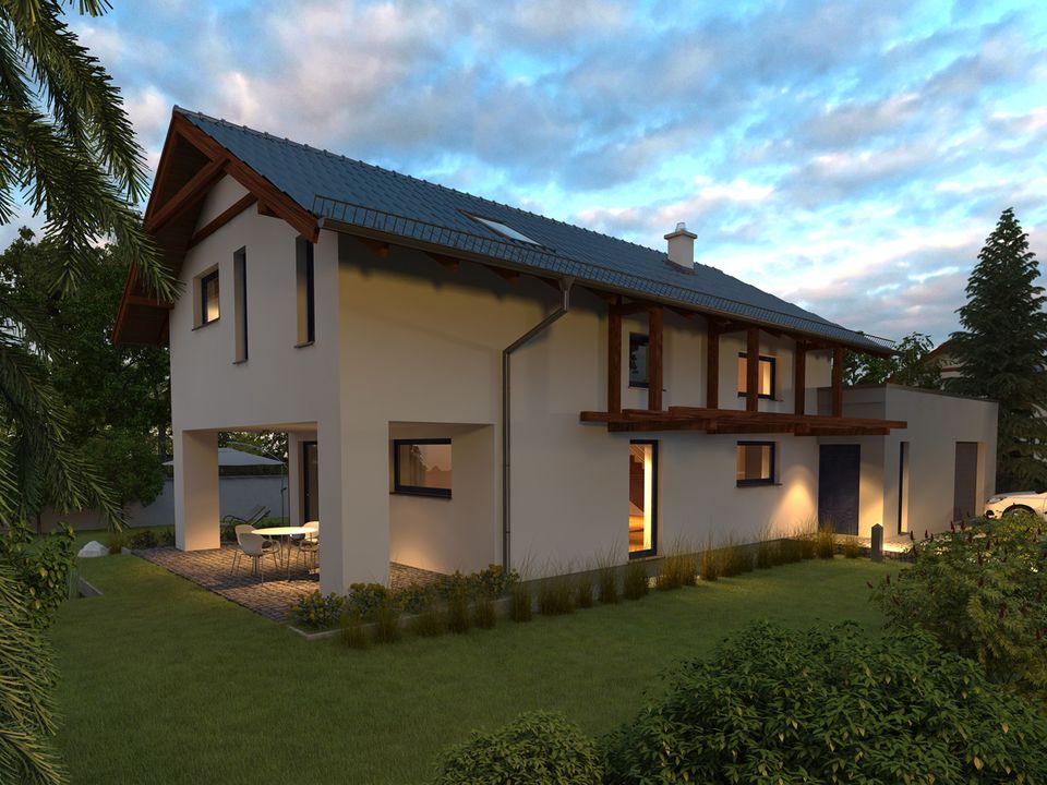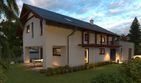 Graficzne opracowanie rzutów poglądowych widocznych na karcie projektu zostało wykonane przez Extradom.pl. Prezentowane przez Extradom.pl wizualizacje wykonane zostały przez autora projektu i należy poczytywać je jedynie za przykład i propozycję wykończenia, wizję architektoniczną autora projektu. Ostateczne wykończenie budynku może nastąpić na wiele sposobów. Szczegółowe rozwiązania zastosowane w oferowanej dokumentacji - w tym również ilość, lokalizacje i wygląd okien, drzwi, kominów - mogą w niewielkim stopniu różnić się od prezentowanej wizualizacji budynku.