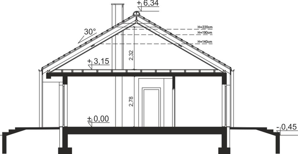 Budynek posadowiony został na fundamentach betonowych. Ściany zewnętrzne dwuwarstwowe z betonu komórkowego 24cm + 20cm styropianu. Ściany wewnętrzne z betonu komórkowego jak i z płyty gipsowo-kartonowej [na ruszcie]. Strop żelbetowy-wylewany. Więźba dachowa drewniana. Pokrycie dachu - dachówka ceramiczna lub cementowa. Wentylacja grawitacyjna + wentylacja mechaniczna z rekuperacją (do wyboru na etapie adaptacji). Ogrzewanie pompa ciepła z instalacją fotowoltaiczną + biomasa (do wyboru na etapie adaptacji projektu).