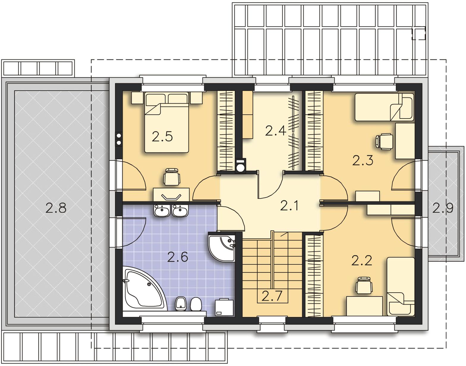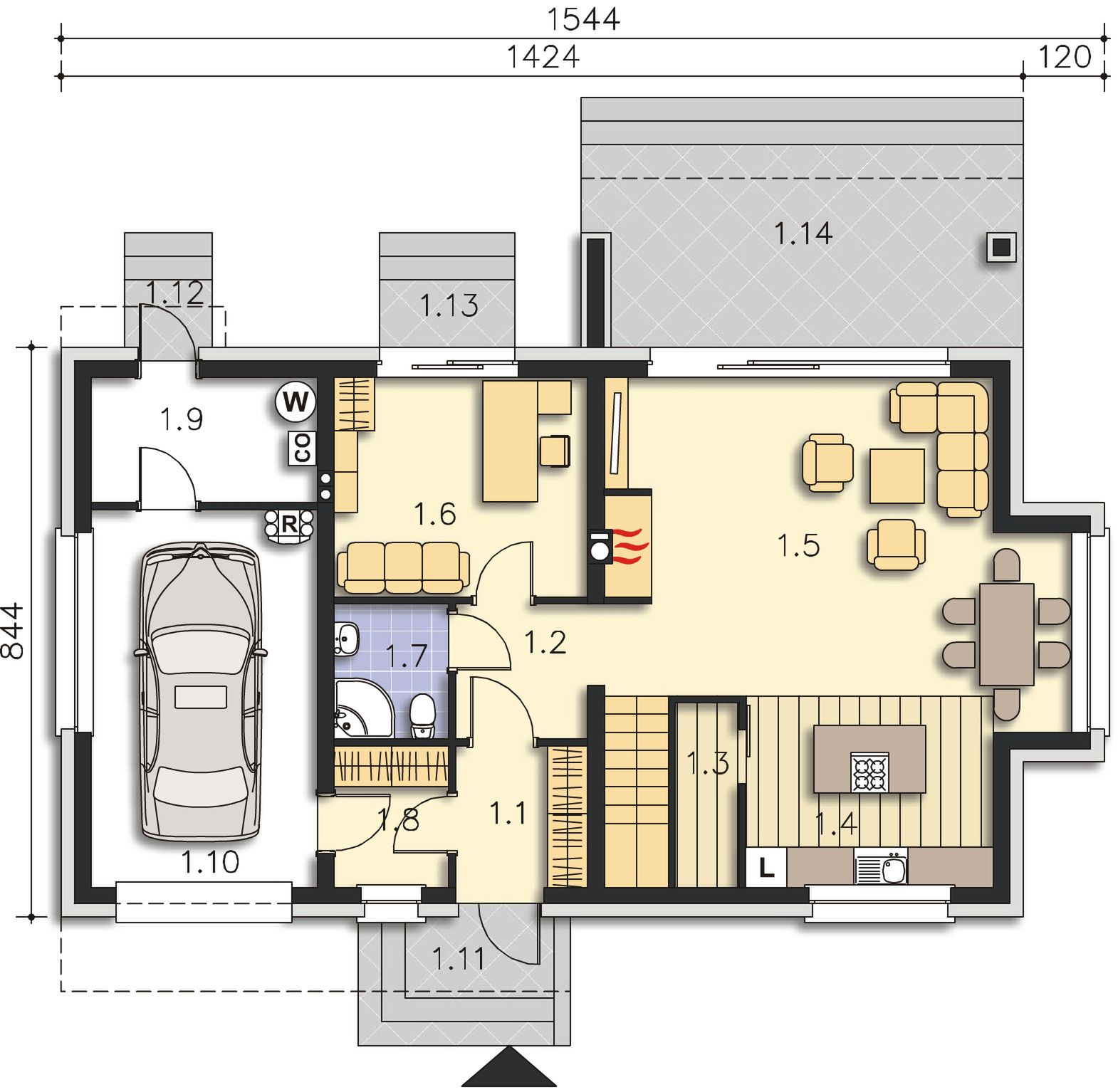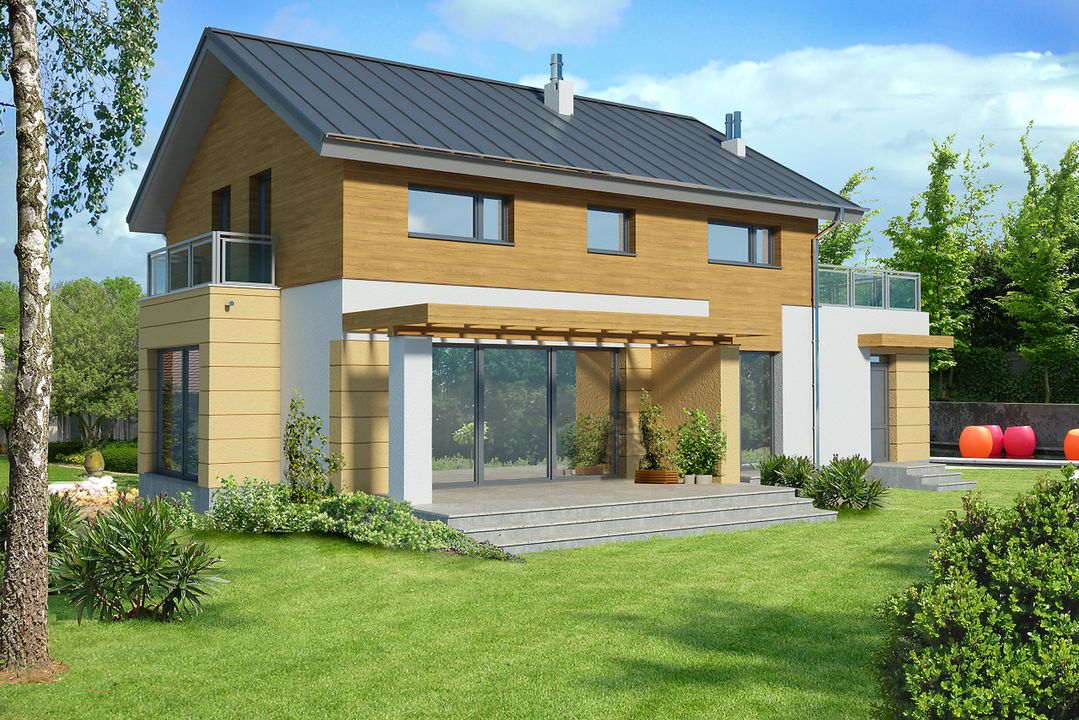 Graficzne opracowanie rzutów poglądowych widocznych na karcie projektu zostało wykonane przez Extradom.pl. Prezentowane przez Extradom.pl wizualizacje wykonane zostały przez autora projektu i należy poczytywać je jedynie za przykład i propozycję wykończenia, wizję architektoniczną autora projektu. Ostateczne wykończenie budynku może nastąpić na wiele sposobów. Szczegółowe rozwiązania zastosowane w oferowanej dokumentacji - w tym również ilość, lokalizacje i wygląd okien, drzwi, kominów - mogą w niewielkim stopniu różnić się od prezentowanej wizualizacji budynku.